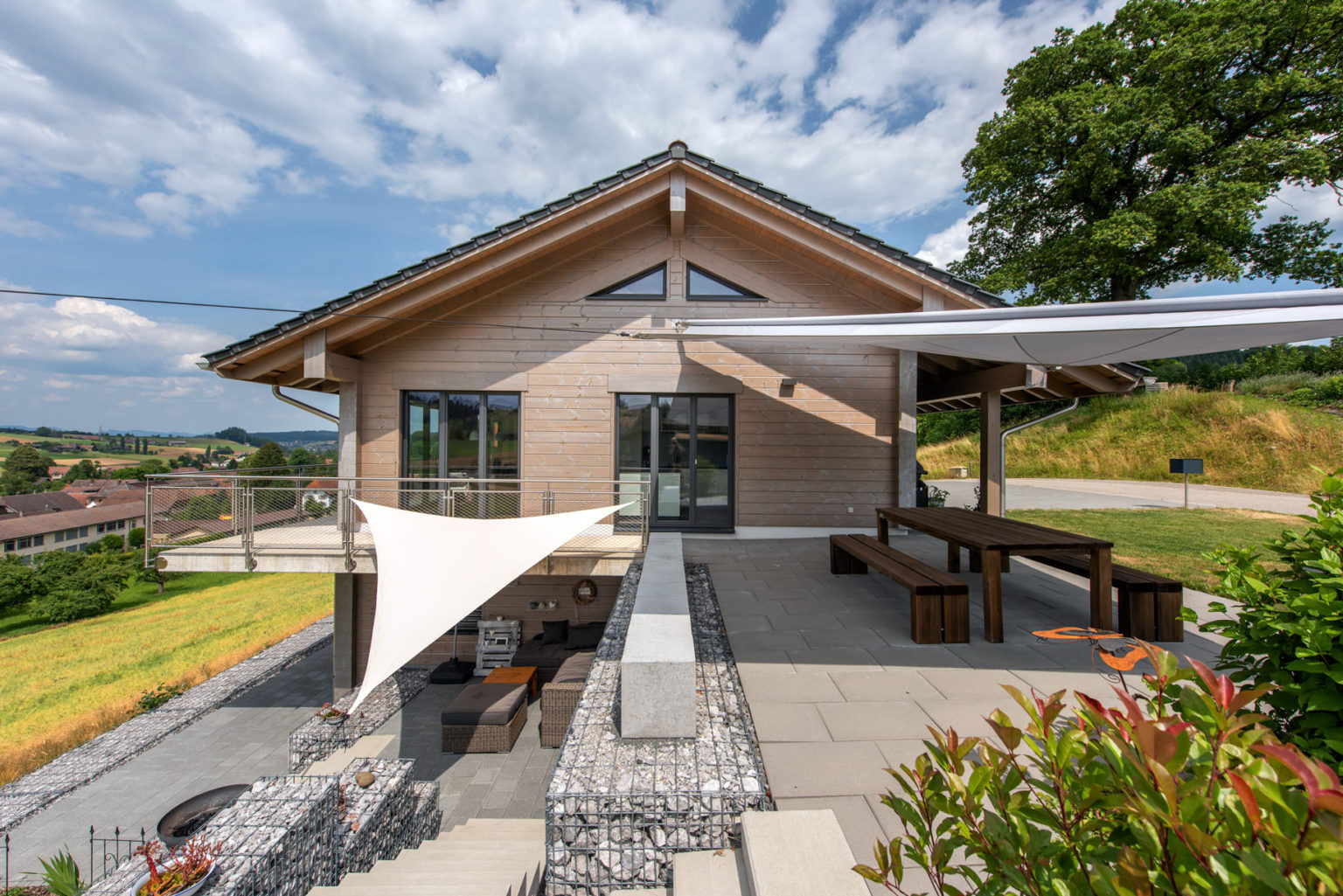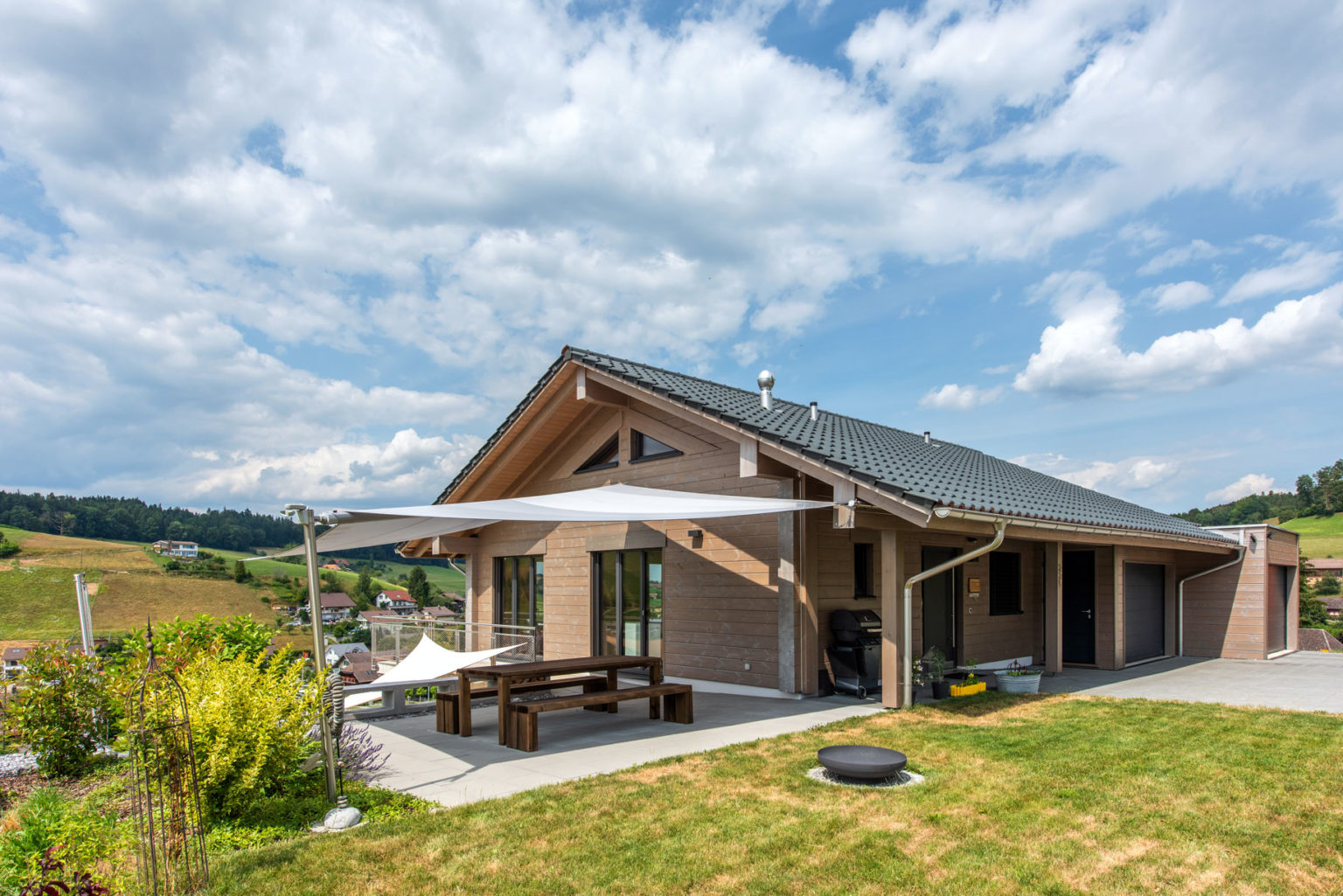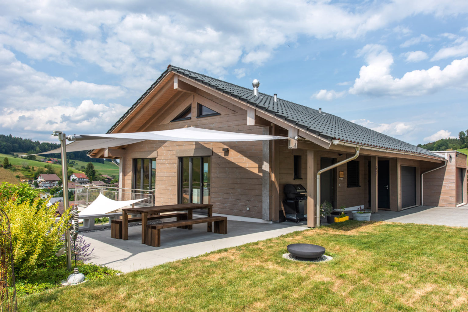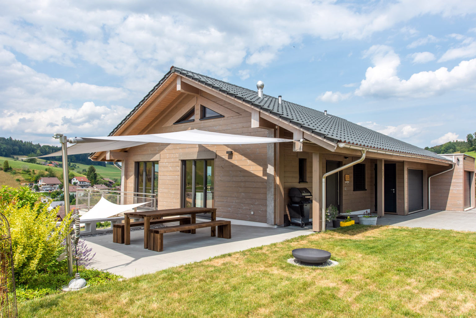 Das nachhaltig und ökologisch gebaute Holzhaus ermöglicht der Eigentümerfamilie einen kleinen ökologischen Fußabdruck, auch weil seine siebenundzwanzig Zentimeter dicken, einschaligen Wände hervorragend dämmen und sämtliche Wärme für Wasser und Fußbodenheizung mittels einer Luft/Wasser-Wärmepumpe erzeugt wird.