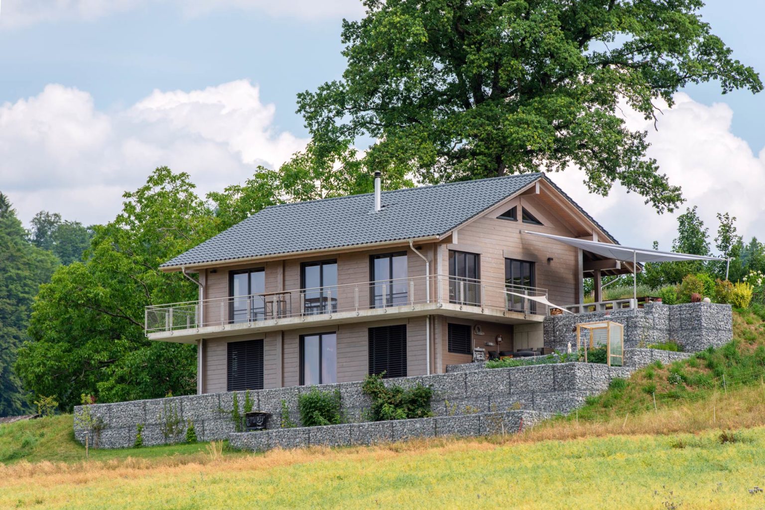 Der Hauseingang befindet sich oben an der Hangseite, man betritt also zuerst das Obergeschoss. Hier befinden sich auf gut 80m² (plus Balkon/ Terrasse) der Eingangsbereich und Flur, der offene Wohnbereich mit Sofalandschaft, Esszimmer und Küche, ein Gästezimmer und ein weiteres Zimmer. Vom Flur führt eine Treppe hinab in den privaten Bereich (gut 74m²), wo sich zwei Bäder, eine Waschküche, ein Abstellraum und drei Schlafzimmer befinden. Das Obergeschoss steht somit Familie und Gästen zur Verfügung, während sich die Hausbewohner im Erdgeschoss in ihre eigenen Zimmer zurückziehen können. Außer in den Bädern sind alle Fußböden mit fußwarmem Eichenparkett belegt, dessen dunkle Farbe einen schönen Kontrast zu den sehr hellen Kiefernwänden darstellt. Außen sind die Holzwände in einem lichten Grau lasiert, das die Maserung durchscheinen lässt und die natürliche Vergrauung vorwegnimmt. Passend zu der Holzlasur wurden Tondachziegel in anthrazit gewählt und Holz/Alu-Fensterrahmen in identischer Farbe. Zusammen mit der hellgrauen Außenpflasterung der Terrassen gibt Holzhaus „Oberaargau“ ein modernes, geradliniges Bild ab.