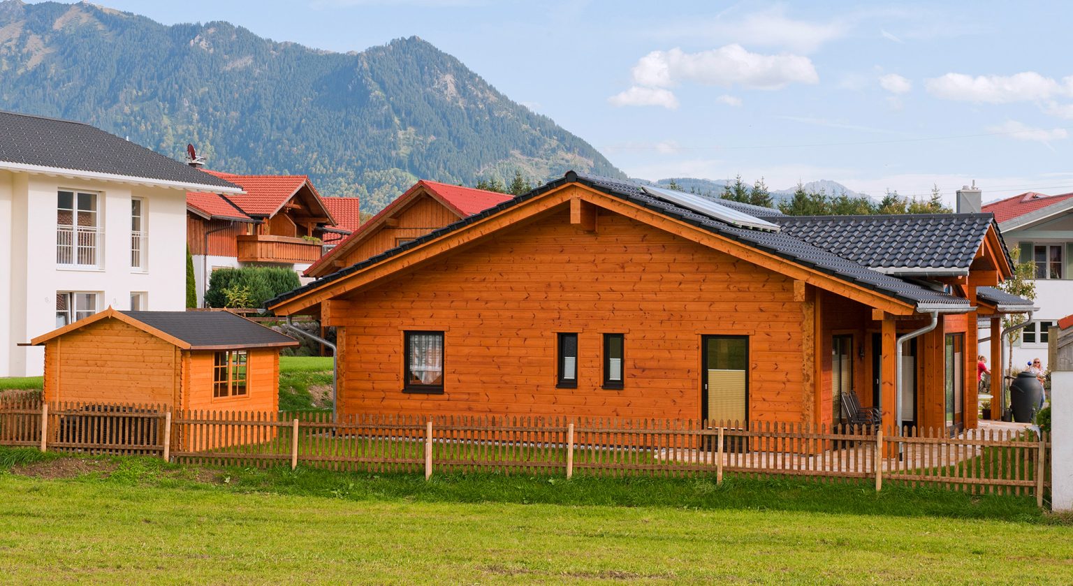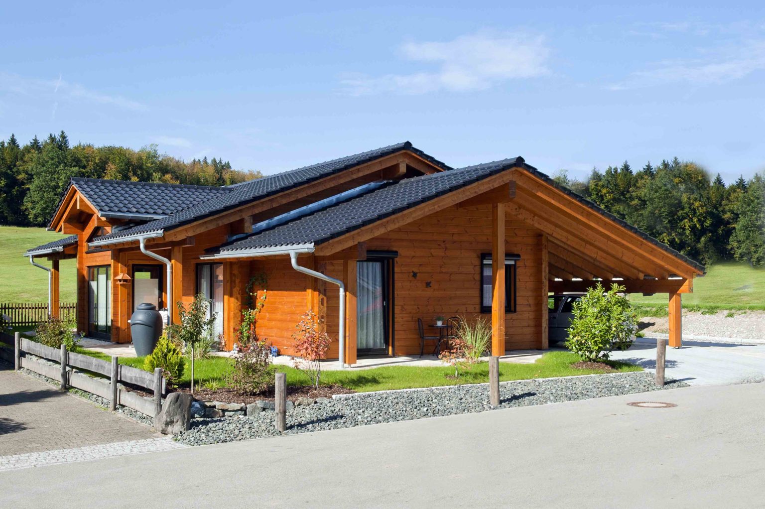 Durch die unterschiedlichen Dachhöhen des eingeschossigen Holzhauses und den dritten Giebel an der Süd-West Seite wirkt Holzhaus „Oberallgäu“ abwechslungsreich und interessant. Auch das vorgezogene Satteldach über der Terrasse an der südlichen Giebelseite und die Dachabschleppung über dem Carport an der nord-östlichen Traufseite unterstreichen diesen Eindruck. Streng genommen besitzt Holzhaus „Oberallgäu“ durch die unterschiedliche Höhe an der südlichen Giebelseite sogar vier Giebel!