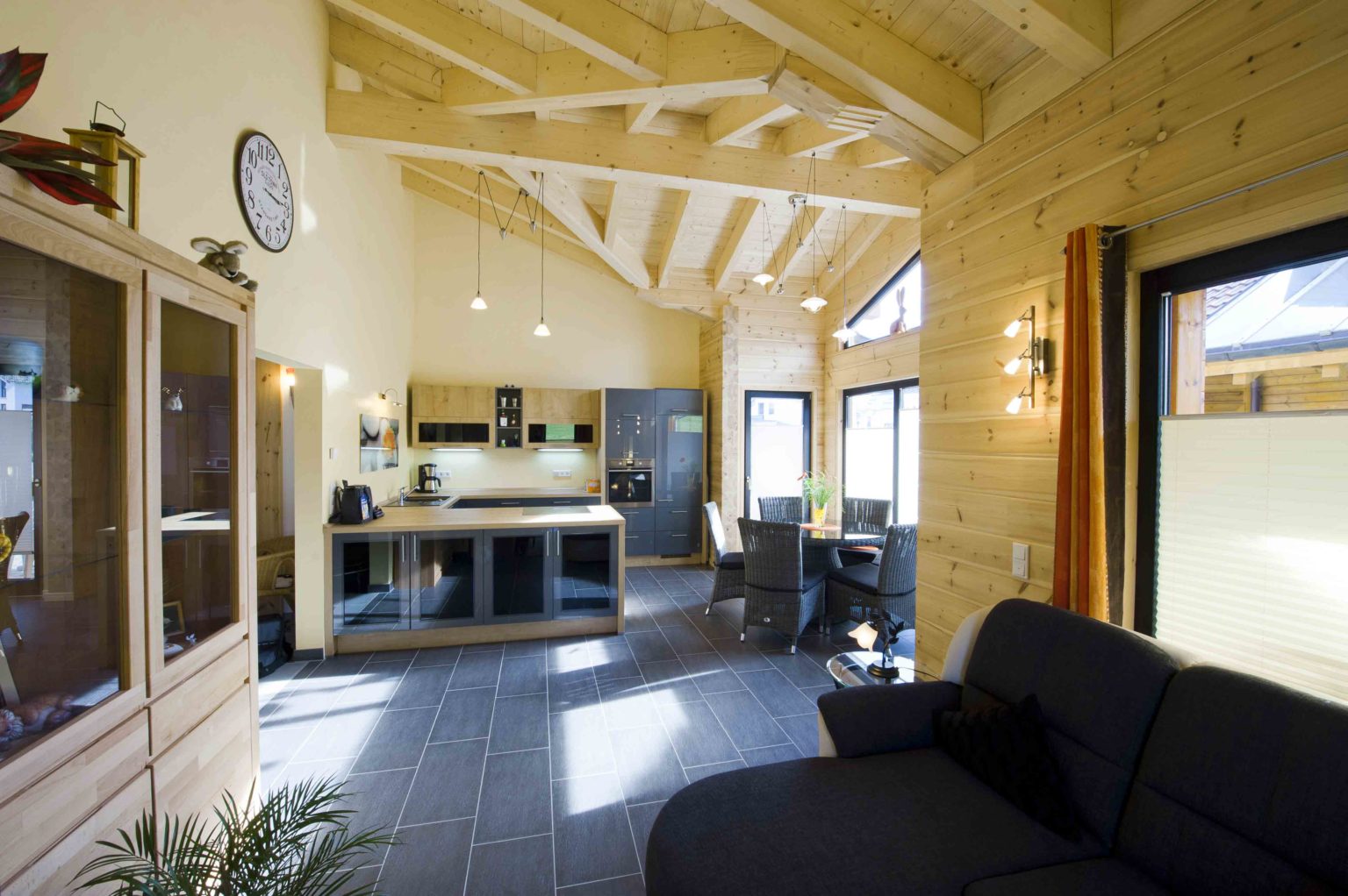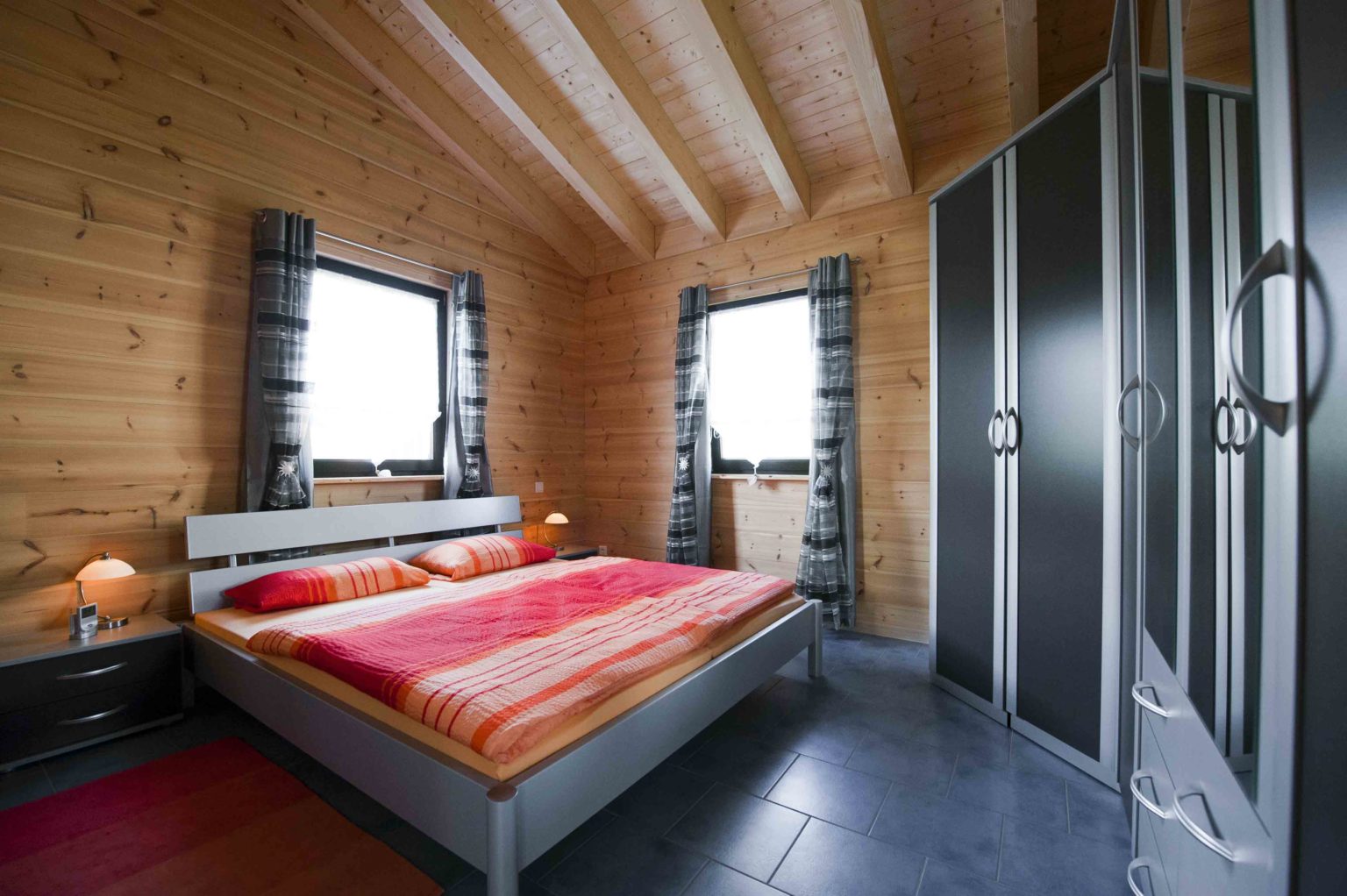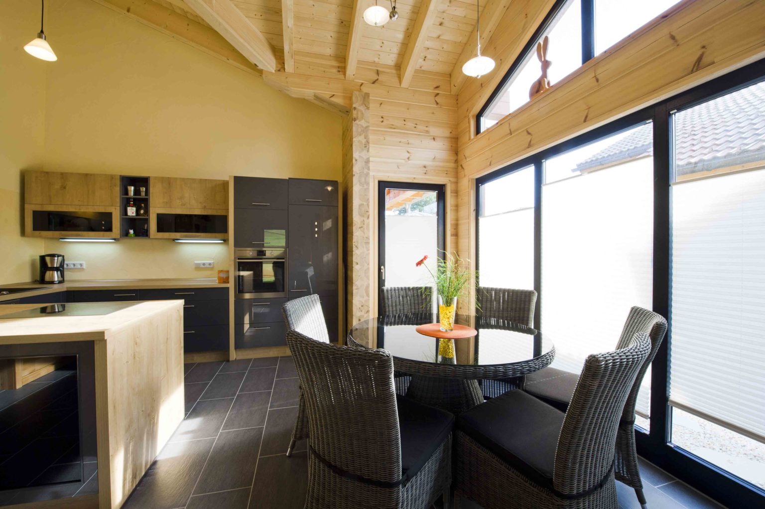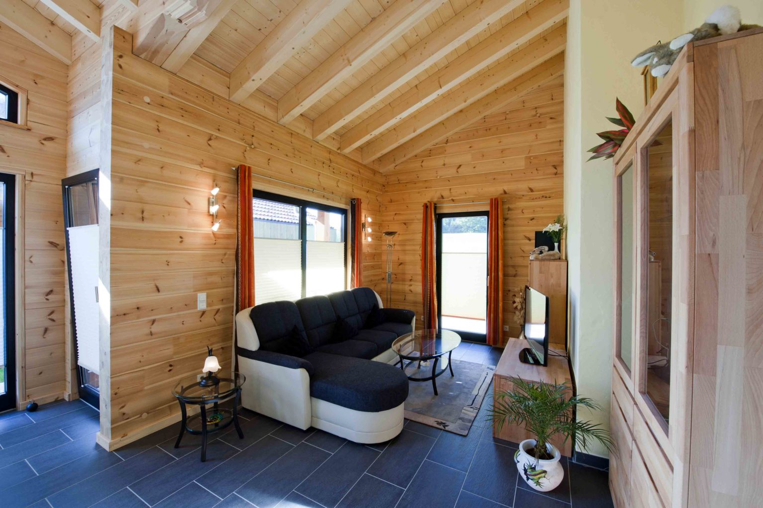 Bodentiefe Fenster lassen reichlich Tageslicht in die Räume. Drinnen wurden die hellen, UV-geschützten Vollholzwände mit Ständerbauwänden in sonnigen Farben kombiniert, was viel südliches Flair ins Haus bringt. Die Räume sind bis zum First offen und wirken daher sehr „luftig“ und großzügig. Außen wurden die Kiefernwände in einem warmen Farbton gestrichen, der das Holz vor Vergrauung schützt. Rollladen an allen Fenstern verhindern ein Aufheizen der nach Süden gerichteten Zimmer im Sommer.