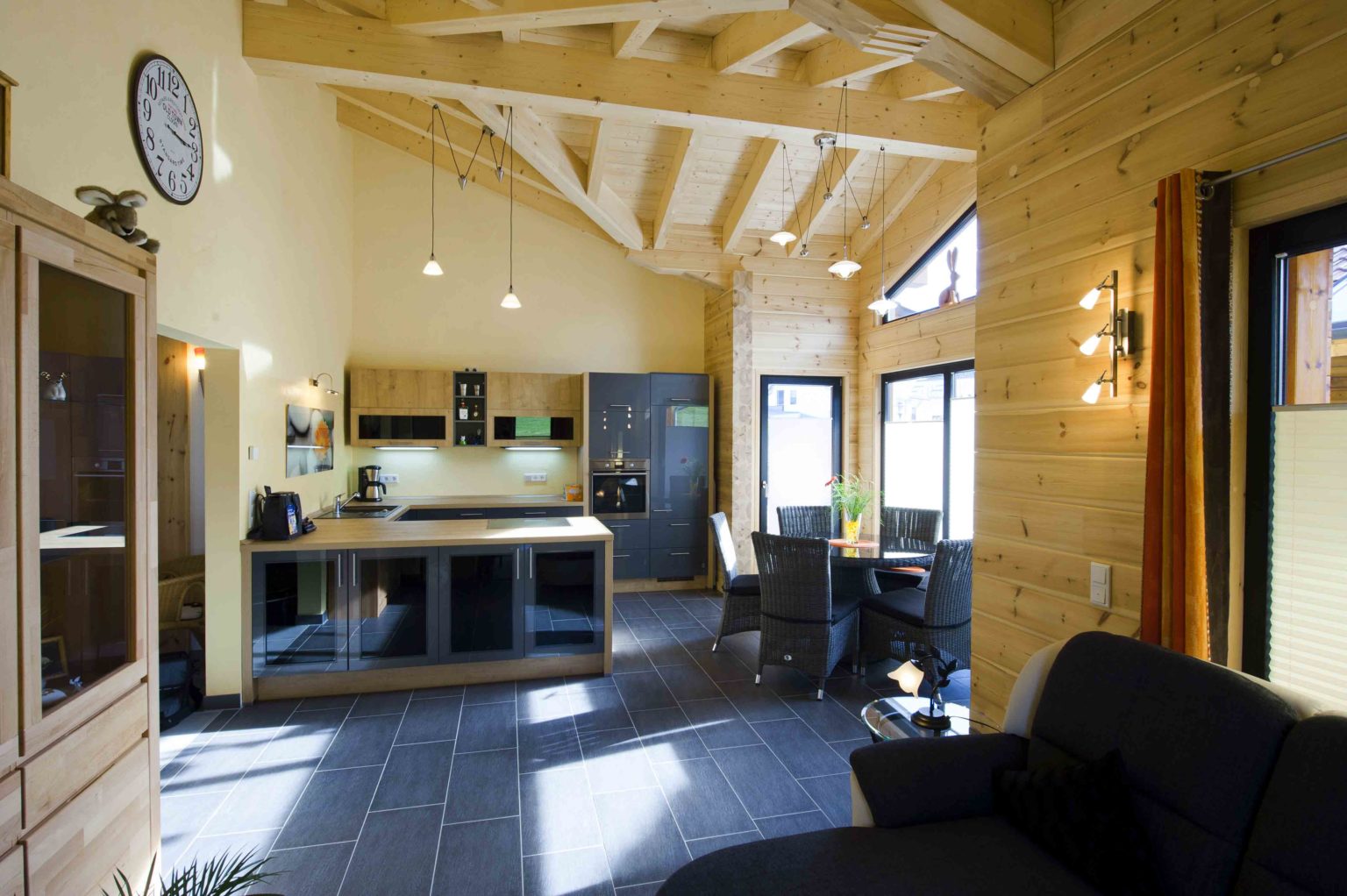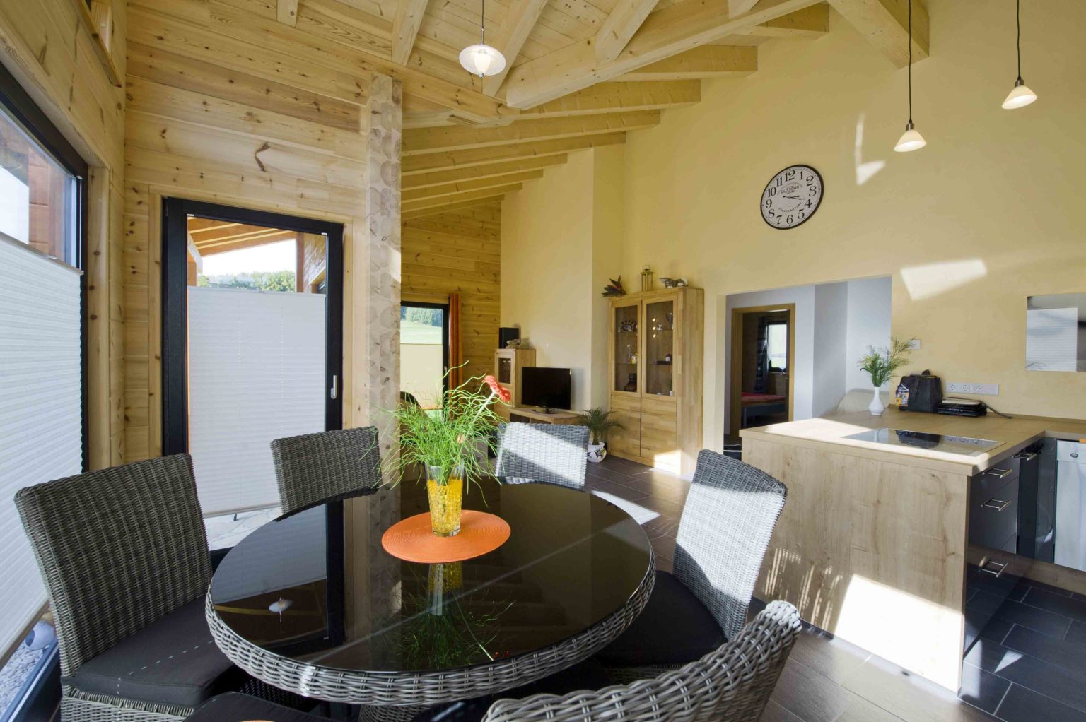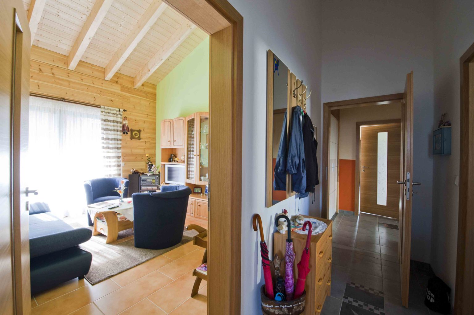 Bodentiefe Fenster lassen reichlich Tageslicht in die Räume. Drinnen wurden die hellen, UV-geschützten Vollholzwände mit Ständerbauwänden in sonnigen Farben kombiniert, was viel südliches Flair ins Haus bringt. Die Räume sind bis zum First offen und wirken daher sehr „luftig“ und großzügig. Außen wurden die Kiefernwände in einem warmen Farbton gestrichen, der das Holz vor Vergrauung schützt. Rollladen an allen Fenstern verhindern ein Aufheizen der nach Süden gerichteten Zimmer im Sommer.