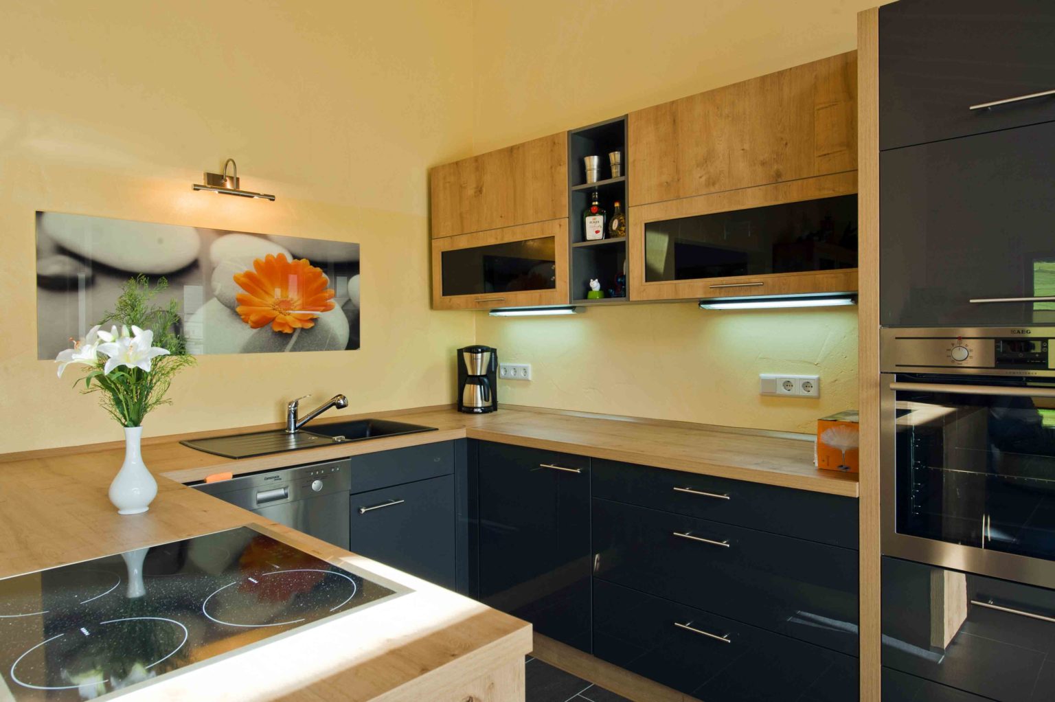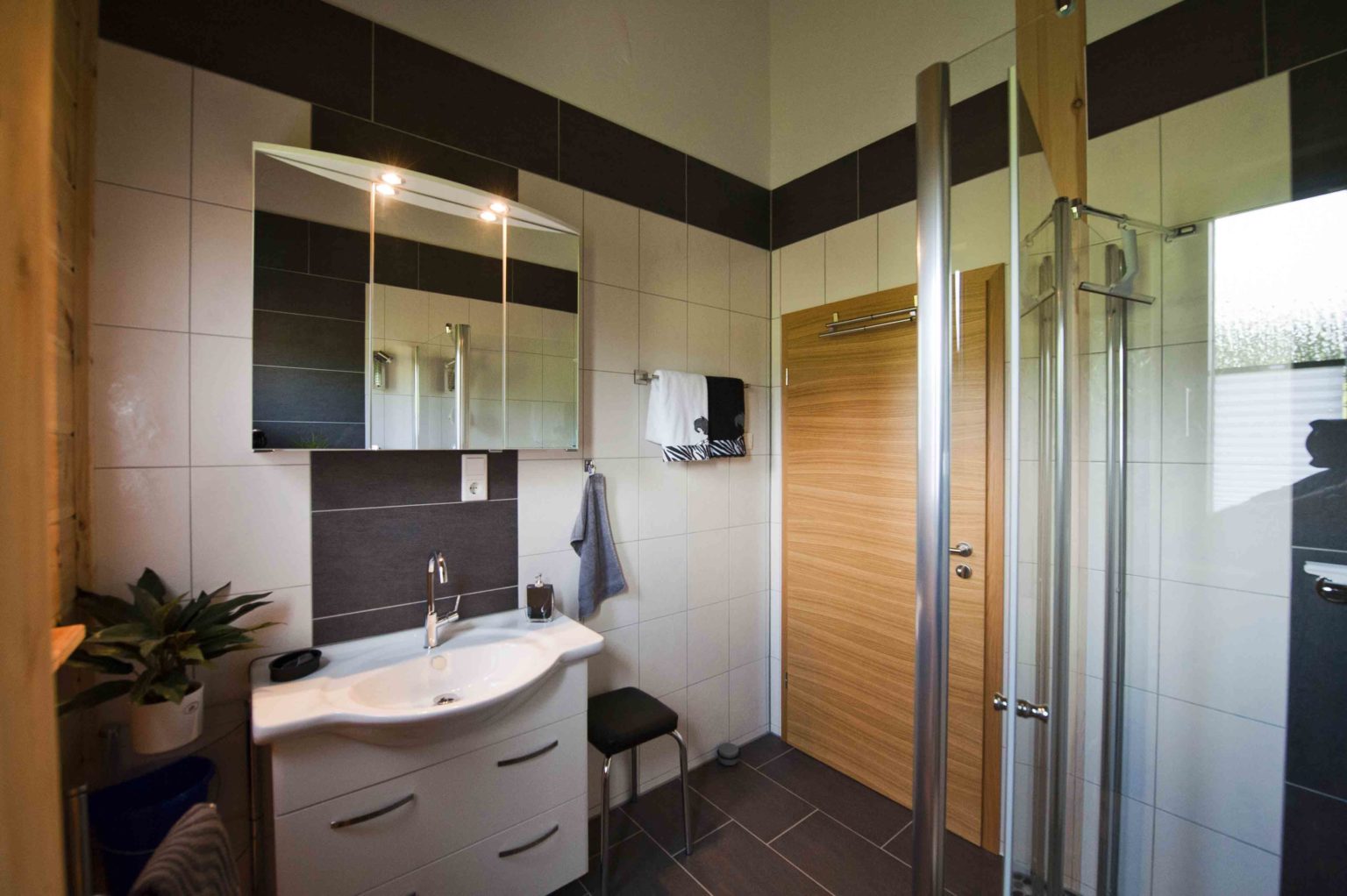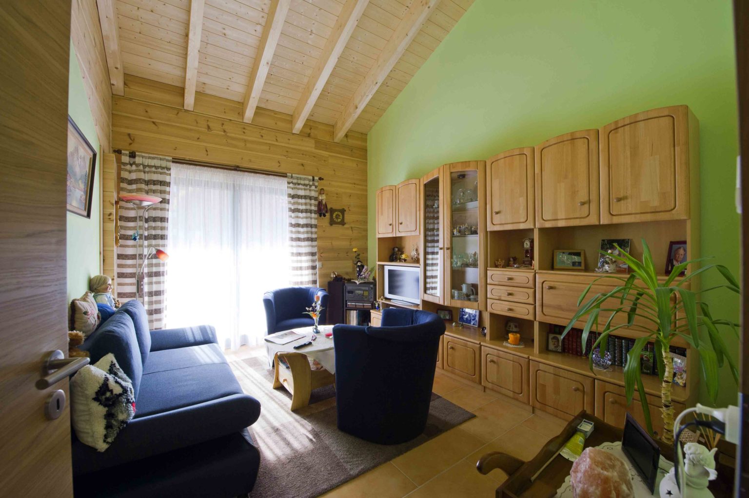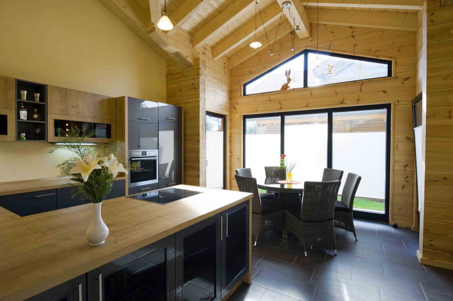 Bodentiefe Fenster lassen reichlich Tageslicht in die Räume. Drinnen wurden die hellen, UV-geschützten Vollholzwände mit Ständerbauwänden in sonnigen Farben kombiniert, was viel südliches Flair ins Haus bringt. Die Räume sind bis zum First offen und wirken daher sehr „luftig“ und großzügig. Außen wurden die Kiefernwände in einem warmen Farbton gestrichen, der das Holz vor Vergrauung schützt. Rollladen an allen Fenstern verhindern ein Aufheizen der nach Süden gerichteten Zimmer im Sommer.
