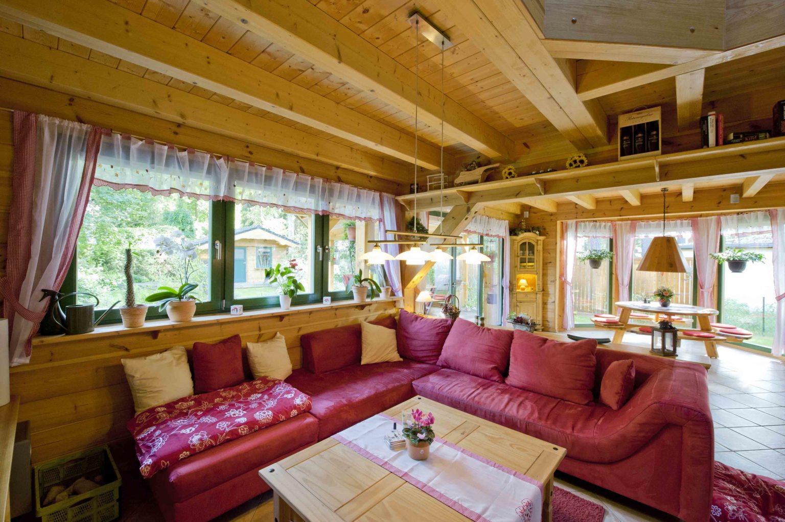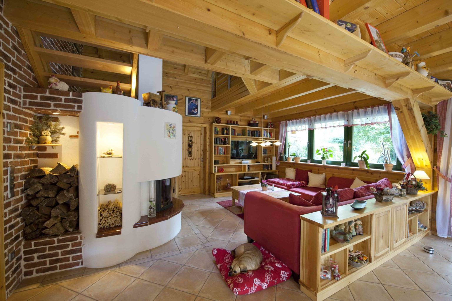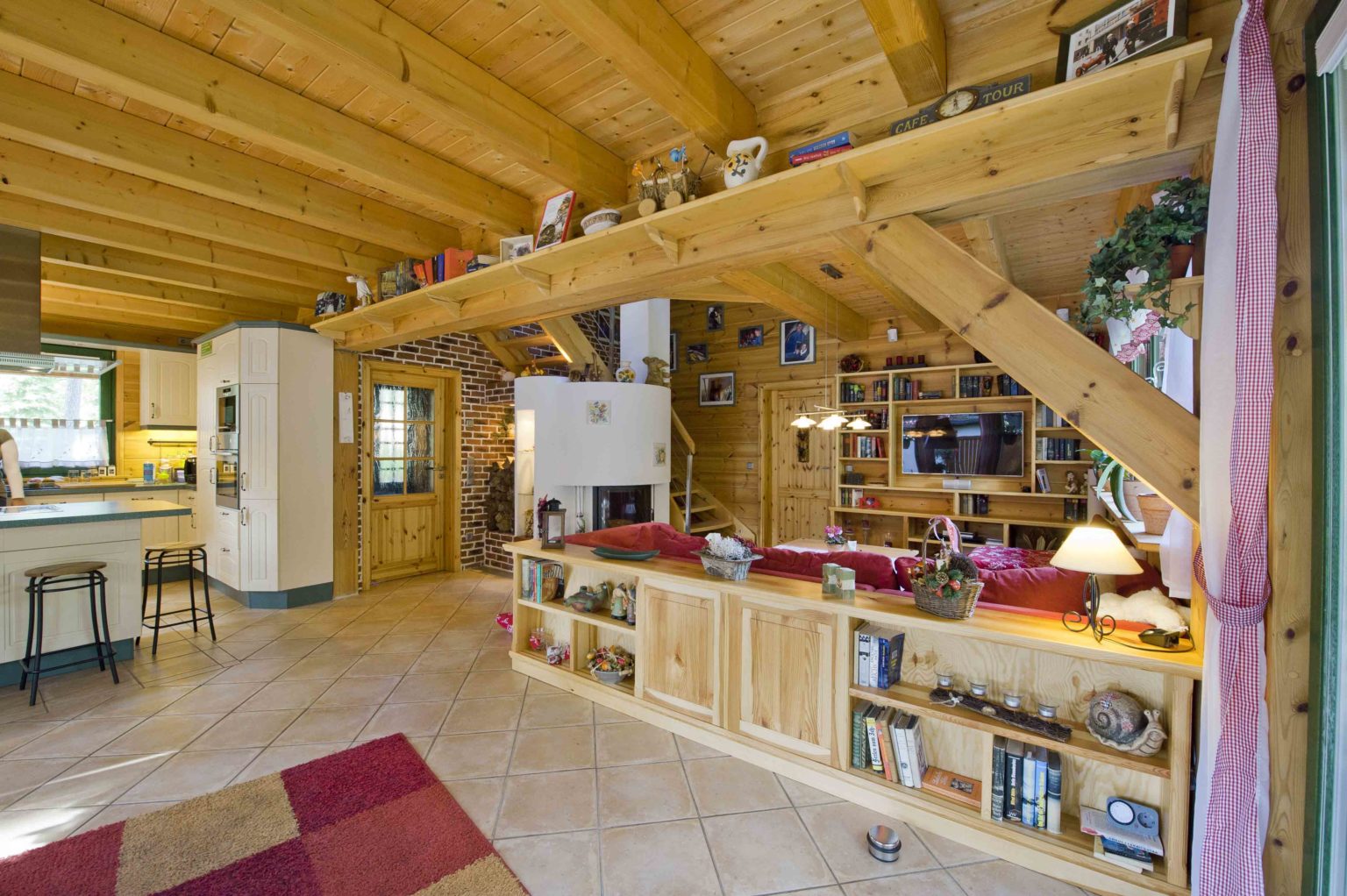 Der Wunsch nach einem eigenen Holzhaus begann in Österreich, wohin die Hauseigentümer oft reisen; die dort üblichen Holzhäuser gefielen dem Ehepaar so gut, dass sie sich auch für ihren Wohnalltag ein solches Heim wünschten. Wieder daheim, kamen sie eines Tages zufällig an einem Holzhaus von Fullwood vorbei und sprachen spontan dessen Besitzer an. Gerne wurde man herein gebeten und war sofort betört vom zarten Kiefernduft der Vollholzwände. So nahm alles seinen Lauf. Auch heute schwärmen die Eigentümer von Holzhaus „Oberhavel“ besonders von dem angenehmen Raumklima, das zu jeder Jahreszeit in ihrem Holzhaus herrscht: Im Sommer bleibt die Hitze draußen, so dass es angenehm kühl im Hause ist, und im Winter schützen die Vollholzwände vor eindringender Kälte und vor Heizwärmeverlust. Der Landhausstil von Haus und Interieur sowie die Farbe Rot zaubern zusätzlich zum Holz ganz viel Gemütlichkeit, und man fühlt sich ein bisschen wie im Österreichurlaub. Pflegeleichte Fliesen im gesamten Erdgeschoss erleichtern den Hausherren die Reinigung des großflächigen, offenen Wohnbereichs. Außerdem ergänzen sie mit ihrer Sandfarbe die hellen, naturbelassenen Vollholzwände wunderbar. Die vielen, großen Fensterflächen lassen reichlich Tageslicht herein, so dass der gesamte Wohnbereich tagsüber fast rund um die Uhr von Licht durchflutet wird. Vom Wohnzimmer führt eine offene Geschosstreppe, die konsequenterweise ebenfalls aus Holz gefertigt ist, auf die Galerie des Obergeschosses, von der es wiederum ins Bad, ins Schlafzimmer und ins Gästezimmer geht. Dort oben schmeicheln fußwarme Holzdielen den Sohlen (außer im gefliesten Bad, wo selbst die WC-Brille samt Deckel aus Holz besteht).