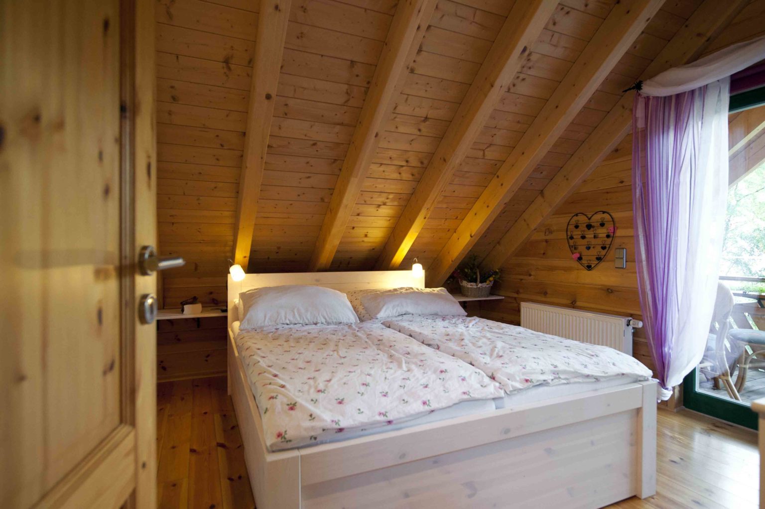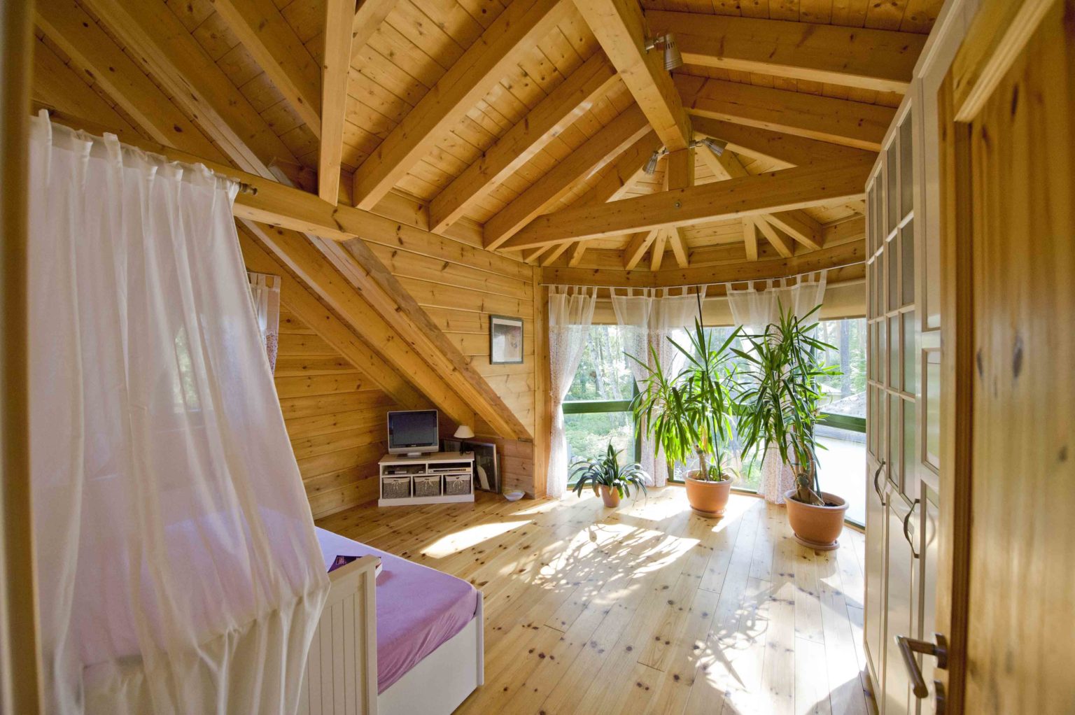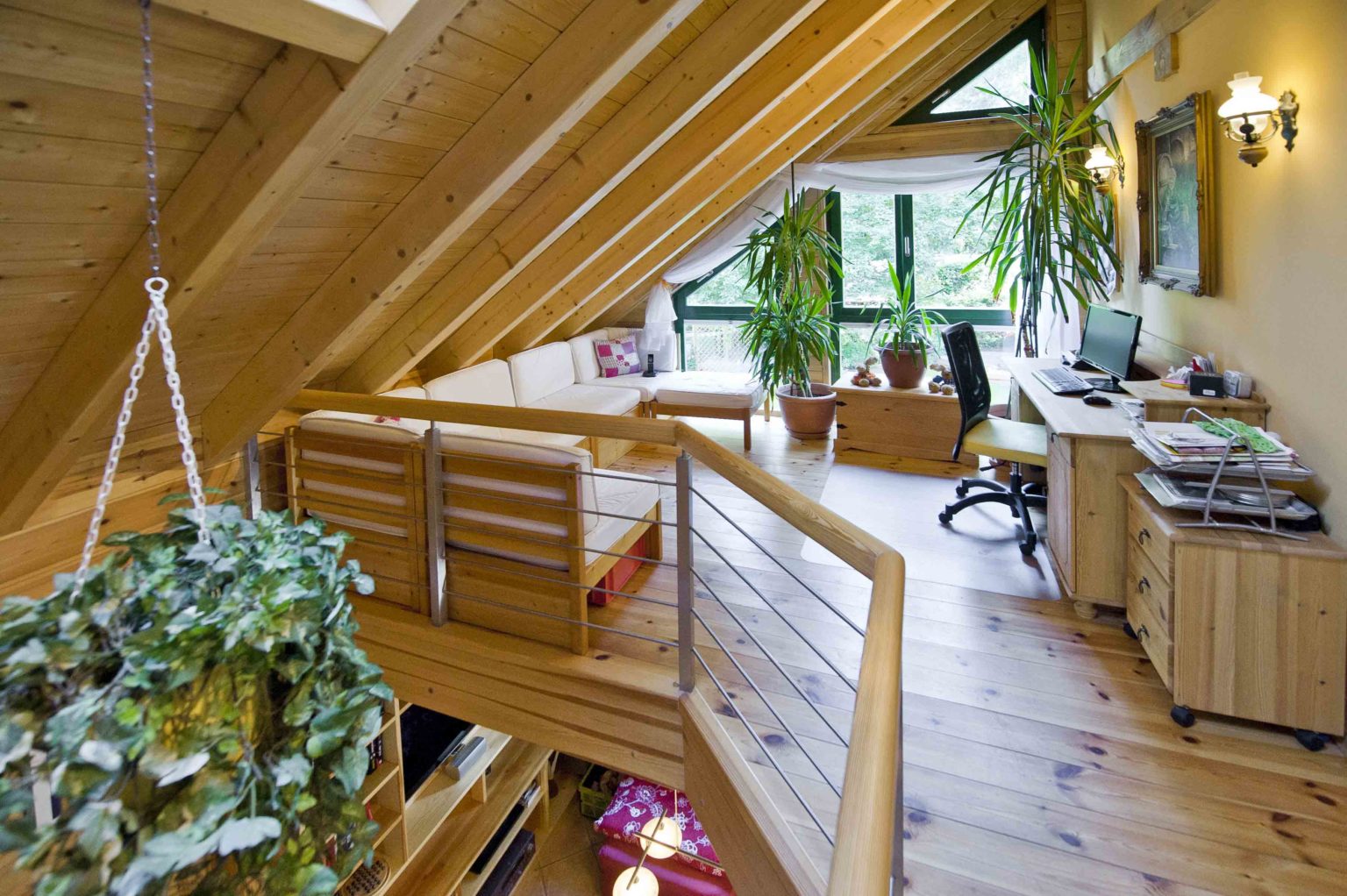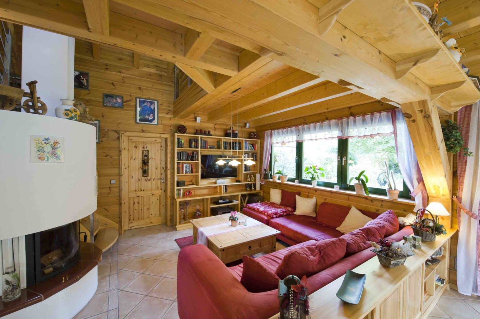 Der Wunsch nach einem eigenen Holzhaus begann in Österreich, wohin die Hauseigentümer oft reisen; die dort üblichen Holzhäuser gefielen dem Ehepaar so gut, dass sie sich auch für ihren Wohnalltag ein solches Heim wünschten. Wieder daheim, kamen sie eines Tages zufällig an einem Holzhaus von Fullwood vorbei und sprachen spontan dessen Besitzer an. Gerne wurde man herein gebeten und war sofort betört vom zarten Kiefernduft der Vollholzwände. So nahm alles seinen Lauf. Auch heute schwärmen die Eigentümer von Holzhaus „Oberhavel“ besonders von dem angenehmen Raumklima, das zu jeder Jahreszeit in ihrem Holzhaus herrscht: Im Sommer bleibt die Hitze draußen, so dass es angenehm kühl im Hause ist, und im Winter schützen die Vollholzwände vor eindringender Kälte und vor Heizwärmeverlust. Der Landhausstil von Haus und Interieur sowie die Farbe Rot zaubern zusätzlich zum Holz ganz viel Gemütlichkeit, und man fühlt sich ein bisschen wie im Österreichurlaub. Pflegeleichte Fliesen im gesamten Erdgeschoss erleichtern den Hausherren die Reinigung des großflächigen, offenen Wohnbereichs. Außerdem ergänzen sie mit ihrer Sandfarbe die hellen, naturbelassenen Vollholzwände wunderbar. Die vielen, großen Fensterflächen lassen reichlich Tageslicht herein, so dass der gesamte Wohnbereich tagsüber fast rund um die Uhr von Licht durchflutet wird. Vom Wohnzimmer führt eine offene Geschosstreppe, die konsequenterweise ebenfalls aus Holz gefertigt ist, auf die Galerie des Obergeschosses, von der es wiederum ins Bad, ins Schlafzimmer und ins Gästezimmer geht. Dort oben schmeicheln fußwarme Holzdielen den Sohlen (außer im gefliesten Bad, wo selbst die WC-Brille samt Deckel aus Holz besteht).