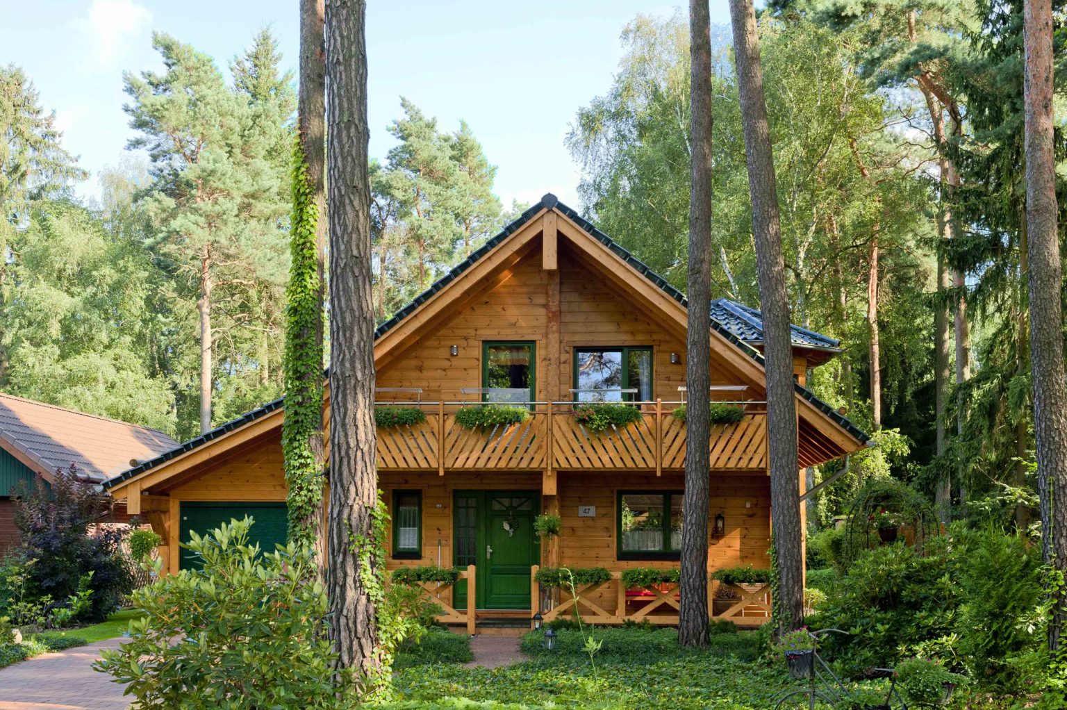 Der Grundriss von Holzhaus Oberhavel ist quadratisch, mit einem daran angebauten Teil, der über die gesamte Länge der östlichen Traufseite verläuft und Garage sowie Hauswirtschaftsraum beherbergt. Über den Baukörper breitet sich schützend das mit Tonziegeln in Moosgrün gedeckte Satteldach aus, dessen Abschleppung den Anbau bedeckt. Die Tannengrünen Fenster und Türen korrespondieren mit der Dachziegelfarbe und harmonieren mit dem warmen Farbton der Kiefernwände; sie verdeutlichen einmal mehr das Thema „Wald“. Der über beide Etagen verlaufende, rundum verglaste Erker an der Süd-West-Seite des Hauses betont die Landhausoptik des Gebäudes. Ob sommerlich-heiße Mittagssonne oder deutscher Nieselregen: Eine große, teils überdachte Terrasse an der Südseite des Hauses garantiert Frischluft und Gartengenuss bei jedem Wetter. Daran schließt sich ein Teich und viel Grün an. Zur kalten Jahreszeit hingegen genießen die Bewohner ihr Holzhaus am liebsten am knisternden Feuer des Kaminofens. Kein Wunder, dass sich die Hauseigentümer zuhause wie im Paradies fühlen.
