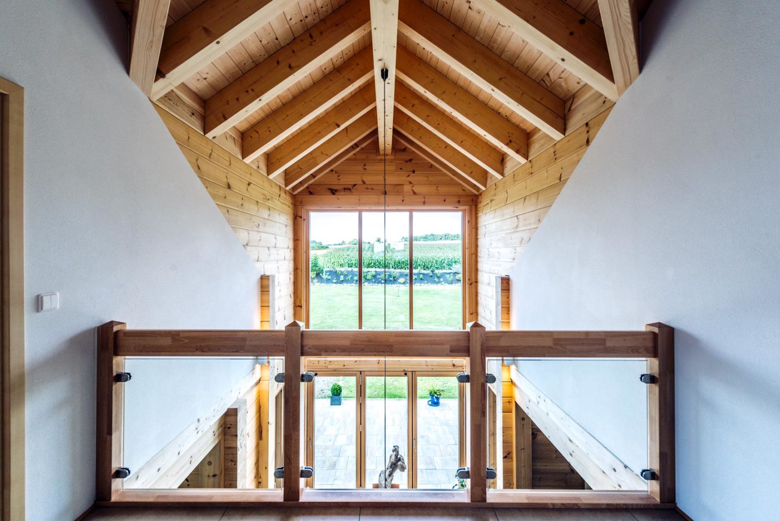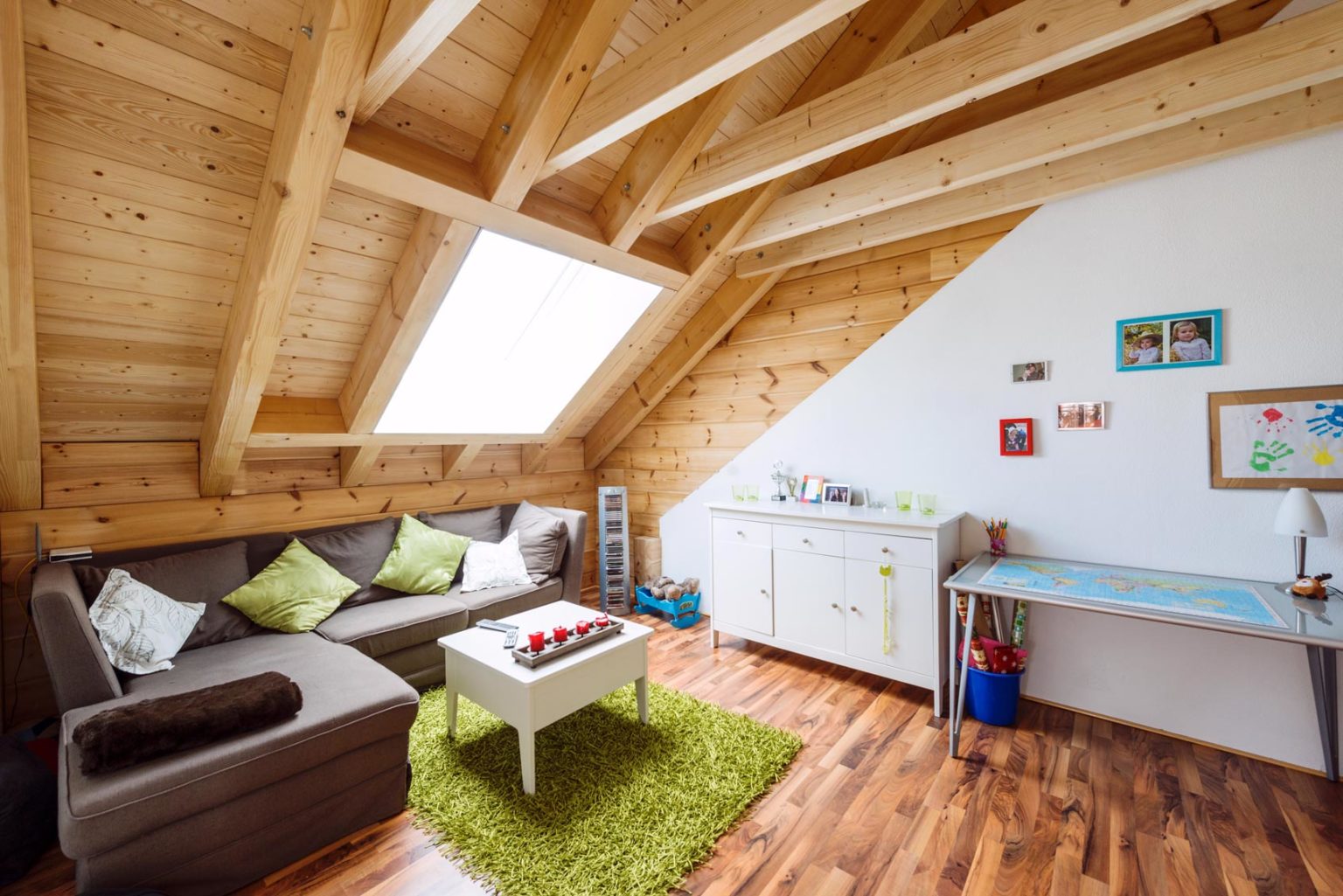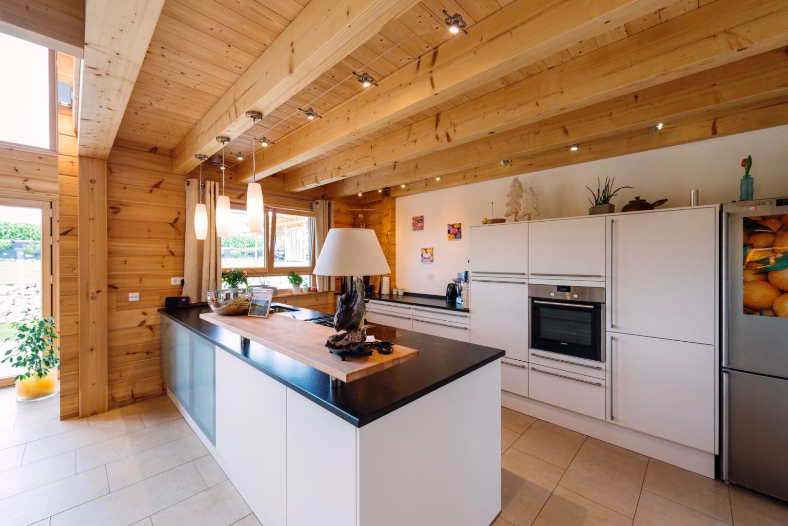 Die Eltern von Max Weigl wollten keinen durchgehend offenen Wohnbereich, sondern bevorzugten eine separate Küche – genau wie im anderen Hausteil mit angeschlossener Speisekammer -, die, wie der Wohn/Ess-Bereich auch, von der Diele zu erreichen ist. Beide Haushälften verfügen über einen geschlossenen Windfang und ein Gäste-WC. Die größere Haushälfte der jüngeren Eigentümer hat außerdem noch einen Hauswirtschaftsraum und ein Gästezimmer im Erdgeschoss. "Meine Eltern wollten deutlich weniger Wohnfläche als wir. Neben einer Galerie mit offenem Arbeitsbereich, einem Schlafzimmer und Badezimmer mit dazwischen positionierter Ankleide, verfügt unser Dachgeschoss noch über zwei mögliche Kinderzimmer.", begründet der Junior die unterschiedlichen Größen der beiden Hausteile. Die Senioren sind in ihrem Dachgeschoss mit Galerie (inklusive Arbeitsbereich), Schlafzimmer, Badezimmer und Abstellraum bestens bedient. Auch sie wollten auf einen Firsthohen Luftraum über dem Essbereich im Erdgeschoss nicht verzichten. Im Gegensatz zum Sohnemann, dessen Holzhaus auch an der Eingangsseite (Südausrichtung) ein zweigeschossiges Zwerchhaus (vierter Giebel) aufweist, verzichteten Weigl sen. auf Gauben oder andere Höhen-/Flächenerweiterungen im Dachgeschoss. Außerdem differiert auch die Kniestockhöhe beider Hausteile, denn die jungen Leute wollten lieber 1,20m Höhe anstatt der üblichen 90cm.