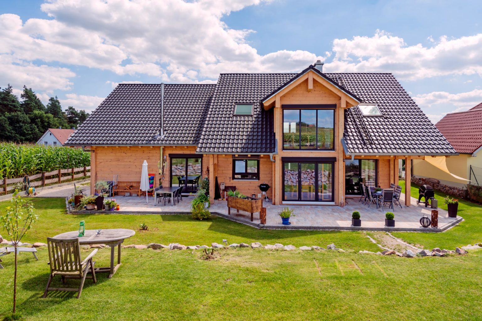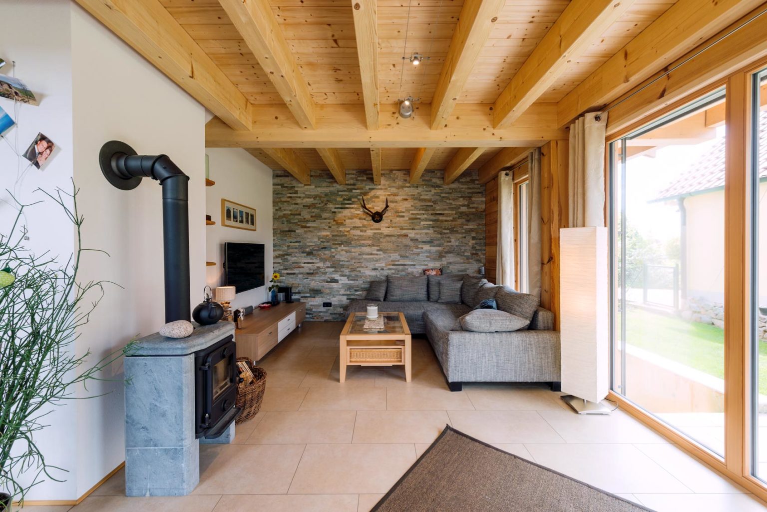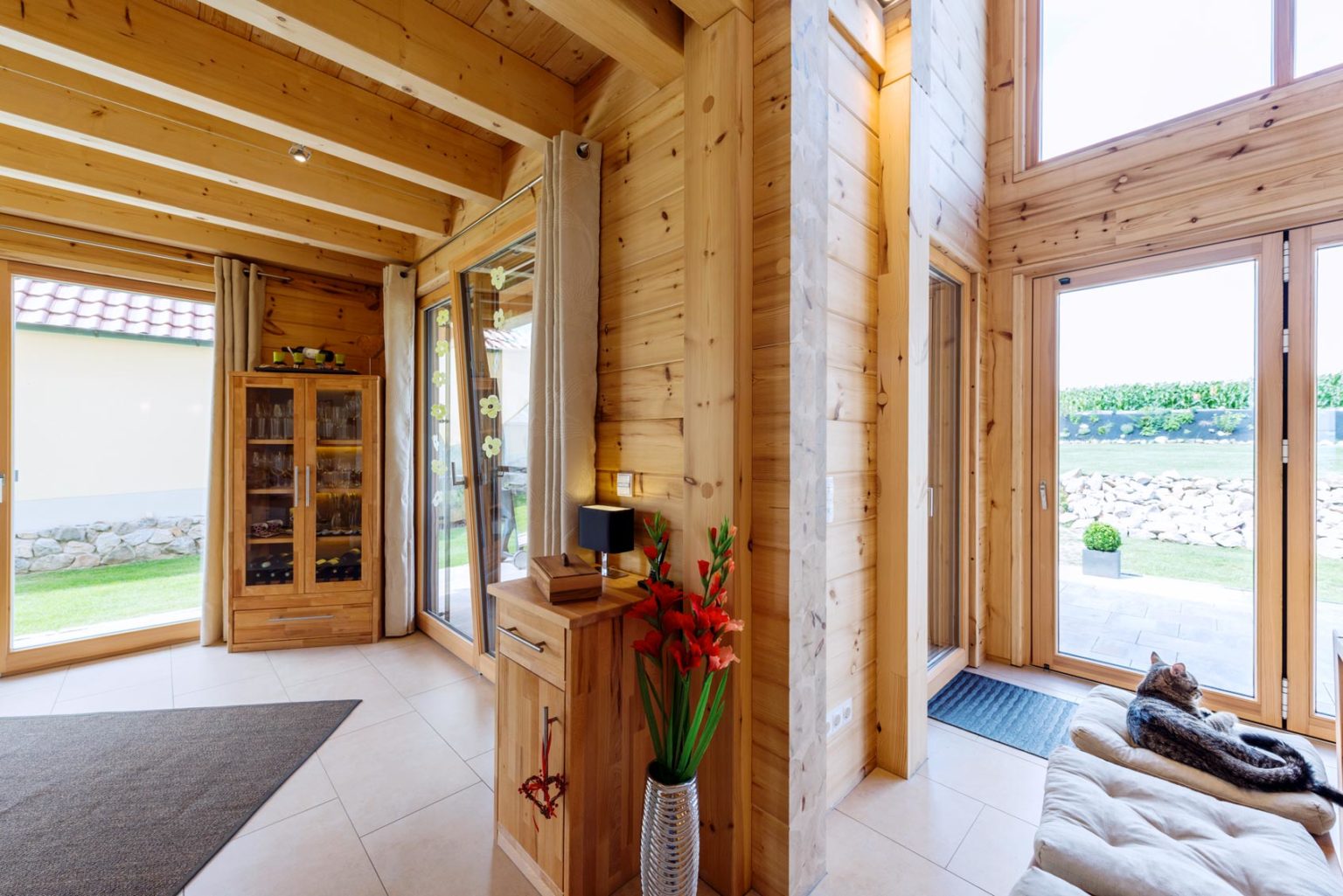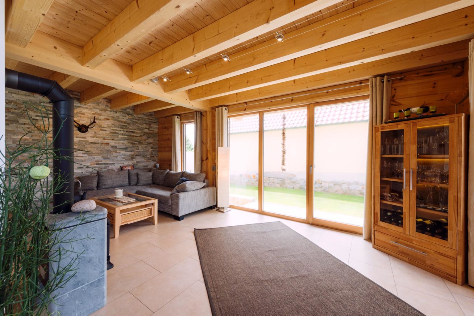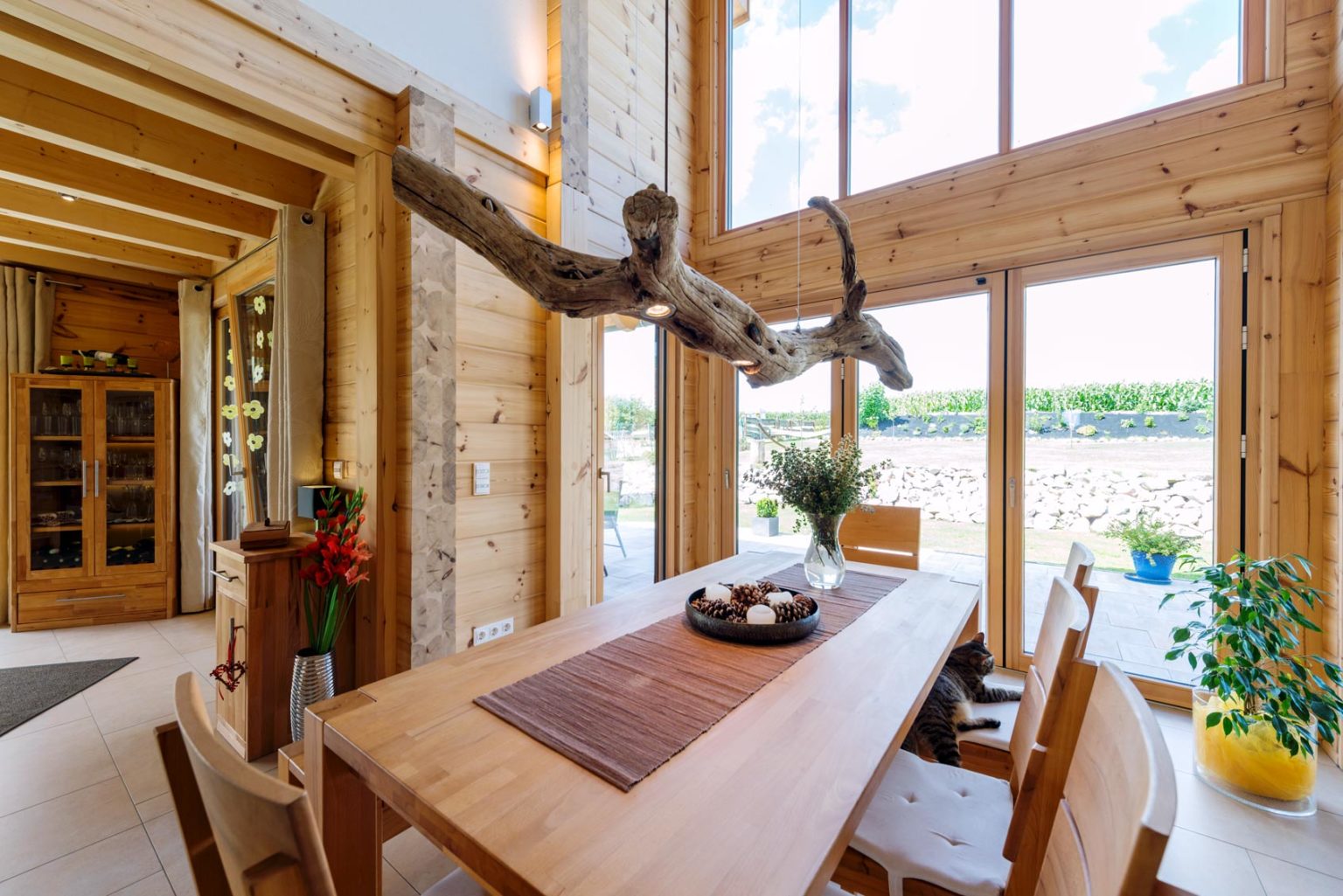 Beide Teile von Holzhaus "Oberpfalz" bestehen aus der 20cm dicken, einschaligen Kiefernblockwand, die Fullwood anbietet. "Der große Vorteil dieser Wand ist ihre Setzungsfreiheit. So spart man sich aufwändige Erhaltungsarbeiten während der Wohnzeit. Absolut winddicht und extrem robust ist sie auch. Den Außenanstrich haben wir lediglich aus optischen Gründen aufgetragen, damit das Holz hell bleibt und nicht vergraut.", sagt Max Weigl. Der Bauherrschaft entgegen kam auch die Möglichkeit, ihr Holzhaus als sogenannte "Richtmeistermontage" zu bauen. So können Häuslebauer durch den Einsatz von Eigenleistung eine schöne Stange Geld sparen. "Wir wurden von zwei erfahrenen Richtmeistern der Hausfirma angeleitet und unterstützt. Außerdem haben unsere Eltern, mein Bruder und ein paar Freunde uns beim Hausbau geholfen.", erzählt Jasmin Fuchs. Die Arbeiten an Estrich, Fliesen, Fenster und Keller (mit Sauna) ließ das Bauherrenquartett von örtlichen Fachfirmen ausführen. Dank der Tatsache, dass die Hauswände in wenigen, vorgefertigten Einzelelementen und passgenau zugeschnittenen Dachbalken/-sparren geliefert wurden, klappte die Hausmontage schnell und problemlos. "Wir sind sehr stolz auf unsere Eigenleistung!", strahlt Max Weigl, der ursprünglich gelernter Elektroniker ist, und jetzt als Lehrer für technische Berufe mit dem Schwerpunkt Mechatronik unterrichtet. Da sein Steckenpferd sowieso die Planung und Programmierung von Gebäudesystemtechnik ist, kann die gesamte Haustechnik von Holzhaus Oberpfalz komplett übers Tablet gesteuert und bedient werden und einige Funktionen des Gebäudes wurden sogar automatisiert. Ein echtes Smarthome also! Beide Parteien heizen mit Pellets, greifen also auf regenerative Energien zurück um die Fußbodenheizung im Winter zu erwärmen. "Von April bis Oktober reicht die installierte Solarthermie zum Heizen und für die Warmwasserbereitung." Und die Regenwasserzisterne im Garten fängt 11.000 Liter Wasser auf, das nicht nur zur Gartenbewässerung, sondern auch für die WC-Spülung genutzt wird – ebenfalls eine sinnvolle Lösung!