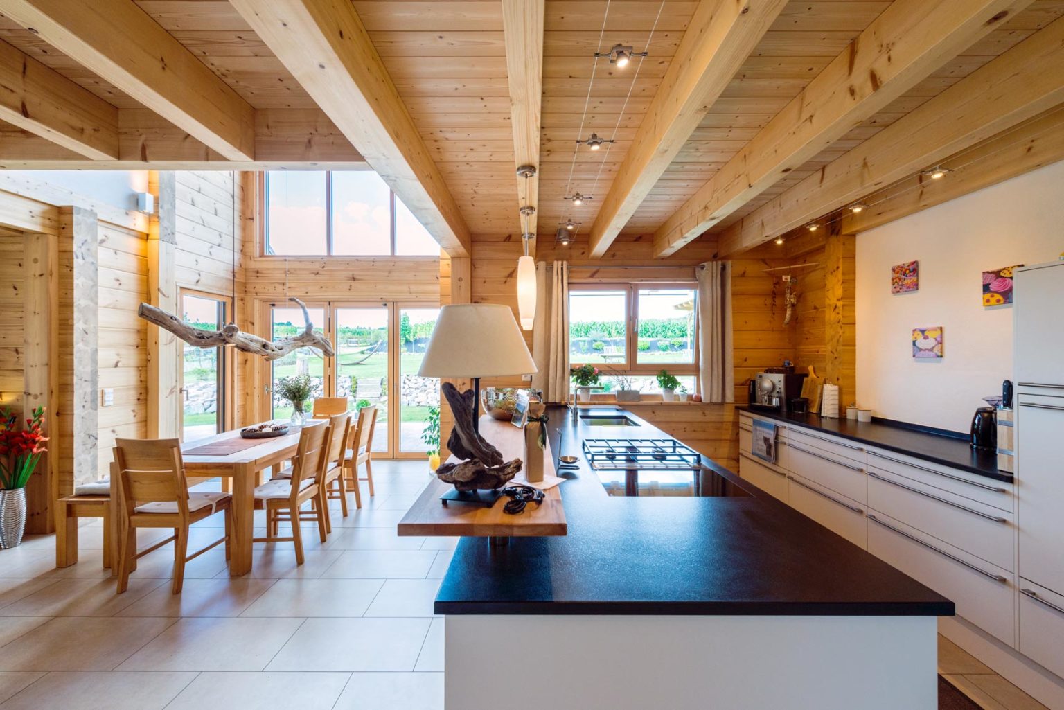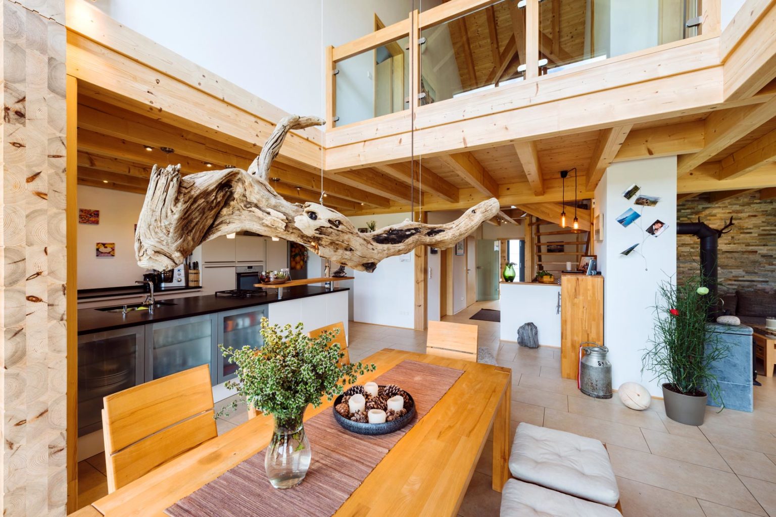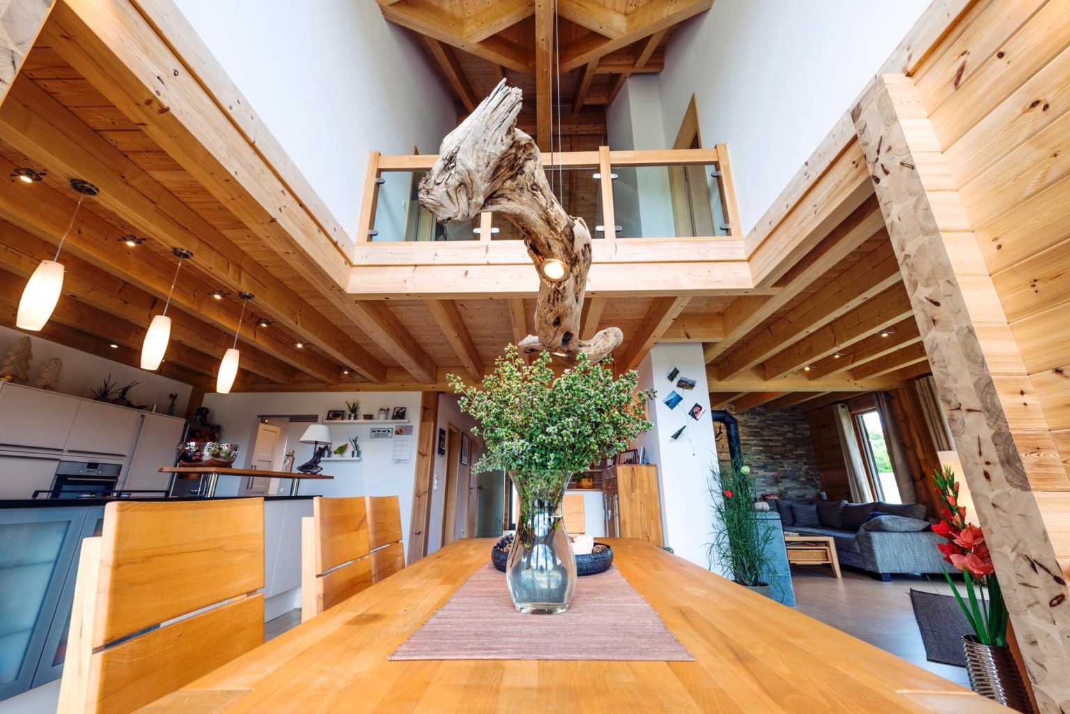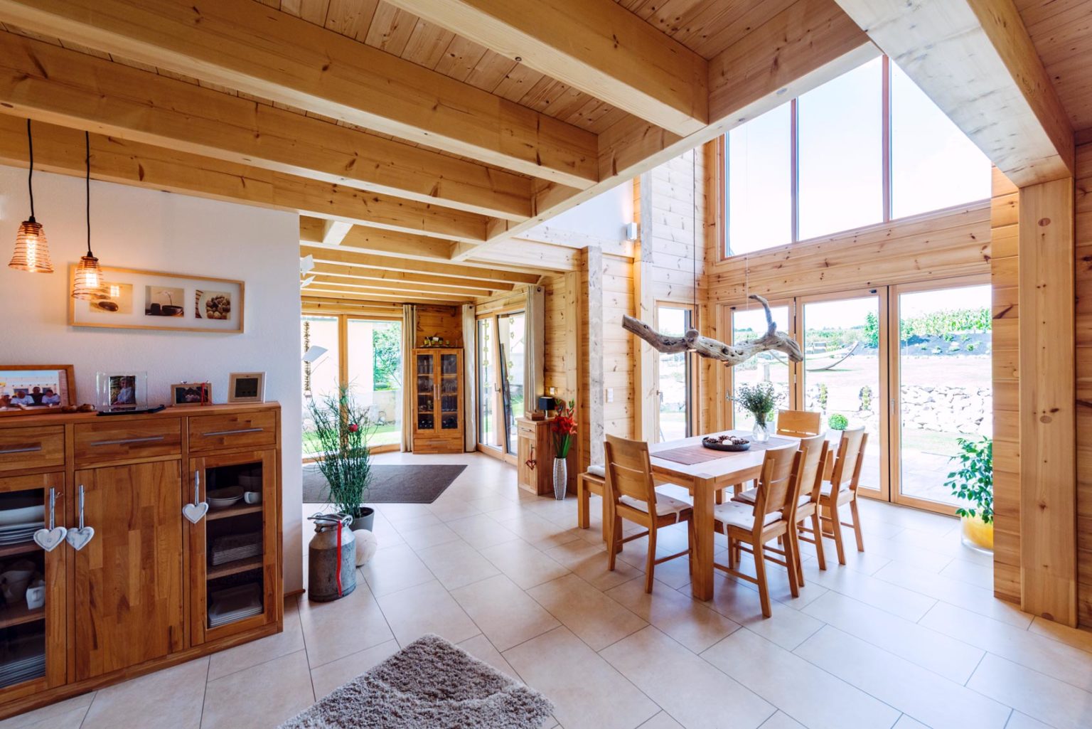 Also plante das Baupaar zuerst selbständig auf Millimeterpapier und dann zusammen mit seinem kompetenten Berater und der Architektin von Fullwood ein sehr helles, geräumiges Holzhaus, das zudem zwei getrennte, voneinander unabhängige Wohneinheiten haben musste, da die Eltern von Max Weigl mit bauen und einziehen wollten. "Wichtig war uns ein sehr großer, offener Wohnbereich, in dem Diele, Küche, Esszimmer und Wohnzimmer fließend ineinander übergehen und gleichzeitig räumlich voneinander getrennt sind, also jeweils eigene Bereiche haben.", erläutert der Hausherr. Das gelang durch eine vorgezogene Wand, welche die Sofaecke von der Küche und der Diele optisch separiert, so dass ein sehr gemütlicher Bereich entstand; und durch verschiedene Deckenhöhen, wodurch die einzelnen Bereiche jeweils für sich betont werden. "Uns gefiel eine gewisse Großzügigkeit und luftige Kopffreiheit im Wohnbereich. Deshalb entschieden wir uns für einen bis zum First offenen Luftraum über dem Esszimmer.“, schwärmt Jasmin Fuchs. Tatsächlich ist der Essbereich im komplett verglasten Zwerchhaus (dritter Giebel) zum Garten (Nordseite!) untergebracht. Die enorme Höhe über etwa 7 Meter lässt den Blick frei auf den imposanten Sichtdachstuhl. Diese Luftigkeit ergibt in Verbindung mit den sehr hellen Kiefernwänden (mit UV-Schutz gegen Nachdunkeln), den weiß gestrichenen Trennwänden (leichter Ständerbau) und den großen Fensterflächen – auch Dachfenstern - die erwünschte weitläufige, leichte, helle und moderne Atmosphäre im Holzhaus. Trotz der offenen Balkendecken drückt nichts in Holzhaus Oberpfalz!