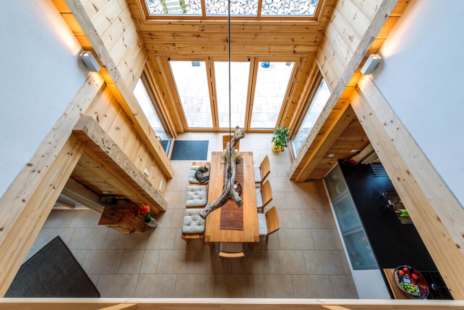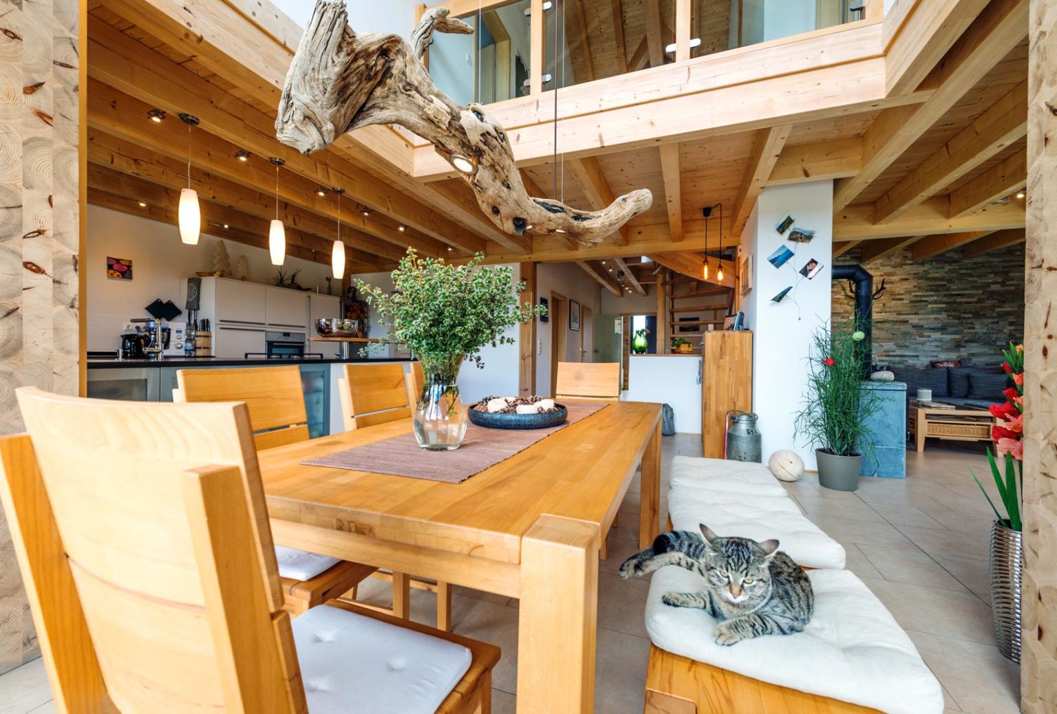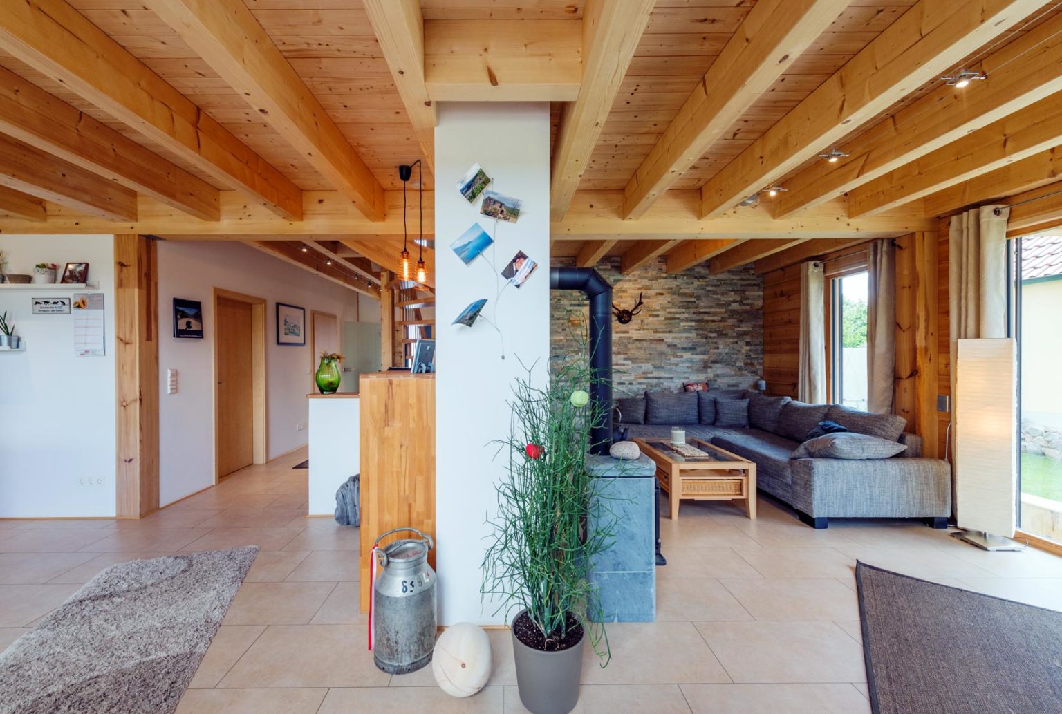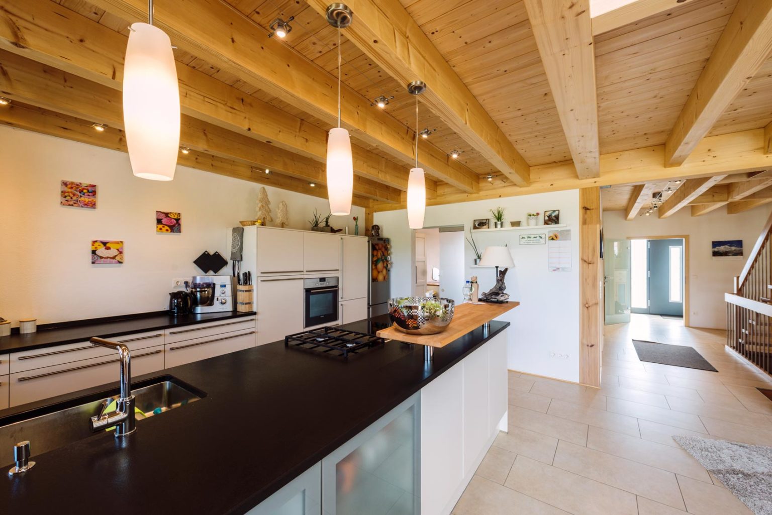Also plante das Baupaar zuerst selbständig auf Millimeterpapier und dann zusammen mit seinem kompetenten Berater und der Architektin von Fullwood ein sehr helles, geräumiges Holzhaus, das zudem zwei getrennte, voneinander unabhängige Wohneinheiten haben musste, da die Eltern von Max Weigl mit bauen und einziehen wollten. "Wichtig war uns ein sehr großer, offener Wohnbereich, in dem Diele, Küche, Esszimmer und Wohnzimmer fließend ineinander übergehen und gleichzeitig räumlich voneinander getrennt sind, also jeweils eigene Bereiche haben.", erläutert der Hausherr. Das gelang durch eine vorgezogene Wand, welche die Sofaecke von der Küche und der Diele optisch separiert, so dass ein sehr gemütlicher Bereich entstand; und durch verschiedene Deckenhöhen, wodurch die einzelnen Bereiche jeweils für sich betont werden. "Uns gefiel eine gewisse Großzügigkeit und luftige Kopffreiheit im Wohnbereich. Deshalb entschieden wir uns für einen bis zum First offenen Luftraum über dem Esszimmer.“, schwärmt Jasmin Fuchs. Tatsächlich ist der Essbereich im komplett verglasten Zwerchhaus (dritter Giebel) zum Garten (Nordseite!) untergebracht. Die enorme Höhe über etwa 7 Meter lässt den Blick frei auf den imposanten Sichtdachstuhl. Diese Luftigkeit ergibt in Verbindung mit den sehr hellen Kiefernwänden (mit UV-Schutz gegen Nachdunkeln), den weiß gestrichenen Trennwänden (leichter Ständerbau) und den großen Fensterflächen – auch Dachfenstern - die erwünschte weitläufige, leichte, helle und moderne Atmosphäre im Holzhaus. Trotz der offenen Balkendecken drückt nichts in Holzhaus Oberpfalz!