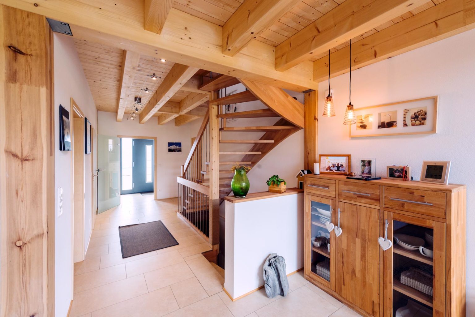 Dass ein Holzhaus nicht einer Sauna gleichen muss, entdeckte das Paar während der Internetrecherche und blieb bei Fullwood hängen, deren moderne Holzhäuser den beiden optisch zusagten. "Spätestens beim Besuch des Musterhauses war auch ich von einem Holzhaus überzeugt.", sagt Jasmin Fuchs. "Das war durch die bodentiefen Fenster und weiß gestrichenen Trennwände sehr hell innen drin. Und die schlichten, glatten Holzwände gefielen mir auch besser als beispielsweise Naturstämme."