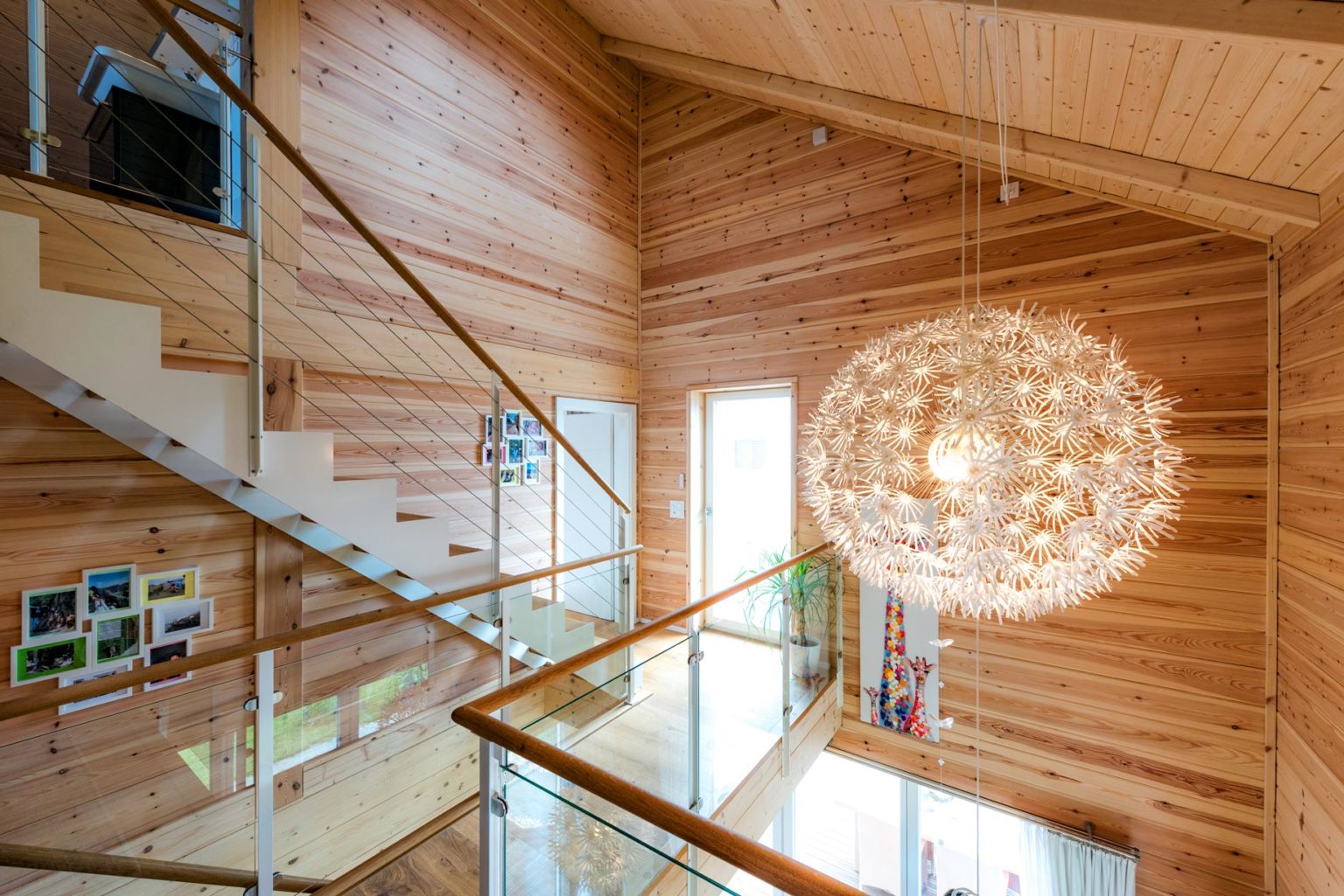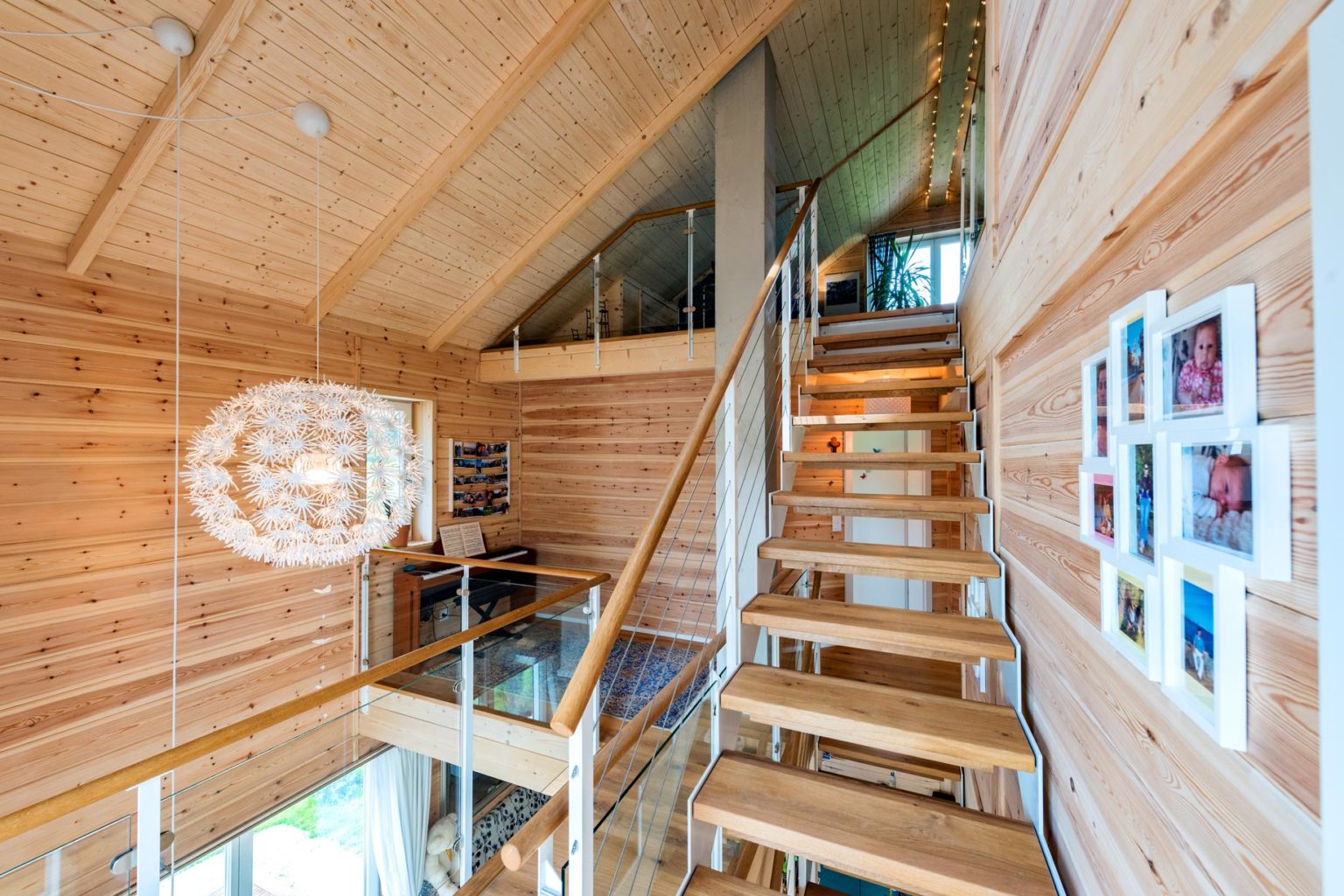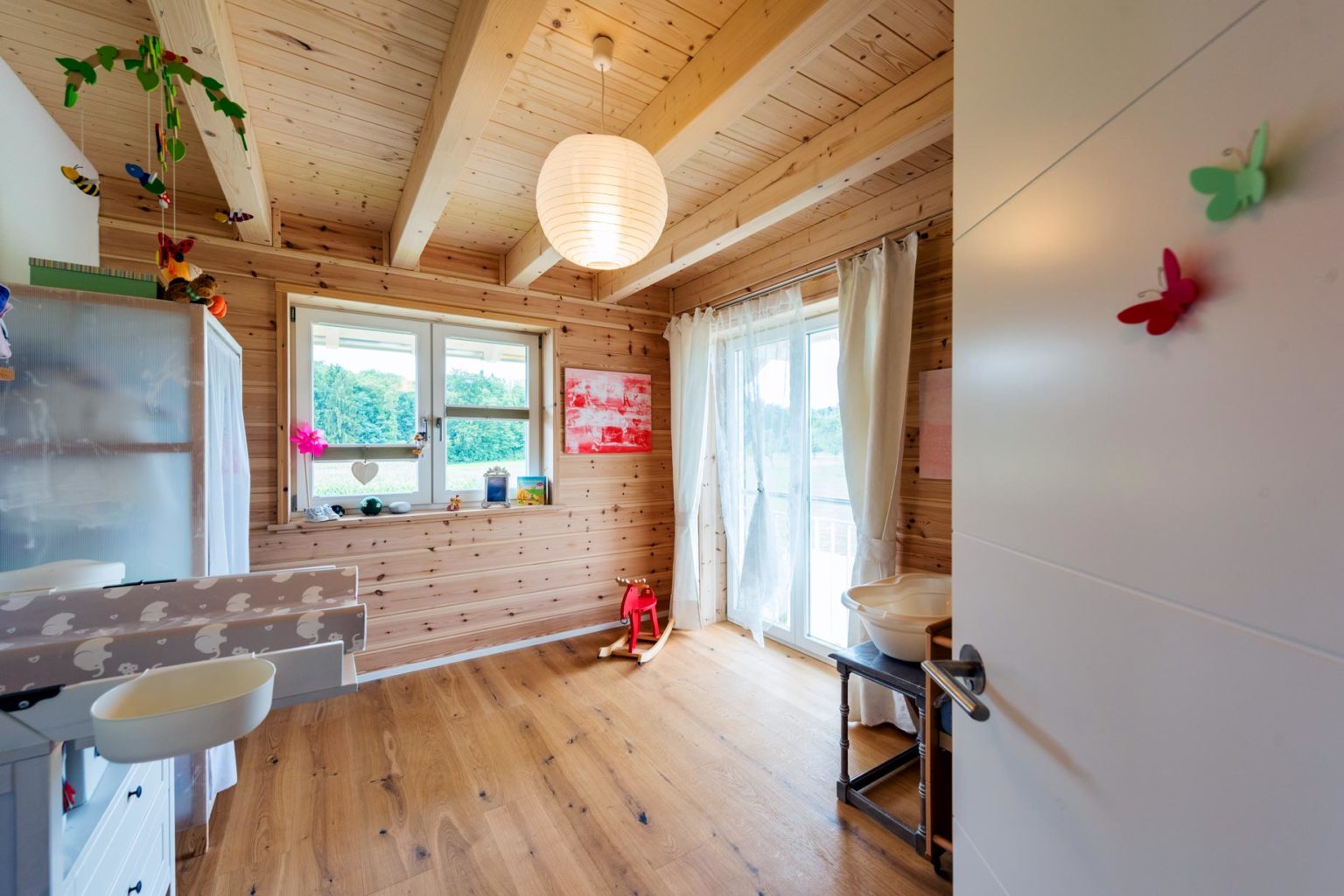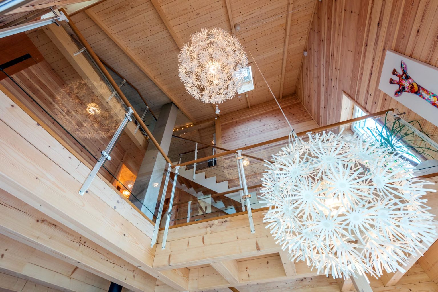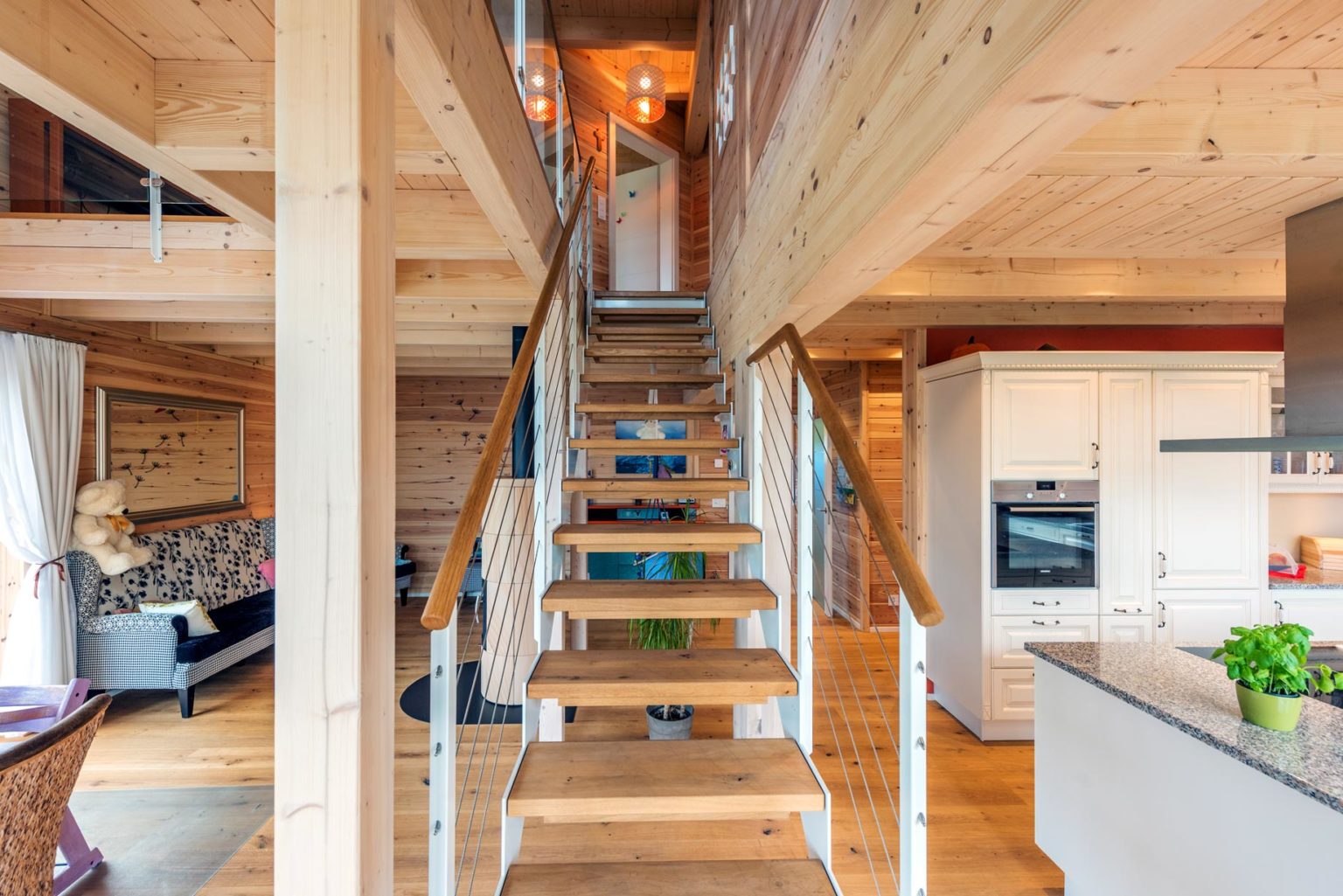 Neben dem großzügigen Wohnbereich gibt es im Erdgeschoss noch eine Diele, die als abgeschlossene Schleuse zwischen Hauseingang und Wohnbereich dient. Von der Diele gelangt man zudem in ein Gästezimmer und ein Gäste-Bad/WC. Über der Treppe und dem Esstisch beträgt die Raumhöhe fast 10 Meter und reicht bis zum sichtbaren First und dem offenen Dachstuhl. Der Blick nach oben ist beeindruckend und ermöglicht Dank der gläsernen Galeriebrüstung (mit Handlauf aus Holz) auch Einblick auf die gut natürlich belichtete Galerie im Obergeschoss. Von dort gelangt man in zwei Kinderzimmer, ein Schlafzimmer und ein Badezimmer – genügend Rückzugsmöglichkeiten also für vier Personen. Ergänzt wird das Raumprogramm im Holzhaus Oberthurgau noch von einem gemütlich und hell ausgebauten Spitzboden, von dem man ebenfalls durch die gläserne Brüstung hinab ins Obergeschoss und weiter hinunter ins Erdgeschoss schauen kann. Bewegung und Harmonie kann im ganzen Holzhaus frei fließen und Kommunikation in den dafür vorgesehen Bereichen ungehindert stattfinden. Dank Holz, Glas, natürlichem Licht und Gestaltungsgeschick herrscht eine ruhige und sanfte aber auch mit Frische und Energie geladene Atmosphäre im Holzhaus der Familie Kurmann. "Ich wollte so wohnen, als ob ich in den Bergen wohne.", gesteht Belinda Kurmann strahlend. Sie und ihr Mann genießen neben ihrem Holzhaus auch die herrliche Landschaft mit Blick auf den Bodensee und die Schweizer Alpen.