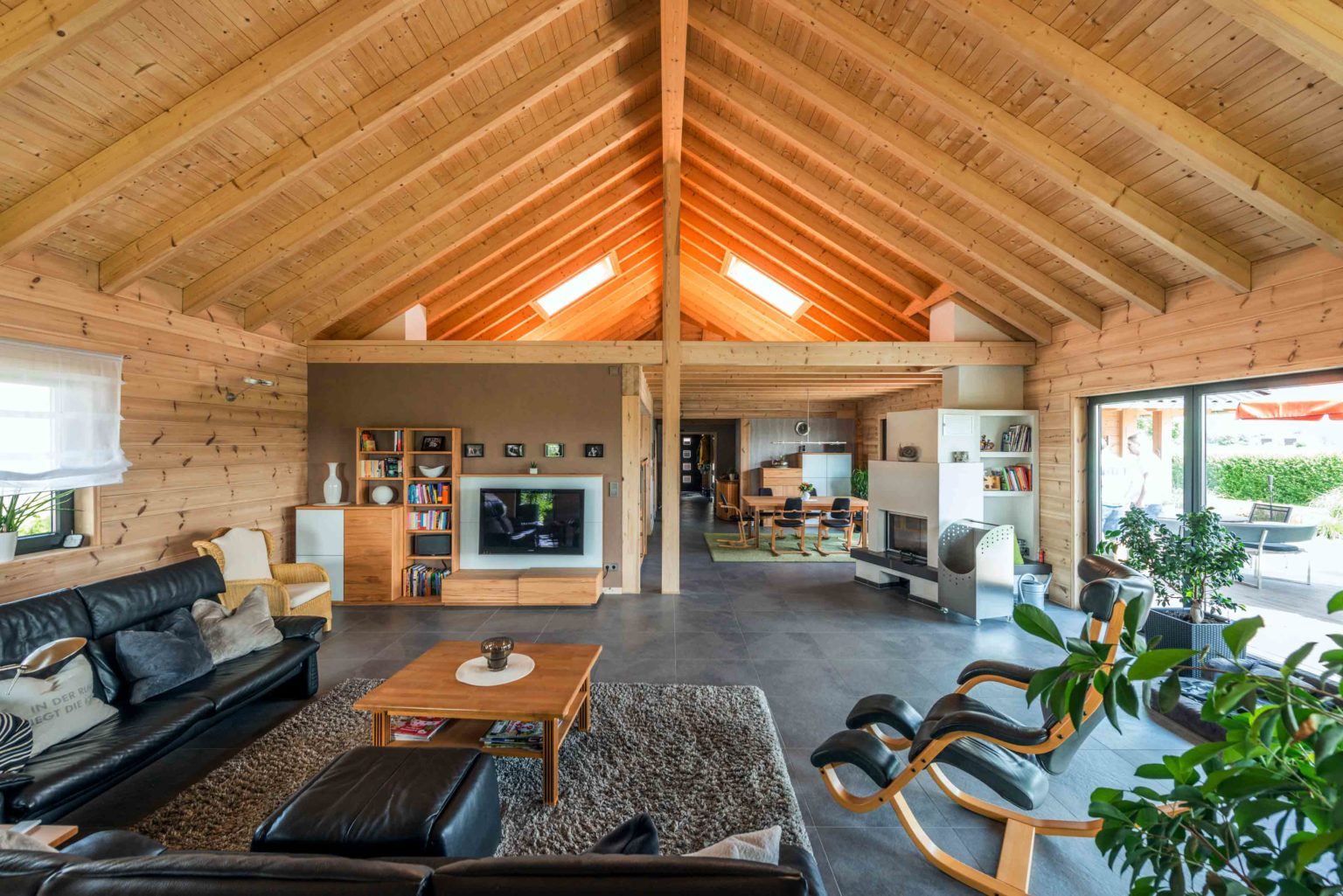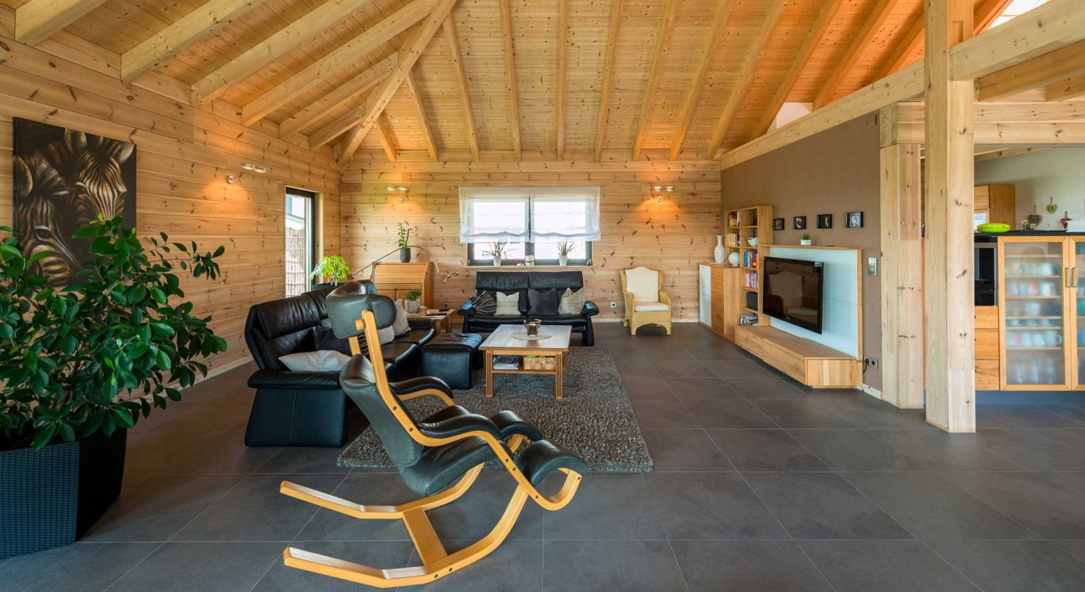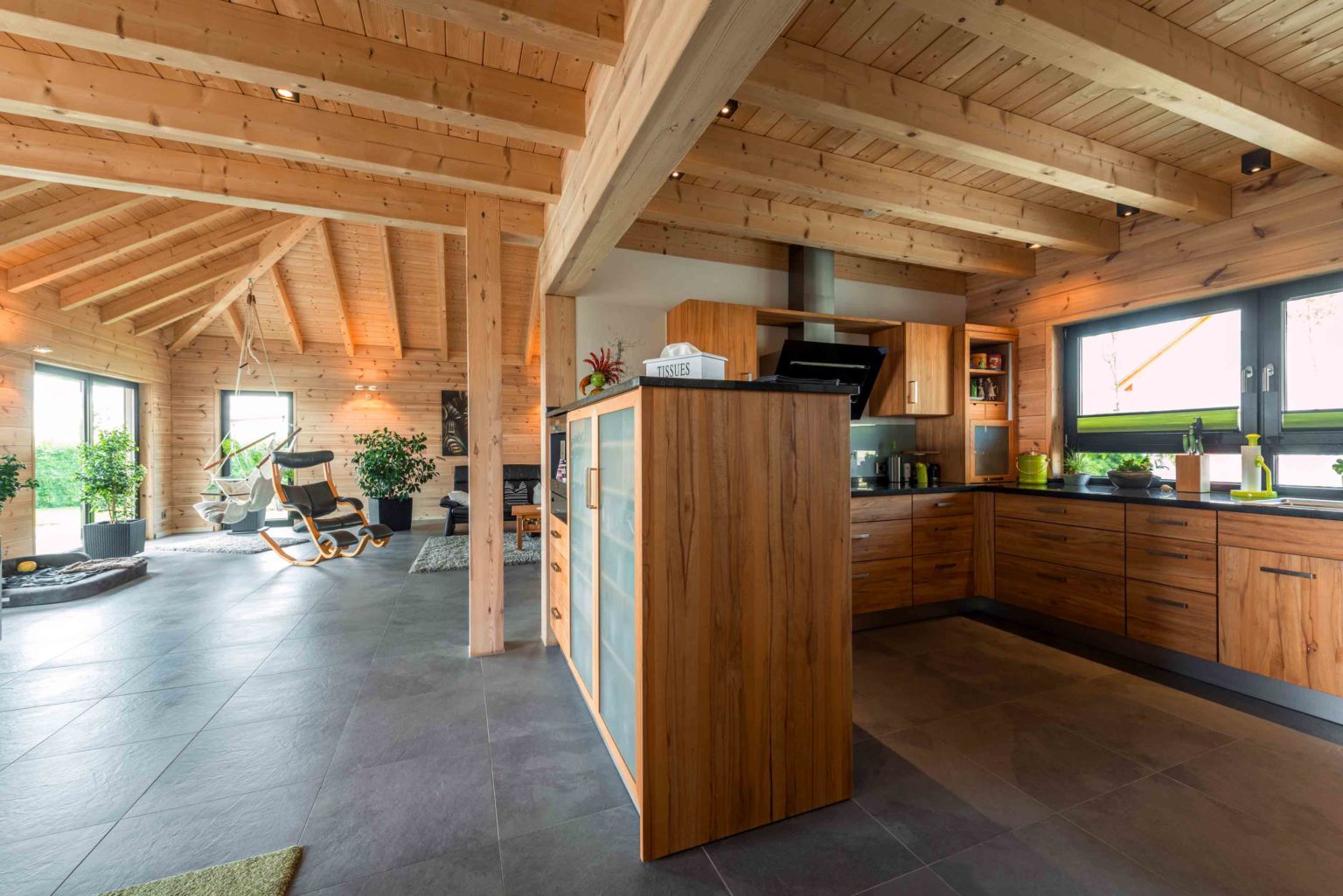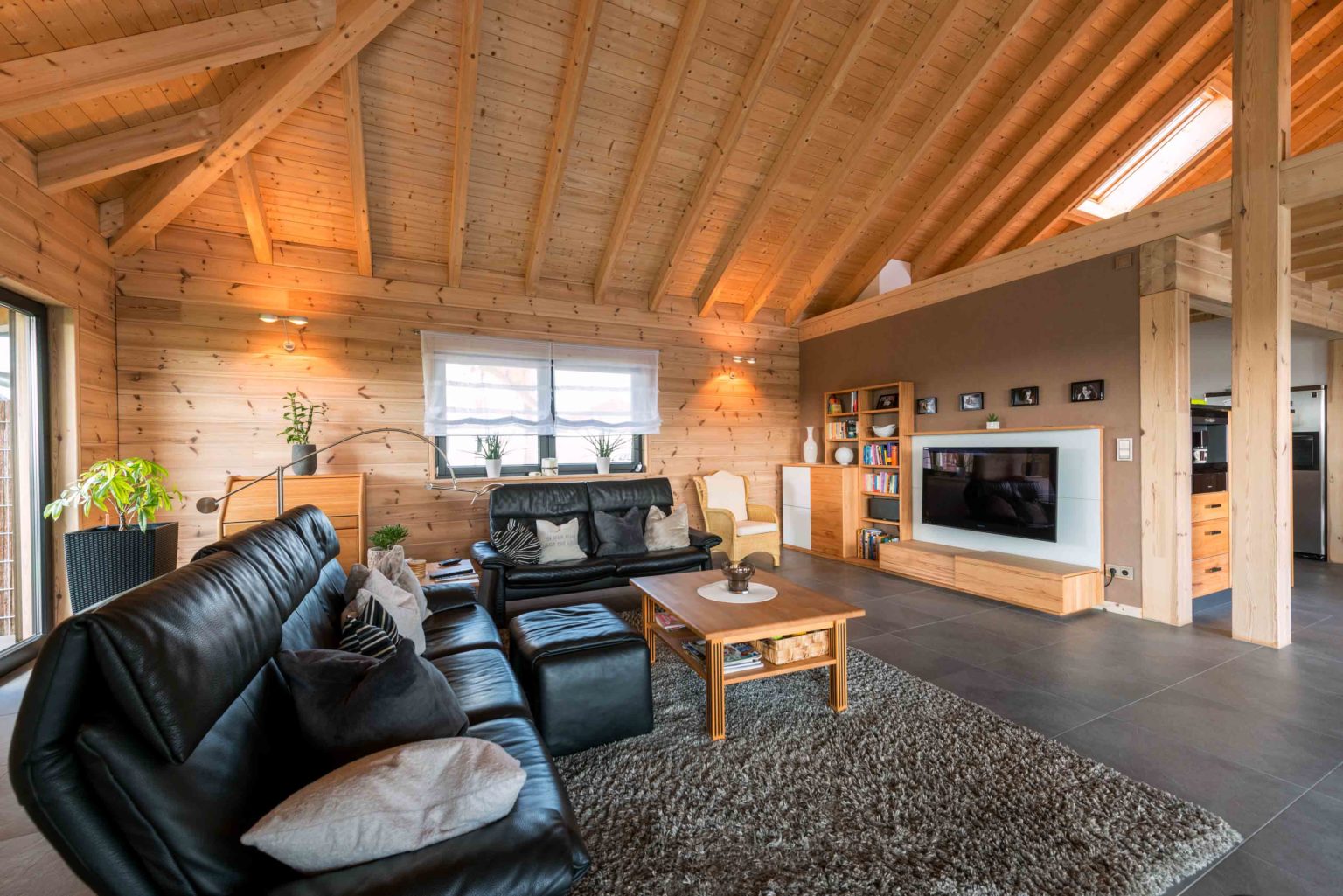 Damit das viele Holz im Innern nicht erdrückend wirkt, ließen die Hausbesitzer im gesamten, offenen Wohnzimmer und im Schlafzimmer einen hohen Luftraum, der sich bis zum Firstbalken öffnet. Über die restlichen Bereiche im Holzhaus spannt sich eine beeindruckende Holzbalkendecke, auf der sich eine als Stauraum genutzte riesige Galerie über die gesamte Hauslänge erstreckt. Dies ermöglicht einen beeindruckenden Blick vom Wohnzimmer hinauf zum offenen, imposanten Dachstuhl. Die wenigen Trennwände (Ständerbau) sind hell verputzt, und ergänzen die naturhellen Kiefernwände (sind mit UV-Schutz gegen Nachdunkeln behandelt) in sanften Erdfarben. Außerdem sind sie leicht versetzbar und bieten viel Variabilität für mögliche räumliche Änderungen. „Zuerst hatte ich Bedenken zu dem vielen Holz auch noch eine Holzküche zu kombinieren.“, gibt die Hauseigentümerin zu. „Aber jetzt bin ich froh, dass mich mein Mann und meine Söhne von der Küche aus Kernbuchenholz überzeugt haben.“ Als Fußbodenbelag entschied sich die Familie dann aber doch für Feinsteinfliesen in hell marmoriertem grau und für dunkelbraune Fliesen in Holzdielenoptik im Bad – lediglich im Schlafzimmer schmeicheln helle, fußwarme Holzdielen den nackten Sohlen. Auch sämtliche Türen, außer denjenigen zum Bad und zum Gäste-WC, sind nicht aus Holz sondern aus modern wirkendem, lichtdurchlässigem Glas. Bodentiefe, schwarz gerahmte Fenster lassen, unterstützt von Dachfenstern, reichlich Tageslicht ins Hausinnere.