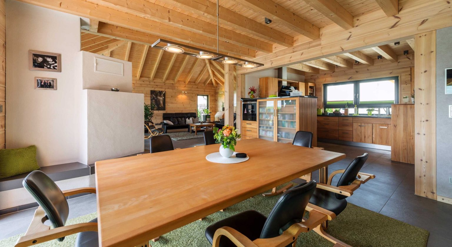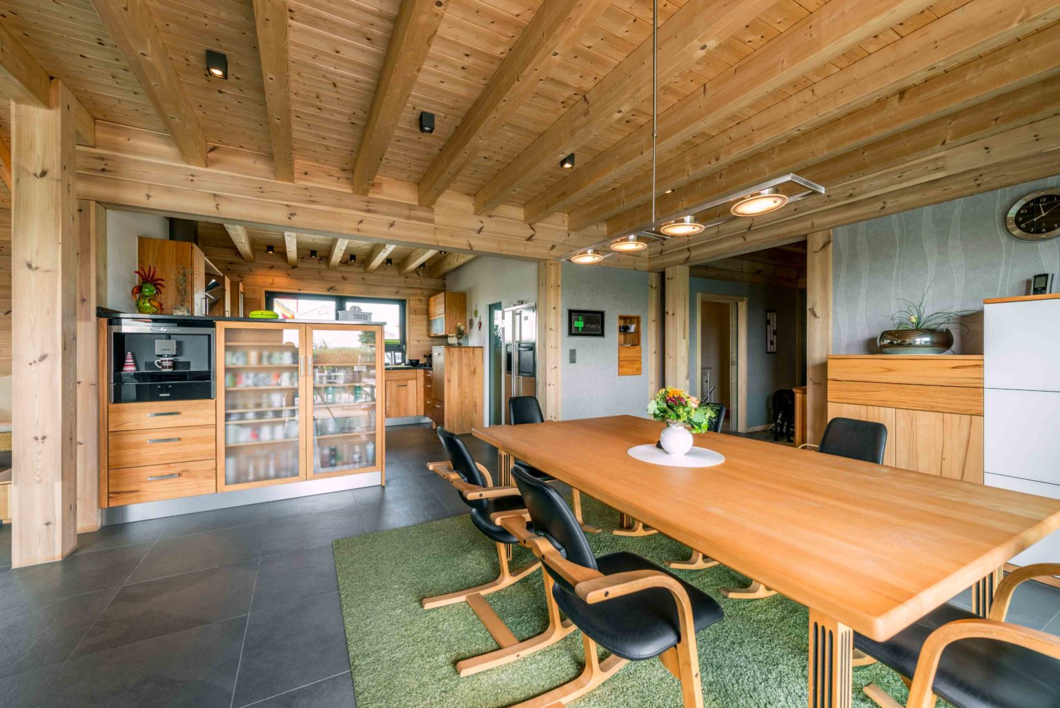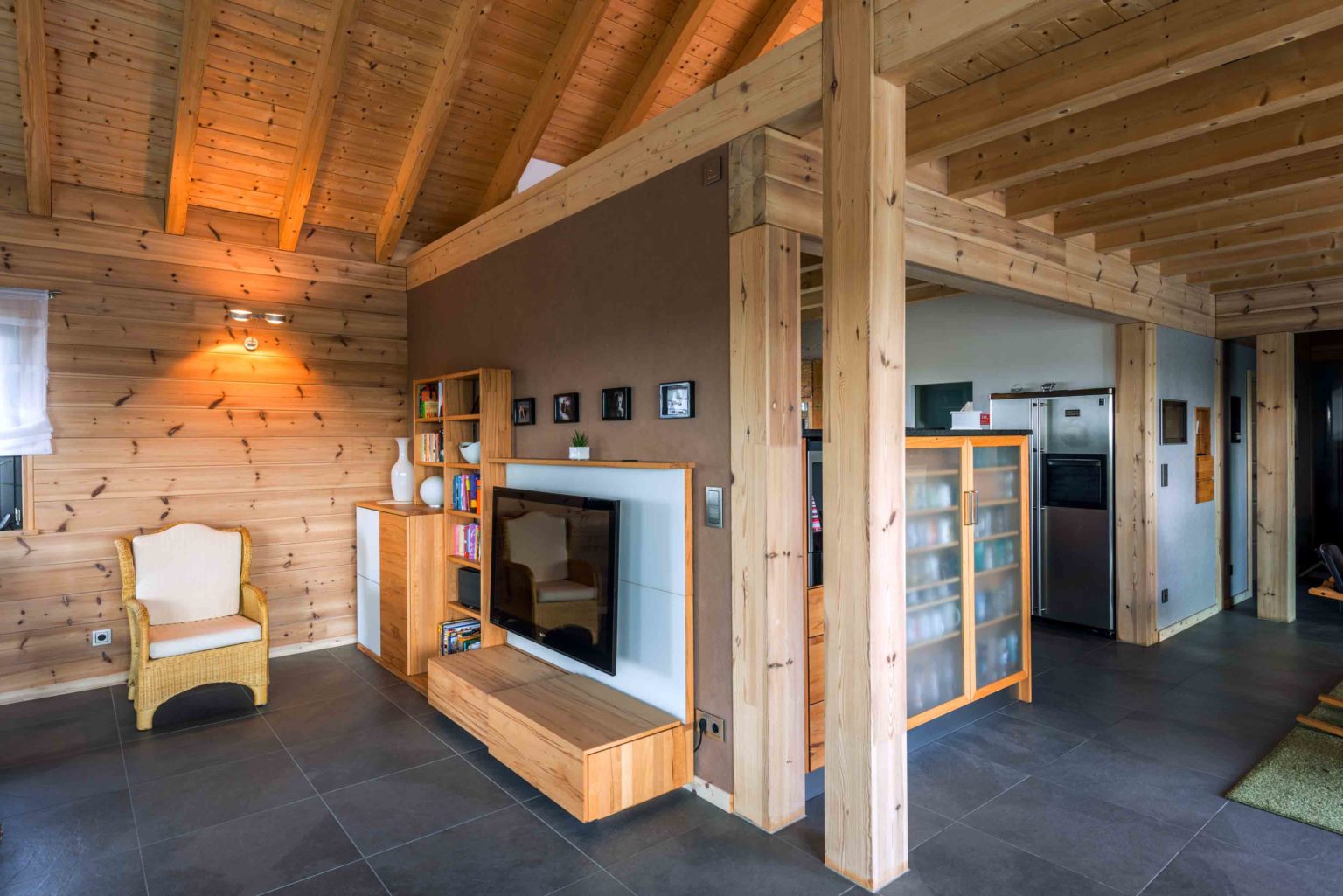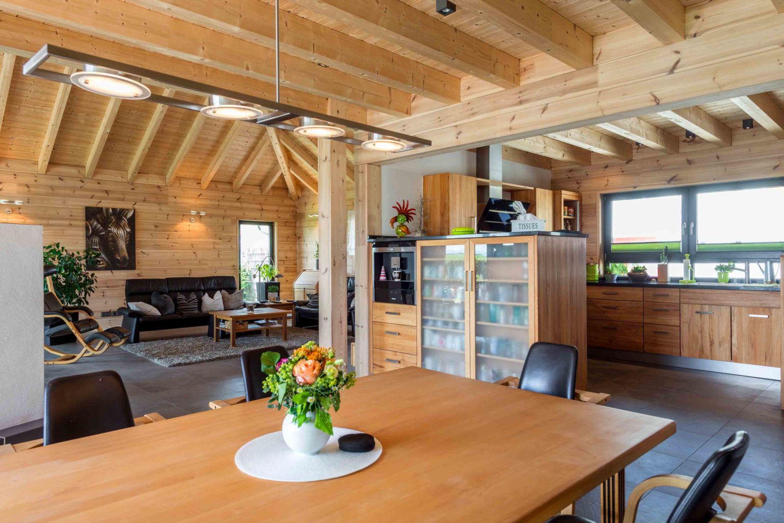 Damit das viele Holz im Innern nicht erdrückend wirkt, ließen die Hausbesitzer im gesamten, offenen Wohnzimmer und im Schlafzimmer einen hohen Luftraum, der sich bis zum Firstbalken öffnet. Über die restlichen Bereiche im Holzhaus spannt sich eine beeindruckende Holzbalkendecke, auf der sich eine als Stauraum genutzte riesige Galerie über die gesamte Hauslänge erstreckt. Dies ermöglicht einen beeindruckenden Blick vom Wohnzimmer hinauf zum offenen, imposanten Dachstuhl. Die wenigen Trennwände (Ständerbau) sind hell verputzt, und ergänzen die naturhellen Kiefernwände (sind mit UV-Schutz gegen Nachdunkeln behandelt) in sanften Erdfarben. Außerdem sind sie leicht versetzbar und bieten viel Variabilität für mögliche räumliche Änderungen. „Zuerst hatte ich Bedenken zu dem vielen Holz auch noch eine Holzküche zu kombinieren.“, gibt die Hauseigentümerin zu. „Aber jetzt bin ich froh, dass mich mein Mann und meine Söhne von der Küche aus Kernbuchenholz überzeugt haben.“ Als Fußbodenbelag entschied sich die Familie dann aber doch für Feinsteinfliesen in hell marmoriertem grau und für dunkelbraune Fliesen in Holzdielenoptik im Bad – lediglich im Schlafzimmer schmeicheln helle, fußwarme Holzdielen den nackten Sohlen. Auch sämtliche Türen, außer denjenigen zum Bad und zum Gäste-WC, sind nicht aus Holz sondern aus modern wirkendem, lichtdurchlässigem Glas. Bodentiefe, schwarz gerahmte Fenster lassen, unterstützt von Dachfenstern, reichlich Tageslicht ins Hausinnere.