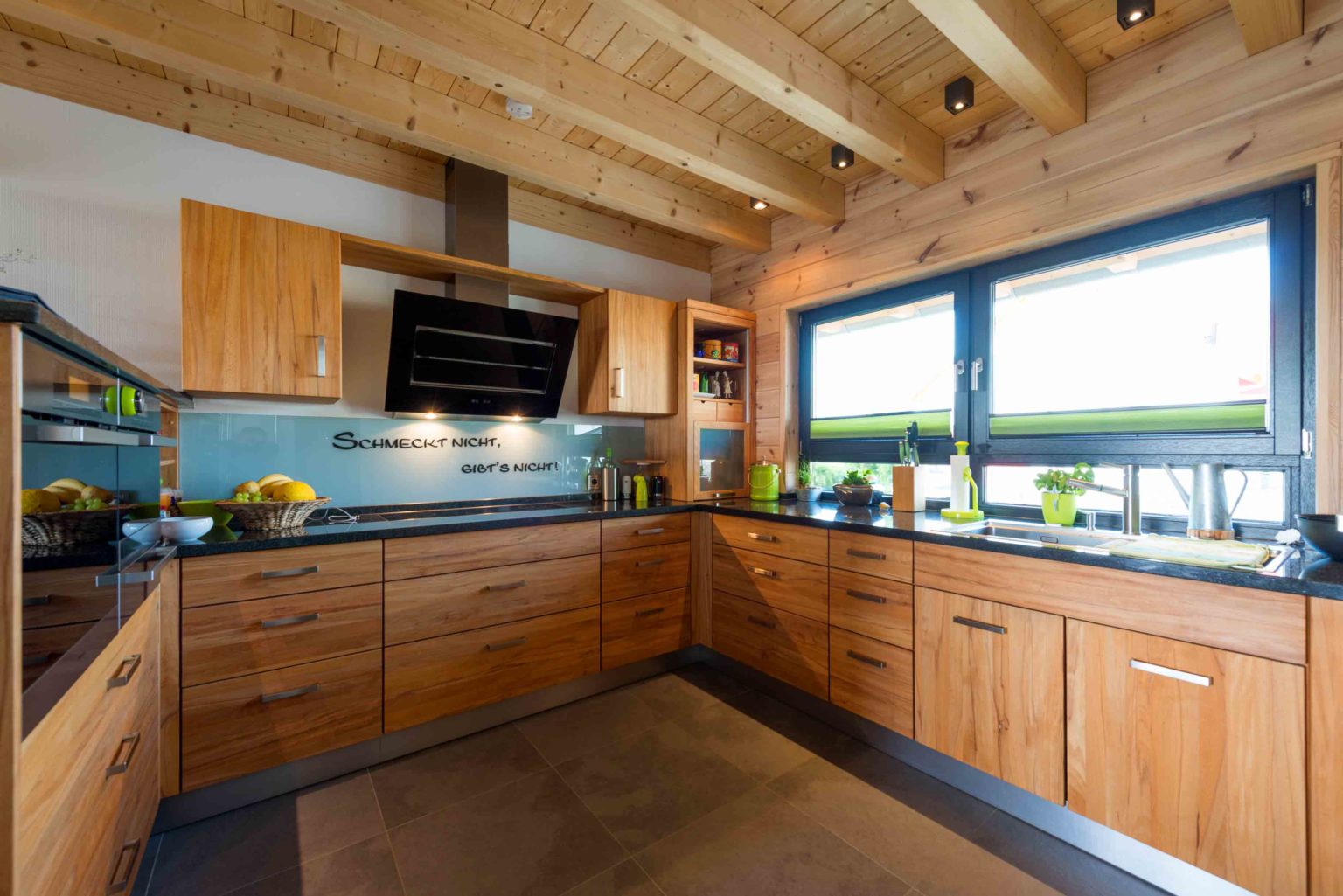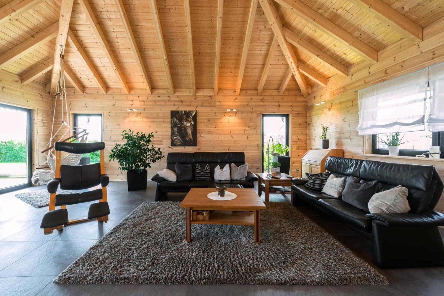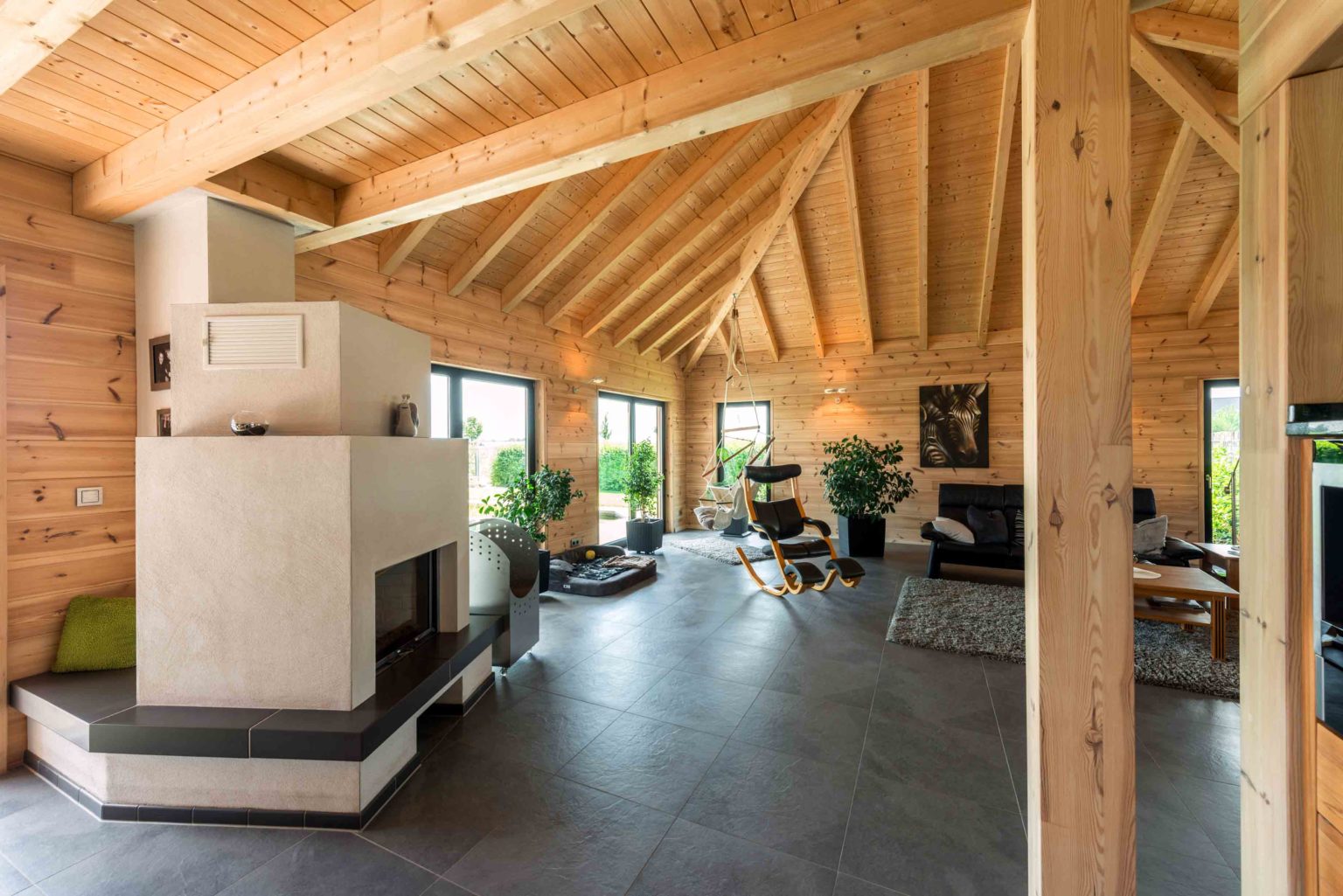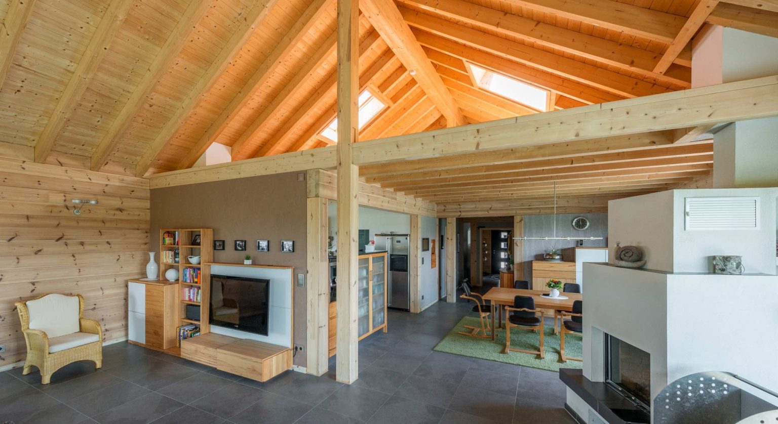 Damit das viele Holz im Innern nicht erdrückend wirkt, ließen die Hausbesitzer im gesamten, offenen Wohnzimmer und im Schlafzimmer einen hohen Luftraum, der sich bis zum Firstbalken öffnet. Über die restlichen Bereiche im Holzhaus spannt sich eine beeindruckende Holzbalkendecke, auf der sich eine als Stauraum genutzte riesige Galerie über die gesamte Hauslänge erstreckt. Dies ermöglicht einen beeindruckenden Blick vom Wohnzimmer hinauf zum offenen, imposanten Dachstuhl. Die wenigen Trennwände (Ständerbau) sind hell verputzt, und ergänzen die naturhellen Kiefernwände (sind mit UV-Schutz gegen Nachdunkeln behandelt) in sanften Erdfarben. Außerdem sind sie leicht versetzbar und bieten viel Variabilität für mögliche räumliche Änderungen. „Zuerst hatte ich Bedenken zu dem vielen Holz auch noch eine Holzküche zu kombinieren.“, gibt die Hauseigentümerin zu. „Aber jetzt bin ich froh, dass mich mein Mann und meine Söhne von der Küche aus Kernbuchenholz überzeugt haben.“ Als Fußbodenbelag entschied sich die Familie dann aber doch für Feinsteinfliesen in hell marmoriertem grau und für dunkelbraune Fliesen in Holzdielenoptik im Bad – lediglich im Schlafzimmer schmeicheln helle, fußwarme Holzdielen den nackten Sohlen. Auch sämtliche Türen, außer denjenigen zum Bad und zum Gäste-WC, sind nicht aus Holz sondern aus modern wirkendem, lichtdurchlässigem Glas. Bodentiefe, schwarz gerahmte Fenster lassen, unterstützt von Dachfenstern, reichlich Tageslicht ins Hausinnere.