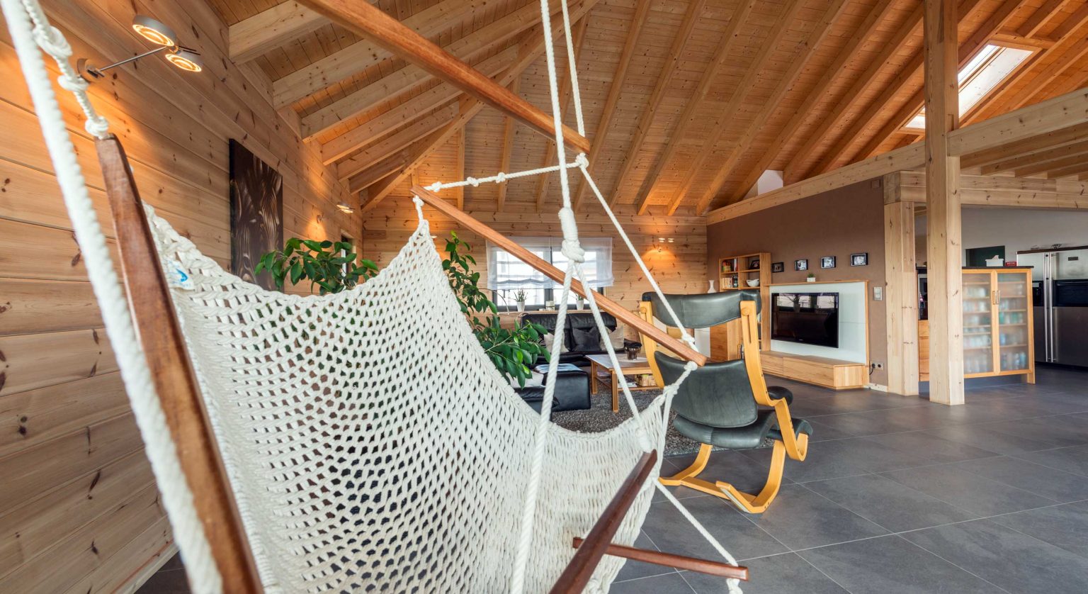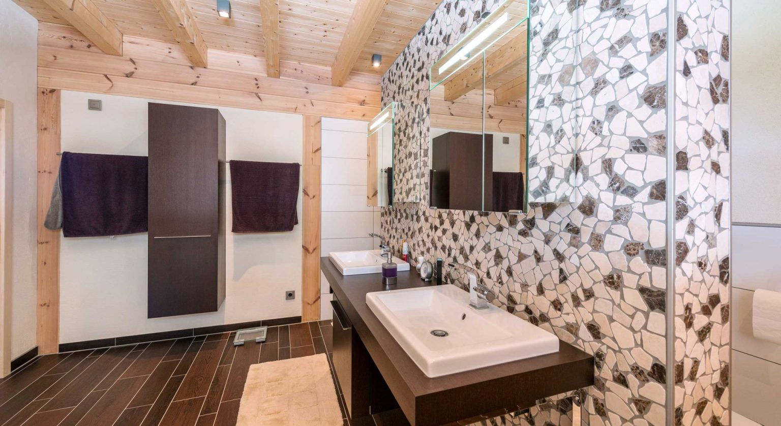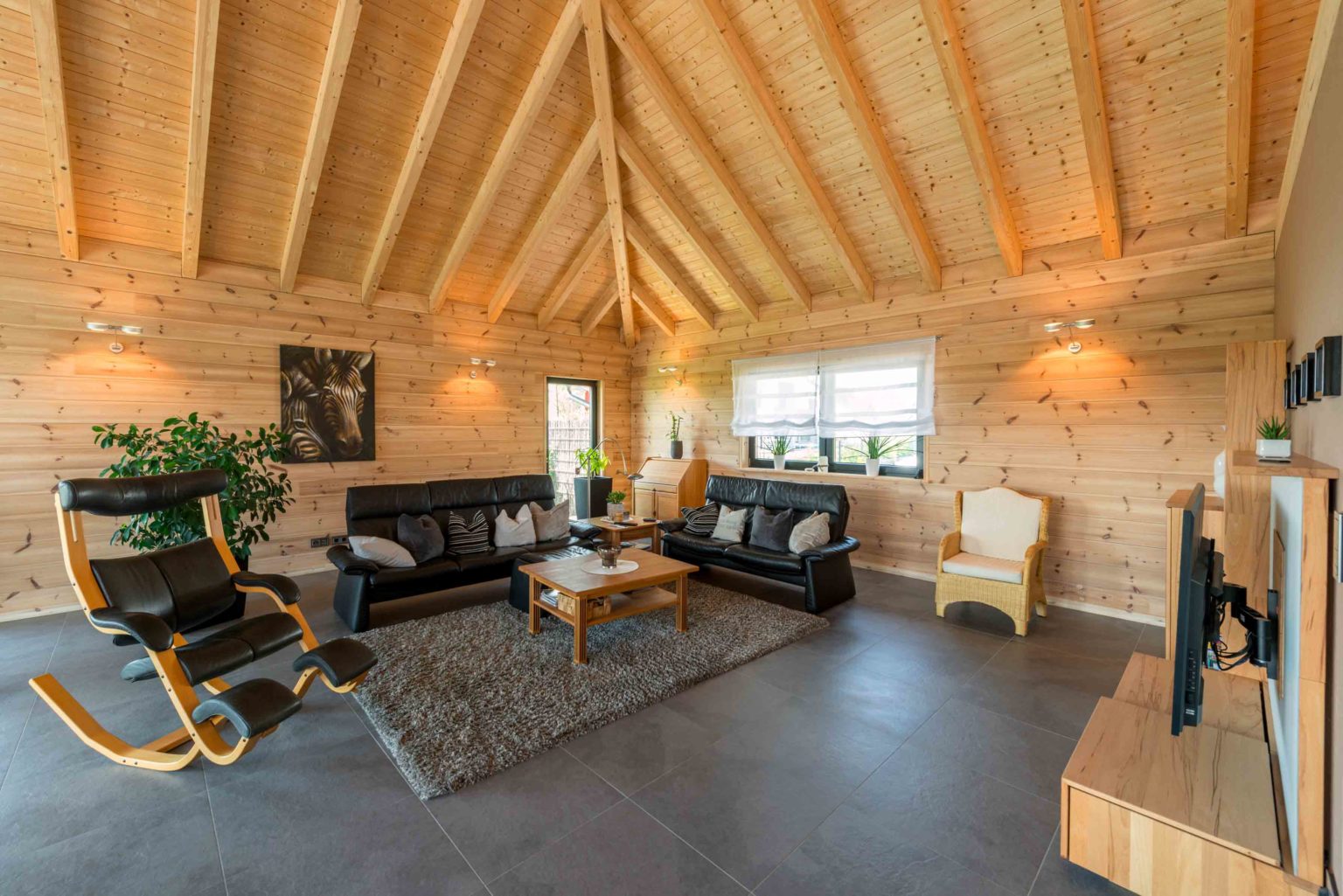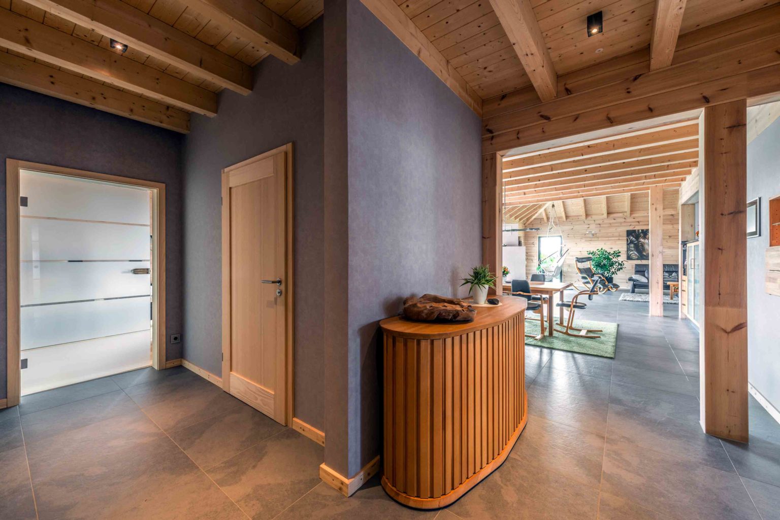 Damit das viele Holz im Innern nicht erdrückend wirkt, ließen die Hausbesitzer im gesamten, offenen Wohnzimmer und im Schlafzimmer einen hohen Luftraum, der sich bis zum Firstbalken öffnet. Über die restlichen Bereiche im Holzhaus spannt sich eine beeindruckende Holzbalkendecke, auf der sich eine als Stauraum genutzte riesige Galerie über die gesamte Hauslänge erstreckt. Dies ermöglicht einen beeindruckenden Blick vom Wohnzimmer hinauf zum offenen, imposanten Dachstuhl. Die wenigen Trennwände (Ständerbau) sind hell verputzt, und ergänzen die naturhellen Kiefernwände (sind mit UV-Schutz gegen Nachdunkeln behandelt) in sanften Erdfarben. Außerdem sind sie leicht versetzbar und bieten viel Variabilität für mögliche räumliche Änderungen. „Zuerst hatte ich Bedenken zu dem vielen Holz auch noch eine Holzküche zu kombinieren.“, gibt die Hauseigentümerin zu. „Aber jetzt bin ich froh, dass mich mein Mann und meine Söhne von der Küche aus Kernbuchenholz überzeugt haben.“ Als Fußbodenbelag entschied sich die Familie dann aber doch für Feinsteinfliesen in hell marmoriertem grau und für dunkelbraune Fliesen in Holzdielenoptik im Bad – lediglich im Schlafzimmer schmeicheln helle, fußwarme Holzdielen den nackten Sohlen. Auch sämtliche Türen, außer denjenigen zum Bad und zum Gäste-WC, sind nicht aus Holz sondern aus modern wirkendem, lichtdurchlässigem Glas. Bodentiefe, schwarz gerahmte Fenster lassen, unterstützt von Dachfenstern, reichlich Tageslicht ins Hausinnere.