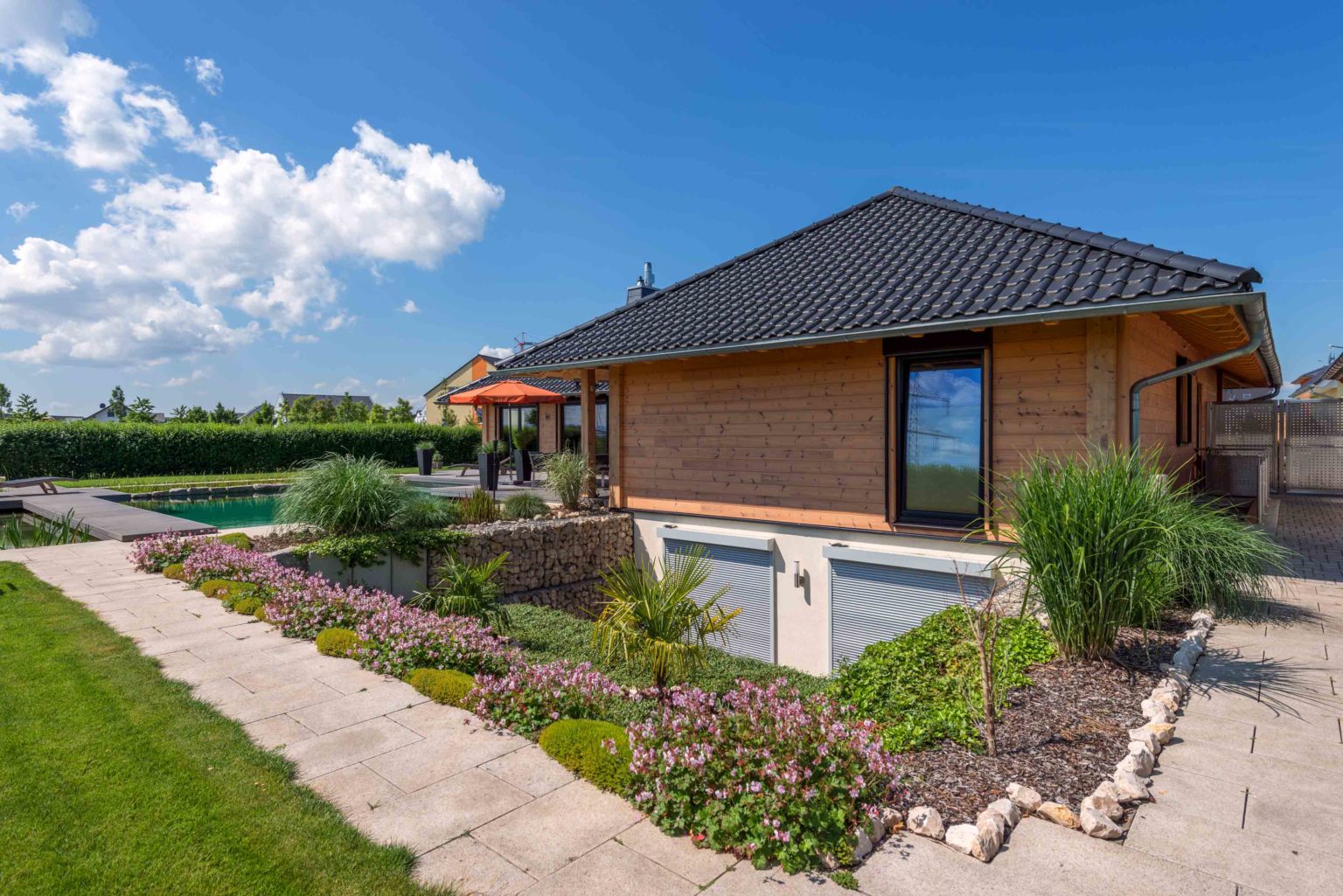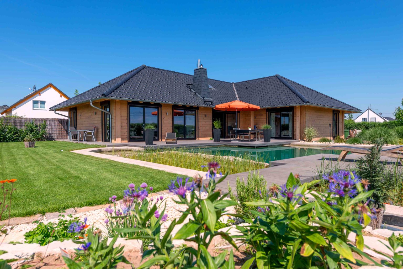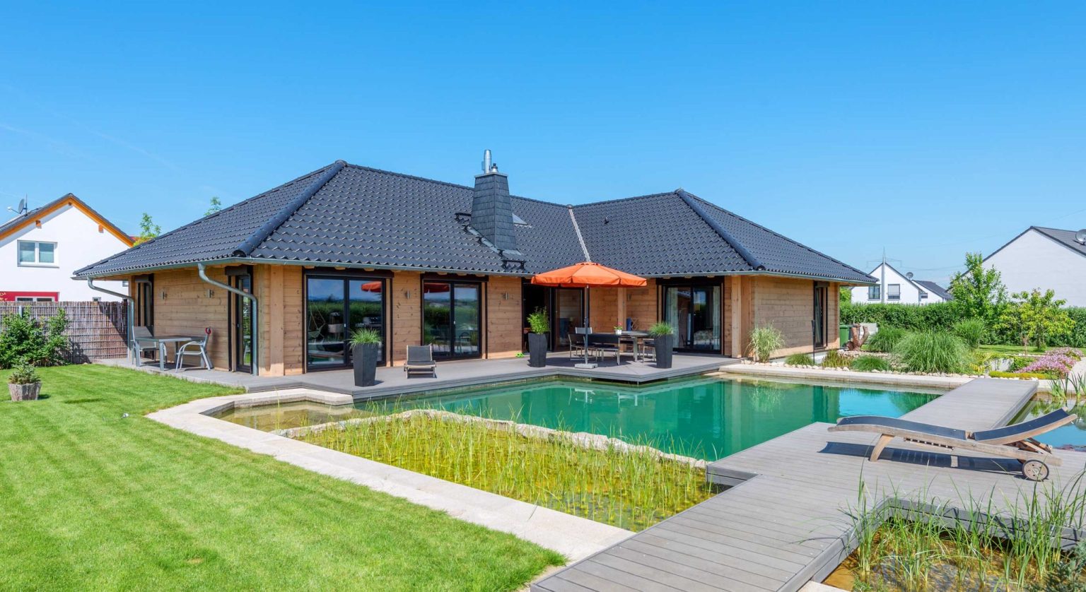 Wohl dem, der sich zu Hause wie im Urlaub fühlen kann. Die Eigentümer von Holzhaus „Odenwaldblick“ wollen jedenfalls gar nicht mehr verreisen, so gut gefällt es ihnen in ihrem schönen, nach Süden ausgerichteten Bungalow mit dem großen Schwimmteich im weitläufigen Garten und dem unverbaubaren Blick auf die grünen Höhen des Odenwalds. Dank der vielen Annehmlichkeiten im Holzhaus, wie beispielsweise dem „BUS“ zur Steuerung von Licht, Strom und Jalousien via Touchpad und Smartphone, und dem hohen Komfort der exklusiv gestalteten, sehr großflächigen Räume, könnte es in keinem Hotel bequemer sein. Selbst der Schwimmteich macht hauptsächlich Freude und kaum Arbeit, da er eine Umwälzanlage hat, also selbstreinigend ist. „Wir würden vor allem den feinen Kiefernduft und die angenehme Atmosphäre, die von den Massivholzwänden ausgeht, vermissen.“, sagt die Hausherrin. Auch an das wohngesunde Raumklima haben sie und ihr Mann sich schnell gewöhnt. Dabei kam das Ehepaar eher zufällig auf die Idee überhaupt ein massives Holzhaus zu bauen. „Nachdem wir auf einem Hausaustellungsgelände ein Holzhaus gesehen und von innen besichtigt hatten, waren wir gleich begeistert von dieser Art zu bauen und recherchierten ausführlich in Zeitschriften und im Internet.“, erzählt der Hausherr. Schließlich fanden die Hausbauinteressenten ein Wohnholzhaus von Fullwood in einer Zeitschrift, das ihnen wegen seiner modernen, hellen Optik und den glatten Wänden auffiel. „Holz als natürlicher Baustoff gefällt mir sehr, aber ein Rundstammhaus wäre mir persönlich zu rustikal.“, meint die Hausherrin und ihr Mann ergänzt: „Wichtig war uns auch, dass es massives Holz ist, ganz ohne Dämmung.“ Deshalb entschied sich das Ehepaar dann für die luxuriöse, extra dicke 27-er Vollholzwand von Fullwood, die aus skandinavischer Kiefer besteht und – dank Fertigkonstruktion - sowohl setzungsfrei als auch winddicht ist.