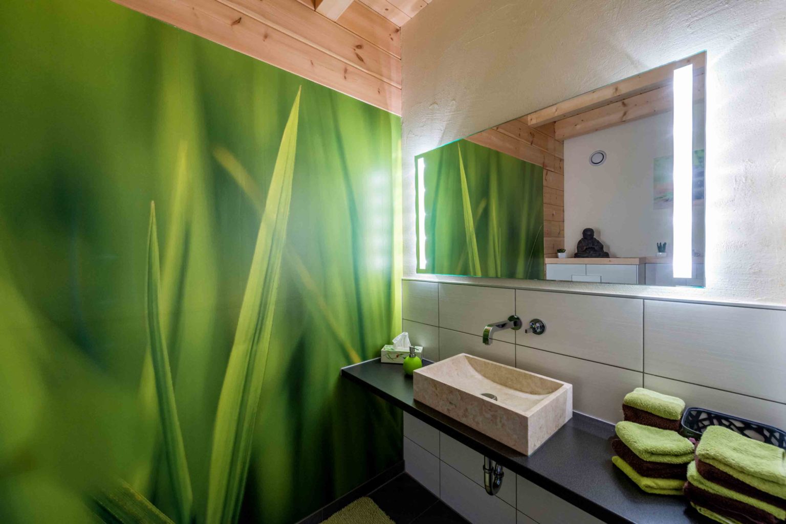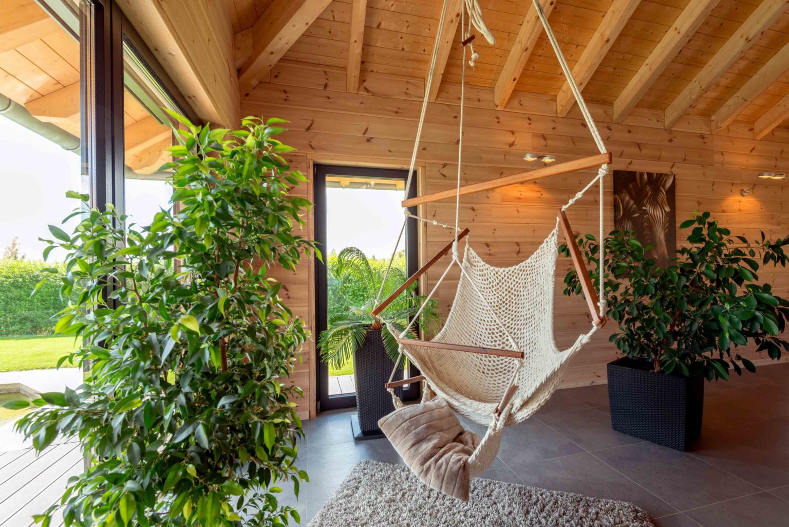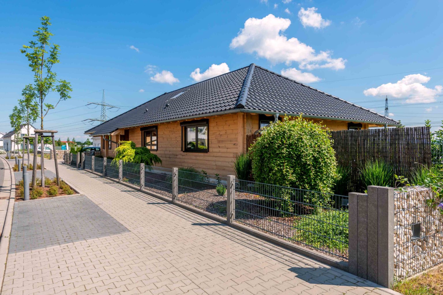 Wohl dem, der sich zu Hause wie im Urlaub fühlen kann. Die Eigentümer von Holzhaus „Odenwaldblick“ wollen jedenfalls gar nicht mehr verreisen, so gut gefällt es ihnen in ihrem schönen, nach Süden ausgerichteten Bungalow mit dem großen Schwimmteich im weitläufigen Garten und dem unverbaubaren Blick auf die grünen Höhen des Odenwalds. Dank der vielen Annehmlichkeiten im Holzhaus, wie beispielsweise dem „BUS“ zur Steuerung von Licht, Strom und Jalousien via Touchpad und Smartphone, und dem hohen Komfort der exklusiv gestalteten, sehr großflächigen Räume, könnte es in keinem Hotel bequemer sein. Selbst der Schwimmteich macht hauptsächlich Freude und kaum Arbeit, da er eine Umwälzanlage hat, also selbstreinigend ist. „Wir würden vor allem den feinen Kiefernduft und die angenehme Atmosphäre, die von den Massivholzwänden ausgeht, vermissen.“, sagt die Hausherrin. Auch an das wohngesunde Raumklima haben sie und ihr Mann sich schnell gewöhnt. Dabei kam das Ehepaar eher zufällig auf die Idee überhaupt ein massives Holzhaus zu bauen. „Nachdem wir auf einem Hausaustellungsgelände ein Holzhaus gesehen und von innen besichtigt hatten, waren wir gleich begeistert von dieser Art zu bauen und recherchierten ausführlich in Zeitschriften und im Internet.“, erzählt der Hausherr. Schließlich fanden die Hausbauinteressenten ein Wohnholzhaus von Fullwood in einer Zeitschrift, das ihnen wegen seiner modernen, hellen Optik und den glatten Wänden auffiel. „Holz als natürlicher Baustoff gefällt mir sehr, aber ein Rundstammhaus wäre mir persönlich zu rustikal.“, meint die Hausherrin und ihr Mann ergänzt: „Wichtig war uns auch, dass es massives Holz ist, ganz ohne Dämmung.“ Deshalb entschied sich das Ehepaar dann für die luxuriöse, extra dicke 27-er Vollholzwand von Fullwood, die aus skandinavischer Kiefer besteht und – dank Fertigkonstruktion - sowohl setzungsfrei als auch winddicht ist.