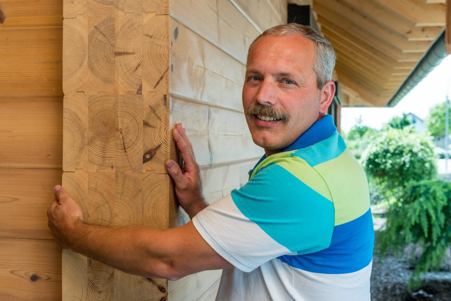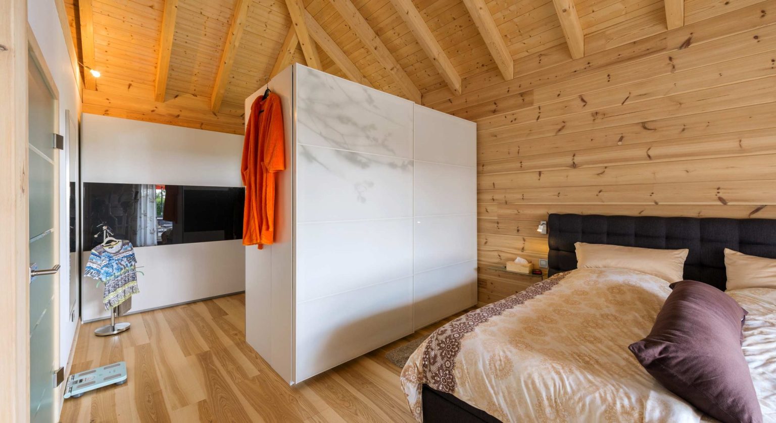 Die Hauseigentümer heizen teilweise mit Gas. Unterstützt wird ihre Fußbodenheizung zu gleichen Teilen von einem imposanten, wasserführenden Kamin, der ebenfalls das Brauchwasser erwärmt, auch für die Fußbodenheizung. Gleichzeitig ist der Kamin sehr dekorativ und gewährt faszinierende Blicke in lodernde Flammen. Seine Strahlungswärme dringt in alle Ecken des offenen Wohnbereichs vor. „Im Winter profitieren wir nicht nur von den sehr gut dämmenden, dicken Vollholzwänden, sondern auch von der gefühlt höheren Temperatur, die diese erzeugen. Diese wissenschaftlich nachgewiesene Tatsache spüren wir wirklich am eigenen Leib.“, meint der Hausherr. Aufpassen mussten er und seine Frau besonders bei der Planung der Elektrik, denn schon im Werk werden in die Massivholzwände Kanäle für die späteren Leitungen gebohrt. Nachträglich wären nur noch Leitungen auf dem Holz möglich gewesen, was es natürlich zu vermeiden gilt. Besonders erwähnenswerte Planungsideen sind auch: Der Nebeneingang an der Nordseite, der einen kurzen Weg vom Auto ins Haus bietet; der dem Nebeneingang benachbarte Hauswirtschaftsraum; der direkte Zugang vom Schlafzimmer zur Terrasse und zum Schwimmteich, der den Sprung ins erfrischende Nass bereits unmittelbar nach dem Aufstehen ermöglicht; die dem Schlafzimmer angeschlossene Ankleide mit direkter Anbindung ans Bad (mit Durchgang zum kleinen Flur); der im geschlossenen Windfang (Haupteingang) befindliche Abgang in den Wohn-Keller (dort residieren die erwachsenen Söhne der Familie, weshalb ein großer Lichtschacht vor den Kellerfenstern ausgehoben wurde); sowie die an die offene Küche angeschlossene, geräumige Speisekammer mit praktischer Schiebetür. Damit die Holzwände auch außen immer schön hell bleiben, bekamen sie einen Schutzanstrich mit wenigen weißen Pigmenten, die das Ganze noch einen Tick aufhellen und gleichzeitig die schöne Holzmaserung sichtbar lassen.