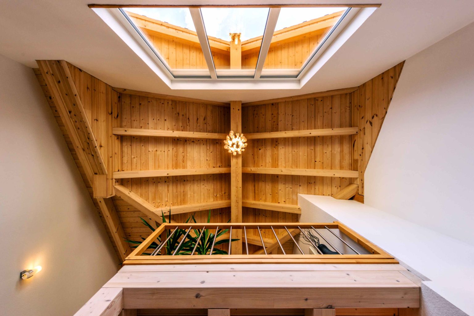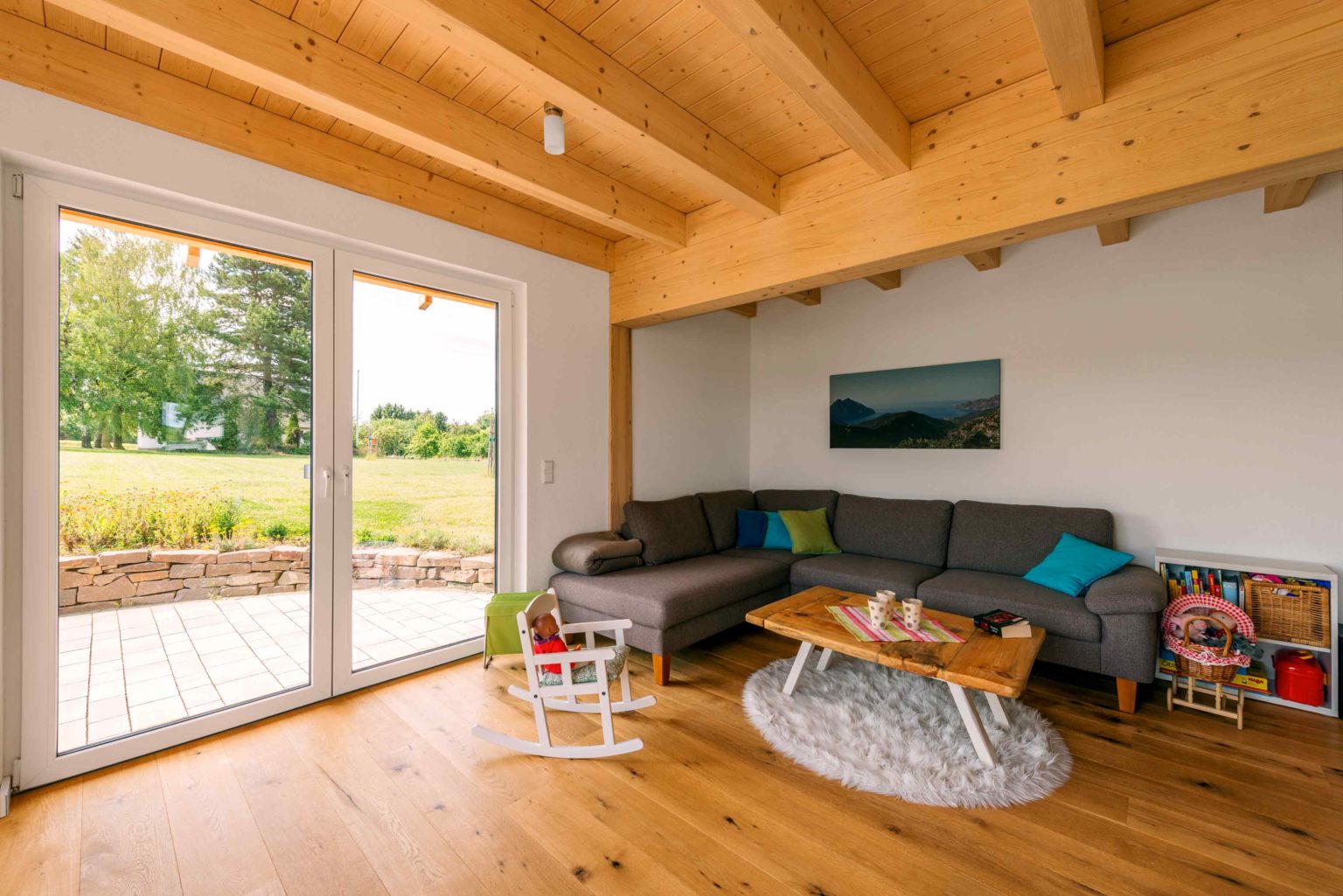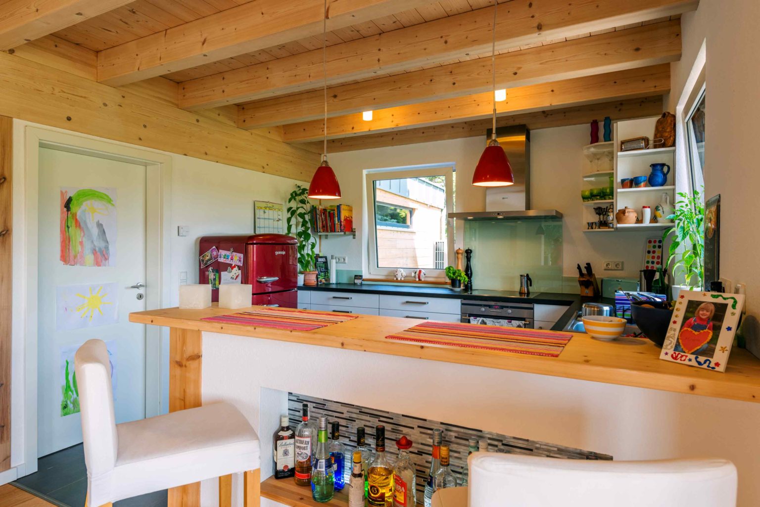 Das Raumangebot von Holzhaus „Ölbergblick“ ist für eine vierköpfige Familie großzügig bemessen. Im Erdgeschoss befinden sich neben dem Eingangsbereich und dem davon durch eine Tür getrennten, offenen Wohnbereich noch ein Gäste-WC und ein der Küche angeschlossener Hauswirtschaftsraum. Von der Diele aus führt eine halb gewendelte Buchenholztreppe mit Edelstahlrohrgeländer und den Händen schmeichelnden Holzhandlauf ins Obergeschoss. Dort betritt man zuerst eine Galerie und gelangt von dort zu zwei Kinderzimmern, einem Schlafzimmer, einem großen Badezimmer und dem Büro des Hausherrn. Der wohnt nämlich nicht nur in seinem Traumhaus, sondern darf dort auch öfter arbeiten. Alle Räume im Obergeschoss sind bis zum Firstbalken offen und vermitteln dadurch ein großzügiges, unbeschwertes Raumgefühl. Bis auf die spontane Bauchentscheidung ganz zu Anfang, überhaupt ein Holzhaus zu bauen, wurde beim Planen und Bauen an sich nichts dem Zufall überlassen, und alles sachlich und genau durchdacht. Beste Voraussetzungen für eine glückliche Wohn-Zeit also.