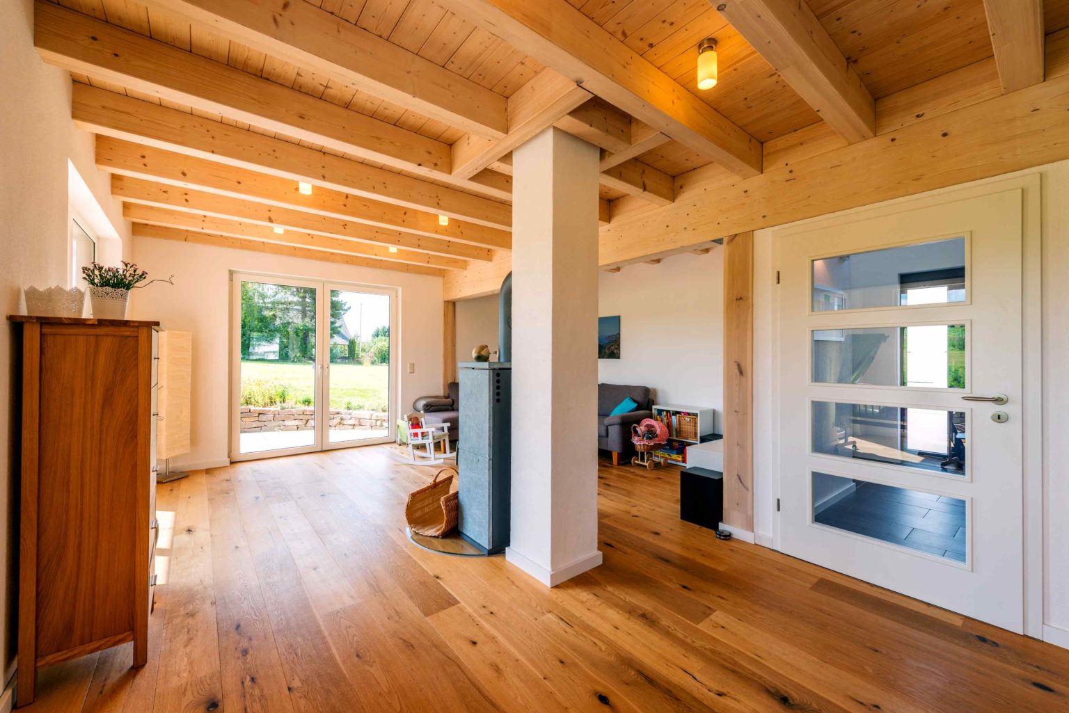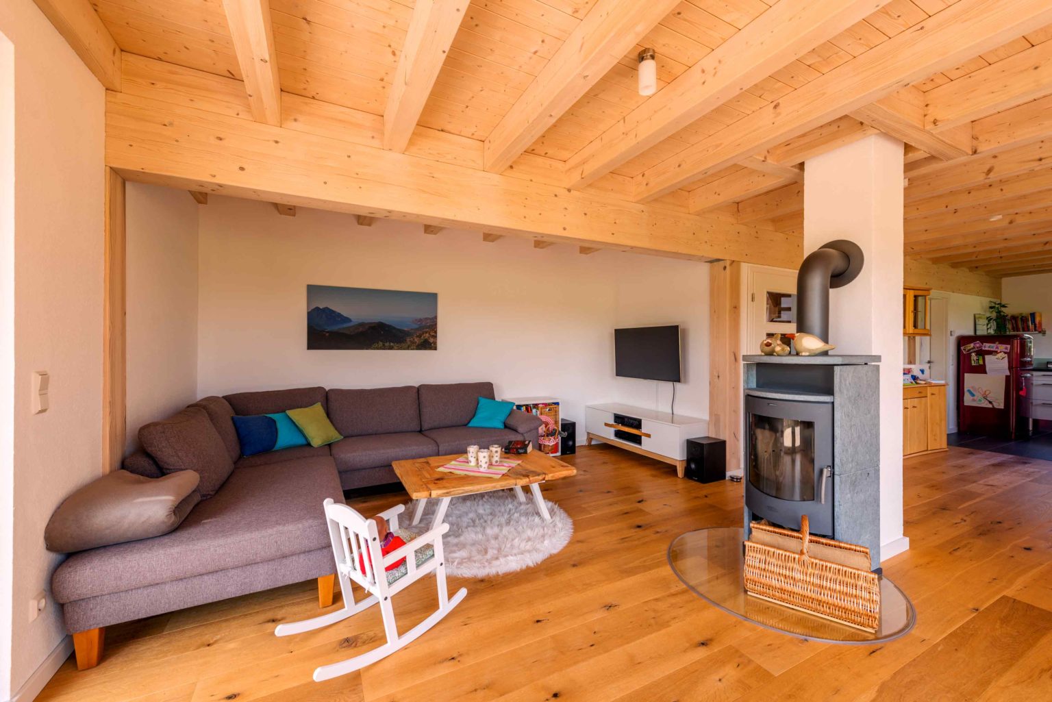 Dank der hervorragenden Dämmeigenschaften ihrer Hauswände, benötigen Nadja und Oskar Licht wenig Heizenergie. Zudem „wärmen“ die vielen Holzelemente im Haus, wie offene Balkendecke und Eichendielenboden, zusätzlich. Es ist wissenschaftlich bewiesen, dass die gefühlte Temperatur in einer Holzumgebung etwa 2 Grad höher ist, als in anderer Umgebung. Die höhere Oberflächentemperatur von Holz spielt da sicherlich auch eine Rolle. „Unser Eichenfußboden ist immer fußwarm und niemals so kalt wie Fliesen. Daher schmeißen wir die Fußbodenheizung nur bei niedrigen Wintertemperaturen an. Ansonsten heizen wir den Wohnbereich am liebsten mit unserem Kaminofen, das ist schön gemütlich.“, sagt Nadja. Die perfekt isolierende Aufdachdämmung und die Wärmeschutzfenster leisten ebenso ihren Beitrag zur Wärmeeffizienz.