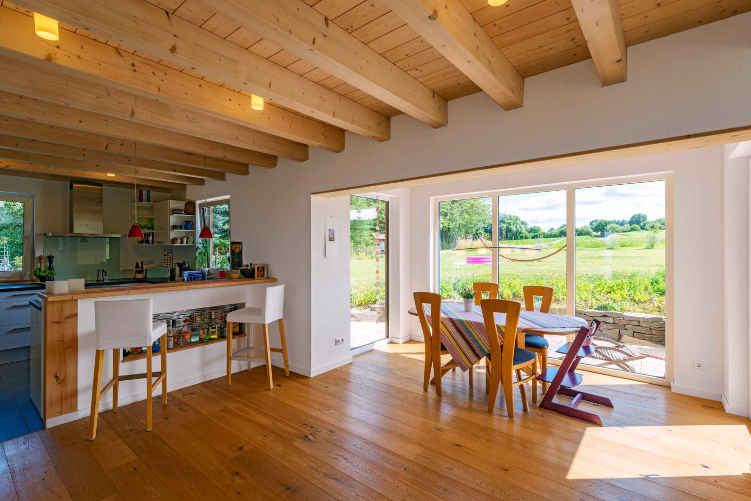 Neben dem hellen Wohnambiente, mit weißen Fensterrahmen - außen sind sie passend zum Dach anthrazit - vielen weißen Wandflächen und großen, bodentiefen Fenstern - die reichlich natürliches Licht hereinlassen -, legte das Ehepaar Wert auf große Flächen, auf denen sich die ganze Familie ungehindert bewegen kann. Der Wohnbereich wurde offen geplant: Küche, Esszimmer und Wohnzimmer fließen in einem großen Raum ineinander über, so dass ungehinderte Kommunikation mit Familie und Gästen stattfinden kann, und das gemeinsame Leben zelebriert wird. Auch der Flur ist offen gehalten, allerdings vertikal: Er bildet eine großzügige Halle mit Luftraum bis zum Firstbalken, und mit Blick auf die Galerie im Obergeschoss. Um die Helligkeit der Naturholzdecken und des Sichtdachstuhls zu bewahren, wurde drinnen alles mit UV-Schutz behandelt, und der Lasur ein Minimum an weißen Pigmenten hinzugefügt, die das Kiefernholz noch einen Tick aufhellen. „Um draußen die ursprüngliche Wandoptik zu erhalten, haben wir die Außenwände mit Wetterschutz gestrichen, der das Holz vor Vergrauung schützt. Für die Haltbarkeit und Langlebigkeit des Holzes an sich wäre kein Anstrich nötig gewesen.“, berichtet Oskar Licht über sein schönes Holzhaus.