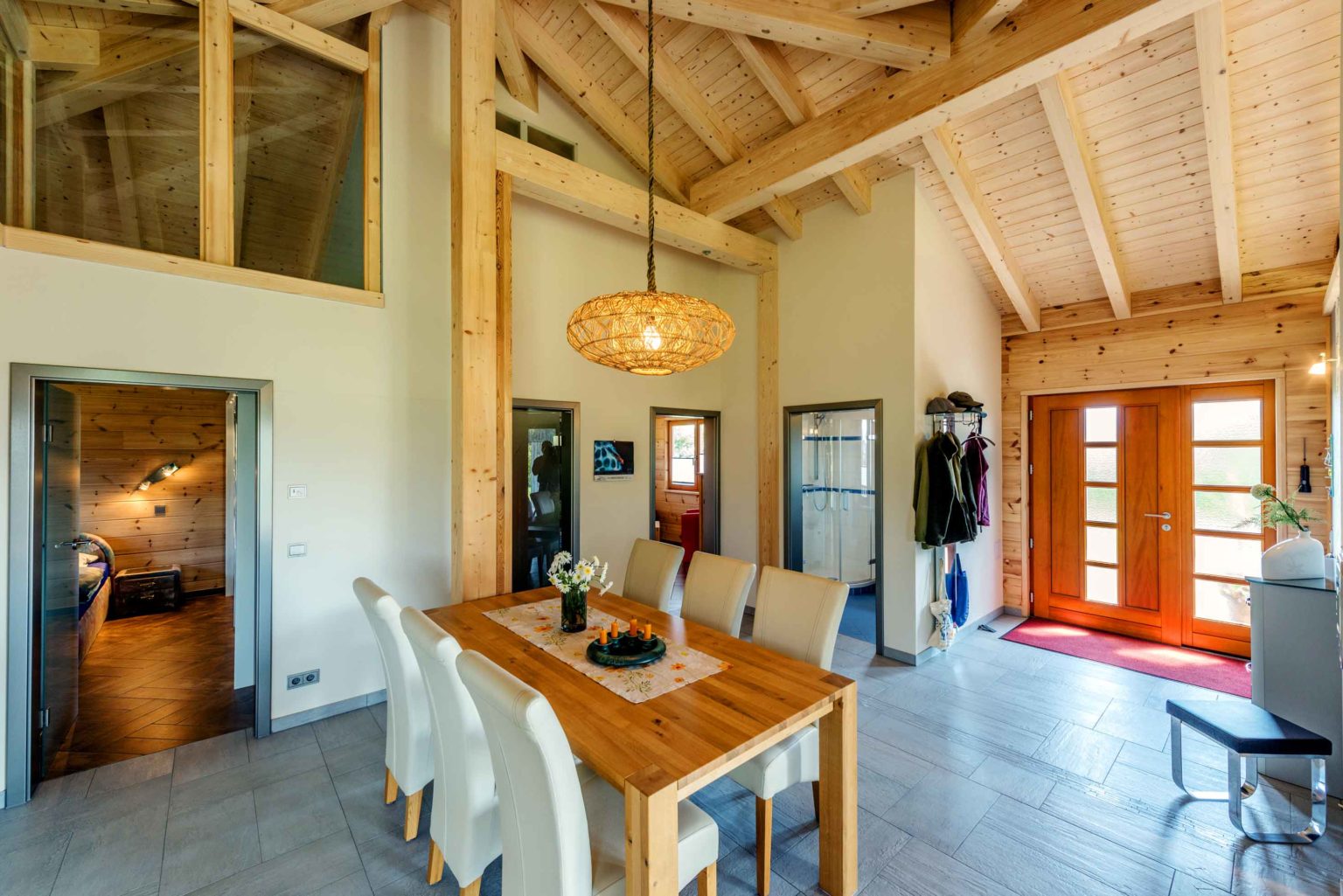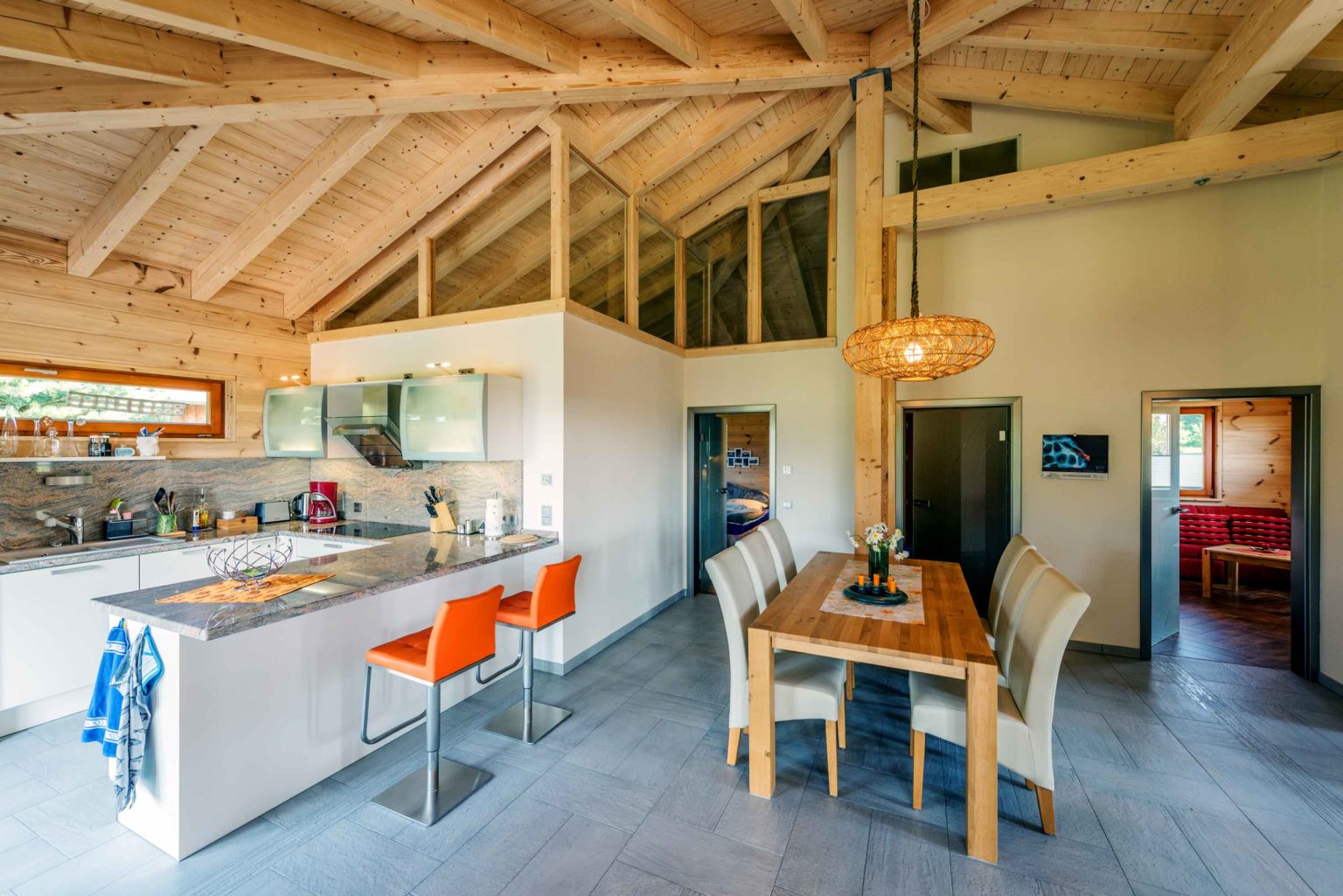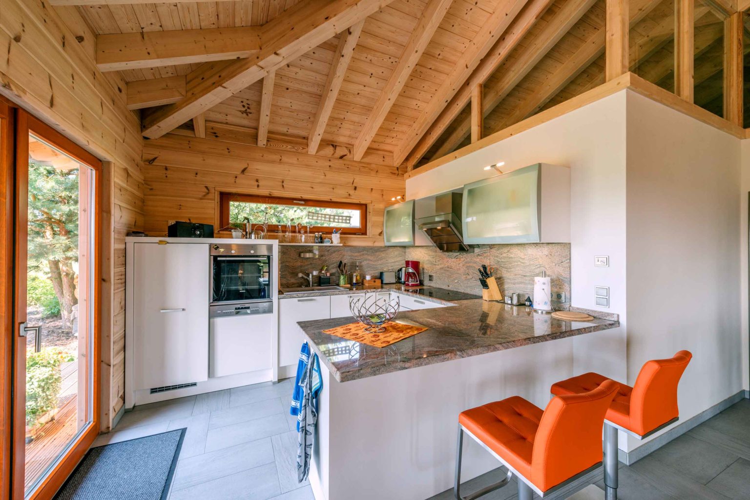 Die Eigentümer haben es geschafft, ihr Holzhaus ganz natürlich und gemütlich, aber auch modern auszustatten. Die Gemütlichkeit zaubert hauptsächlich der Baustoff Holz hervor; die Natürlichkeit wird ebenfalls vom Element Holz (Massivholzwände + Eichendielen) in der Kombination mit Gestein (z.B. Granitplatten in der Küche) bewirkt; und die klaren Linien, die grauen (Bodenfliesen, Türrahmen, Sofa) und hellen bis weißen (Trennwände, Küchenmöbel) Farbtöne, sowie die Milchglastüren unterstreichen den modernen Charakter des Holzhauses im Bauhaus-Stil. Ein paar orangene, senfgelbe und rostbraune Farbtupfer beleben das Ganze und passen farblich wunderbar zu den Holzfensterrahmen. Neben all der Offenheit gibt es freilich auch geschützte Bereiche, nämlich ein großes Badezimmer, ein Gäste-Bad/WC, zwei Schlafzimmer (Nordseite) und einen Hauswirtschaftsraum mit Außentüre. Der Eingangsbereich (Ostseite) hingegen ist zum Wohnbereich hin ebenfalls offen gehalten. Lediglich eine sich von der Ostwand zum Kamin ziehende Trennwand dient als Sichtschutz zwischen Sofalandschaft und Eingangsbereich. Das ergibt eine zwar offene aber dennoch sehr gemütliche Couchecke, von der es sich entweder hinaus oder in die lodernden Flammen des grauen Speckstein-Kaminofens schauen lässt. Die Trennwände zu den Schlafzimmern und zu den Bädern sind bis zum Dach hochgezogen, wobei zum großen Badezimmer Glasscheiben im oberen Bereich eingesetzt wurden, damit zusätzliches Licht hereinfällt und der Sichtdachstuhl auch in seiner ganzen Pracht gesehen wird. Über diese Idee ihres Fullwood-Beraters freuen sich die Hausbesitzer noch heute ganz besonders!