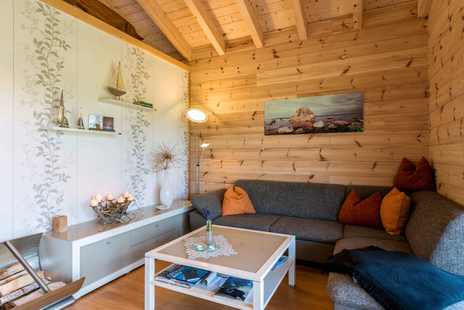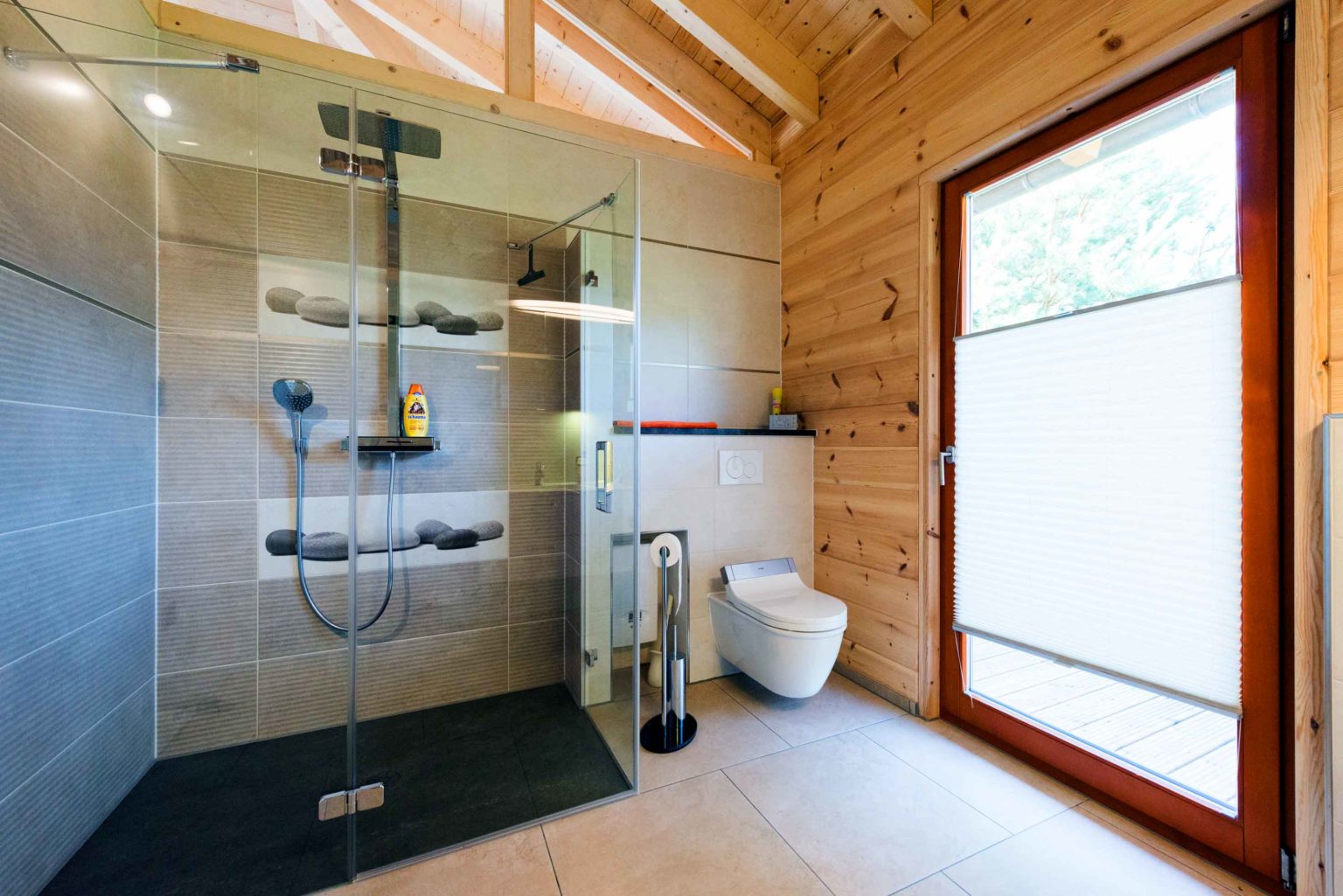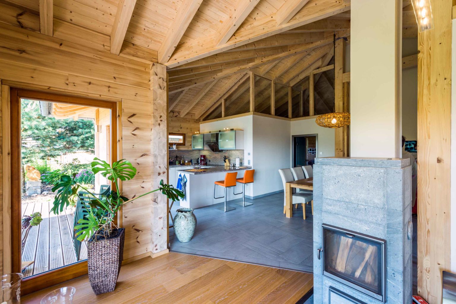 Die Eigentümer haben es geschafft, ihr Holzhaus ganz natürlich und gemütlich, aber auch modern auszustatten. Die Gemütlichkeit zaubert hauptsächlich der Baustoff Holz hervor; die Natürlichkeit wird ebenfalls vom Element Holz (Massivholzwände + Eichendielen) in der Kombination mit Gestein (z.B. Granitplatten in der Küche) bewirkt; und die klaren Linien, die grauen (Bodenfliesen, Türrahmen, Sofa) und hellen bis weißen (Trennwände, Küchenmöbel) Farbtöne, sowie die Milchglastüren unterstreichen den modernen Charakter des Holzhauses im Bauhaus-Stil. Ein paar orangene, senfgelbe und rostbraune Farbtupfer beleben das Ganze und passen farblich wunderbar zu den Holzfensterrahmen. Neben all der Offenheit gibt es freilich auch geschützte Bereiche, nämlich ein großes Badezimmer, ein Gäste-Bad/WC, zwei Schlafzimmer (Nordseite) und einen Hauswirtschaftsraum mit Außentüre. Der Eingangsbereich (Ostseite) hingegen ist zum Wohnbereich hin ebenfalls offen gehalten. Lediglich eine sich von der Ostwand zum Kamin ziehende Trennwand dient als Sichtschutz zwischen Sofalandschaft und Eingangsbereich. Das ergibt eine zwar offene aber dennoch sehr gemütliche Couchecke, von der es sich entweder hinaus oder in die lodernden Flammen des grauen Speckstein-Kaminofens schauen lässt. Die Trennwände zu den Schlafzimmern und zu den Bädern sind bis zum Dach hochgezogen, wobei zum großen Badezimmer Glasscheiben im oberen Bereich eingesetzt wurden, damit zusätzliches Licht hereinfällt und der Sichtdachstuhl auch in seiner ganzen Pracht gesehen wird. Über diese Idee ihres Fullwood-Beraters freuen sich die Hausbesitzer noch heute ganz besonders!