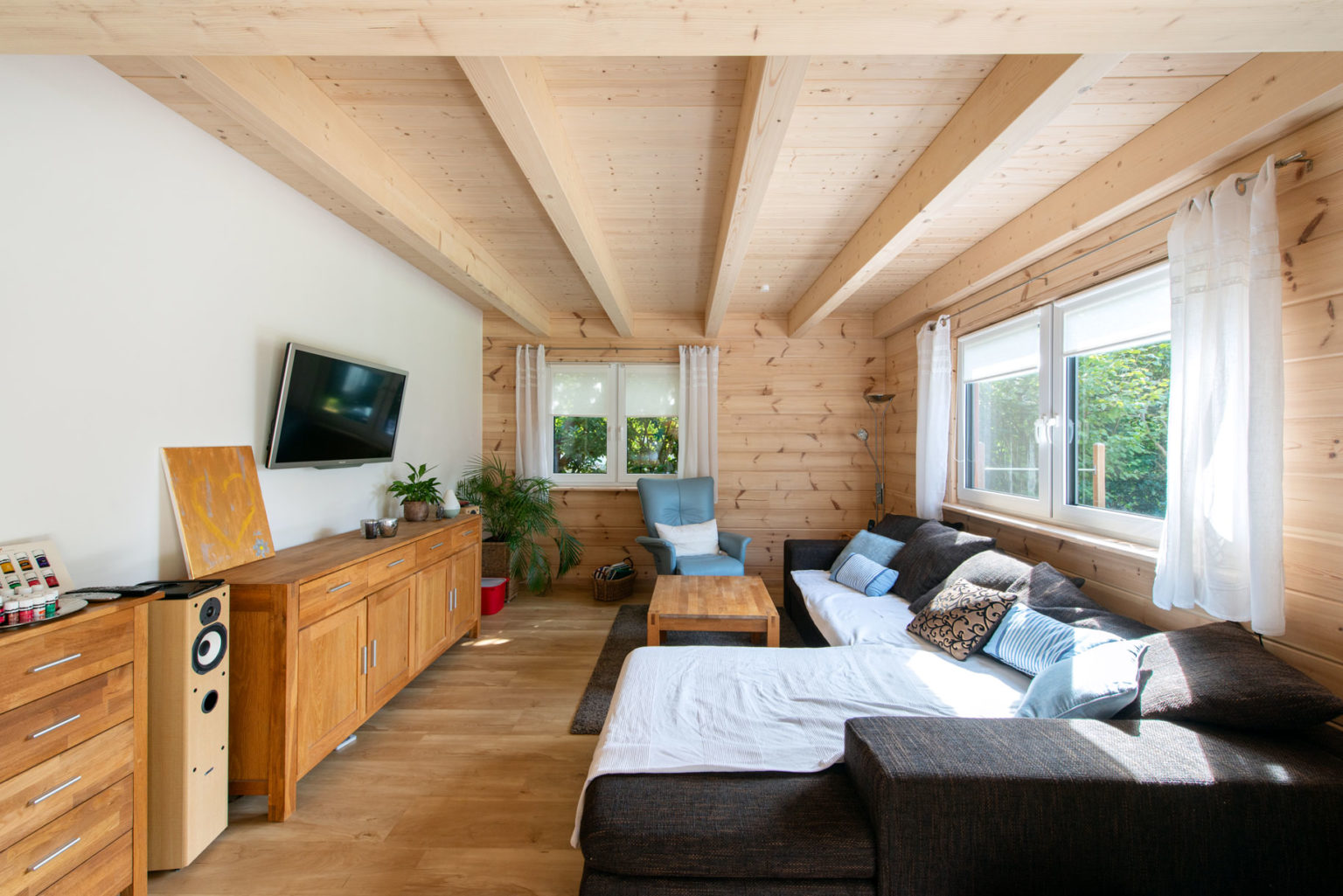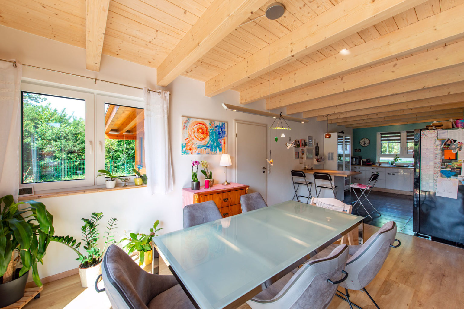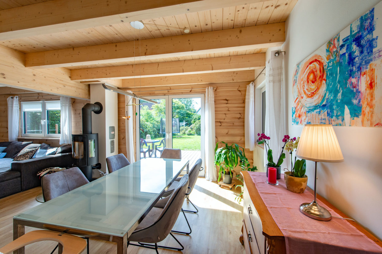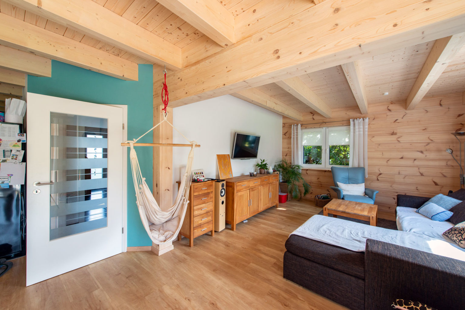 Familie Berger kombinierte die einschalige Blockwand von Fullwood mit der gedämmten Variante um noch mehr Energieeffizienz zu erhalten, und das Hausinnere flexibler gestalten zu können. Denn ausschließlich Holzwände wollte man nicht, sondern auch viele weiß oder farbig gestrichene Wände. Offene Holzbalkendecken und ein Sichtdachstuhl sollten es aber unbedingt sein. Drinnen wurde sämtliches Holz mit UV-Schutz gegen Nachdunkeln behandelt, damit das Kiefernholz so schön naturhell bleibt wie zu Beginn. „Das verarbeitete Holz ist schadstofffrei und garantiert ein wohngesundes Raumklima. Davon profitieren wir tagtäglich.“, freut sich Beate Berger. Da sie und ihr Mann es hell mögen, ließen sie viele, auch bodentiefe Fenster ins Holzhaus einbauen und entschieden sich für eine raffinierte Rahmenvariante: „Unsere Fensterrahmen sind innen weiß, was das helle Ambiente unterstreicht, und außen anthrazit, was farblich zur Dacheindeckung passt und sehr modern wirkt.“
