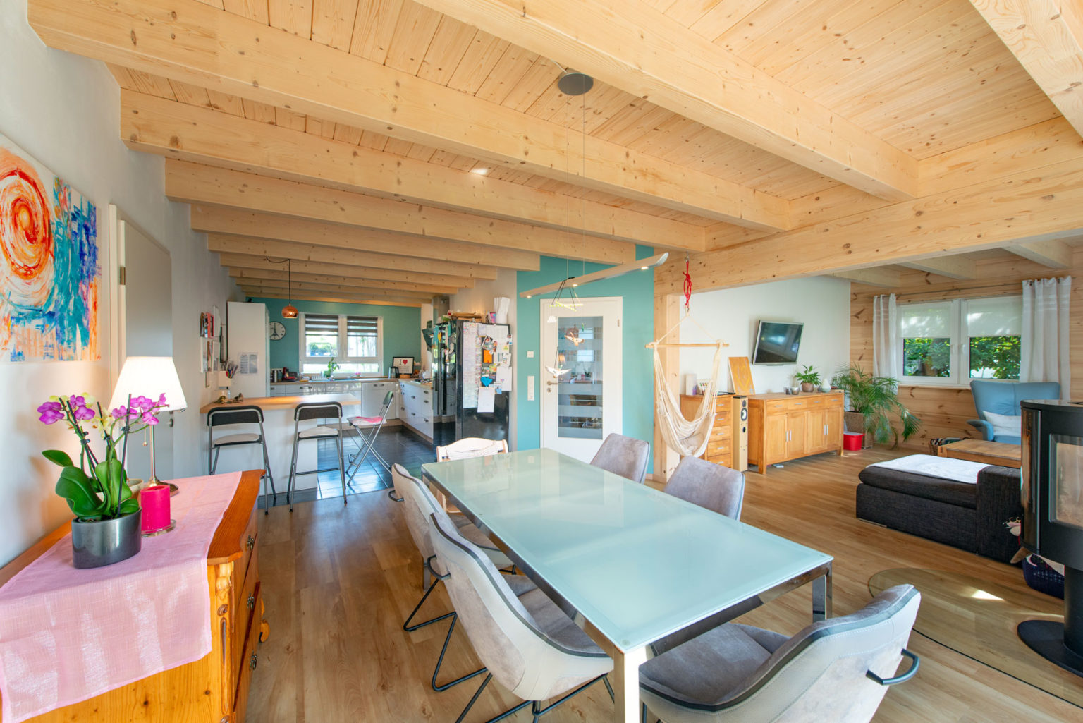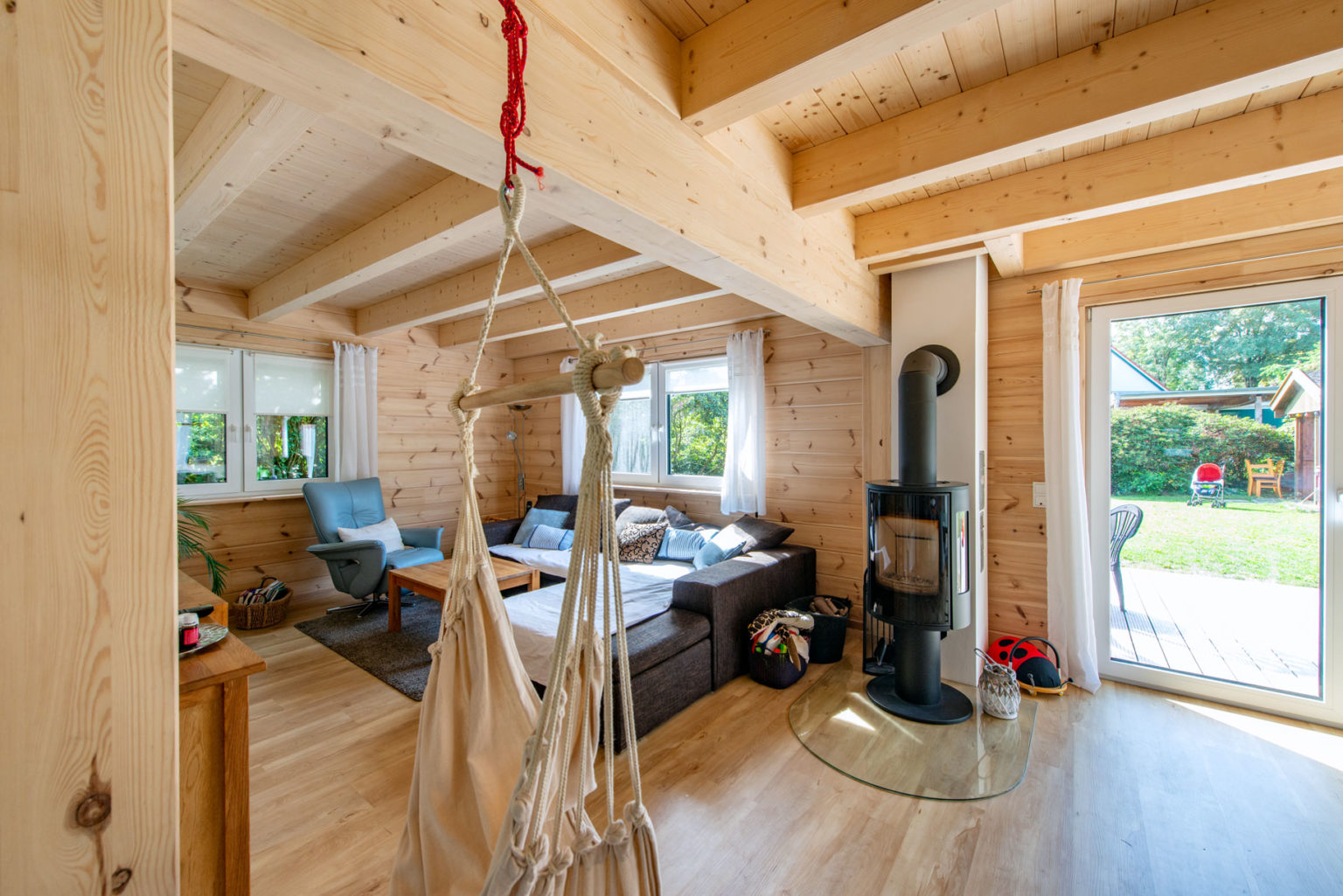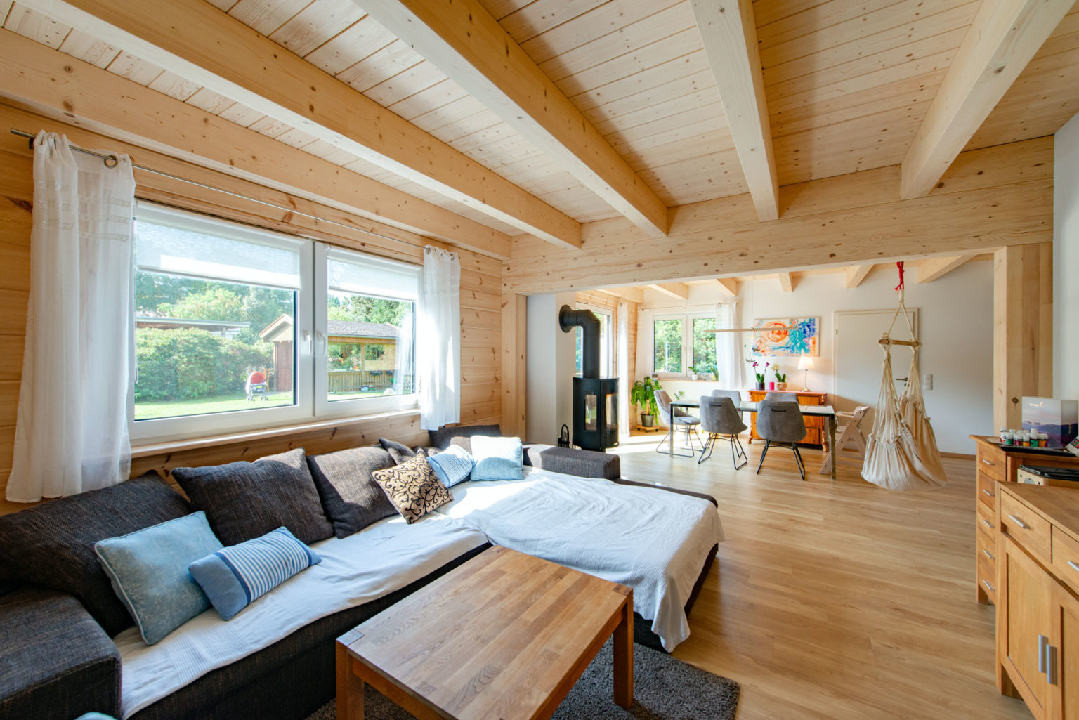 Familie Berger kombinierte die einschalige Blockwand von Fullwood mit der gedämmten Variante um noch mehr Energieeffizienz zu erhalten, und das Hausinnere flexibler gestalten zu können. Denn ausschließlich Holzwände wollte man nicht, sondern auch viele weiß oder farbig gestrichene Wände. Offene Holzbalkendecken und ein Sichtdachstuhl sollten es aber unbedingt sein. Drinnen wurde sämtliches Holz mit UV-Schutz gegen Nachdunkeln behandelt, damit das Kiefernholz so schön naturhell bleibt wie zu Beginn. „Das verarbeitete Holz ist schadstofffrei und garantiert ein wohngesundes Raumklima. Davon profitieren wir tagtäglich.“, freut sich Beate Berger. Da sie und ihr Mann es hell mögen, ließen sie viele, auch bodentiefe Fenster ins Holzhaus einbauen und entschieden sich für eine raffinierte Rahmenvariante: „Unsere Fensterrahmen sind innen weiß, was das helle Ambiente unterstreicht, und außen anthrazit, was farblich zur Dacheindeckung passt und sehr modern wirkt.“