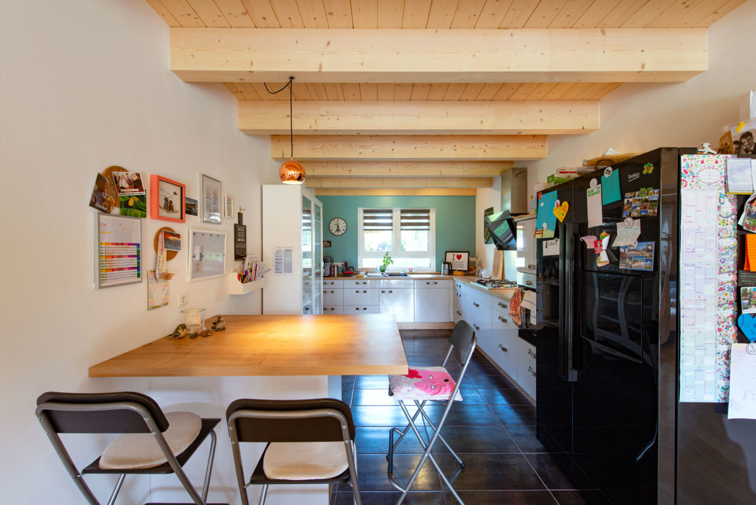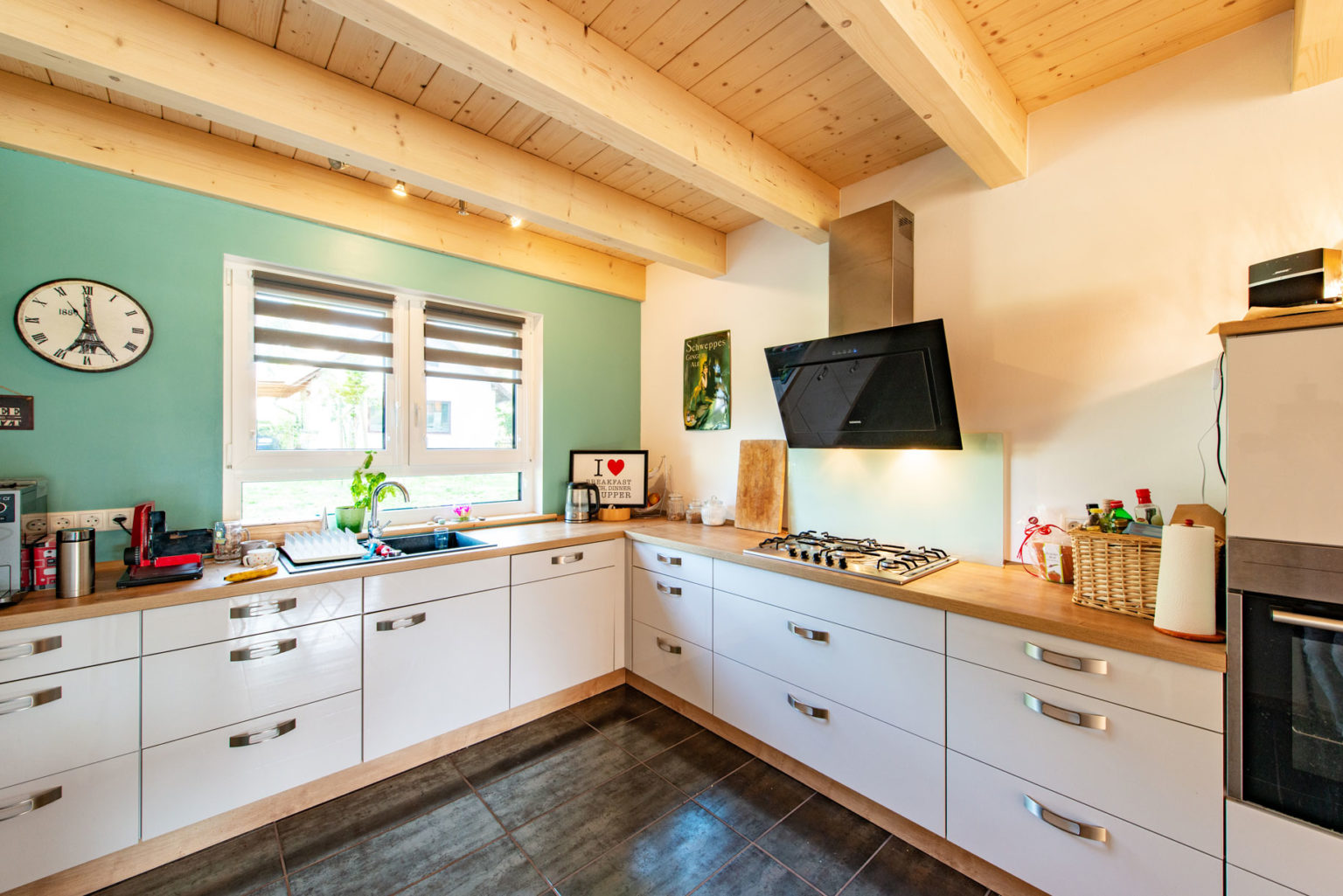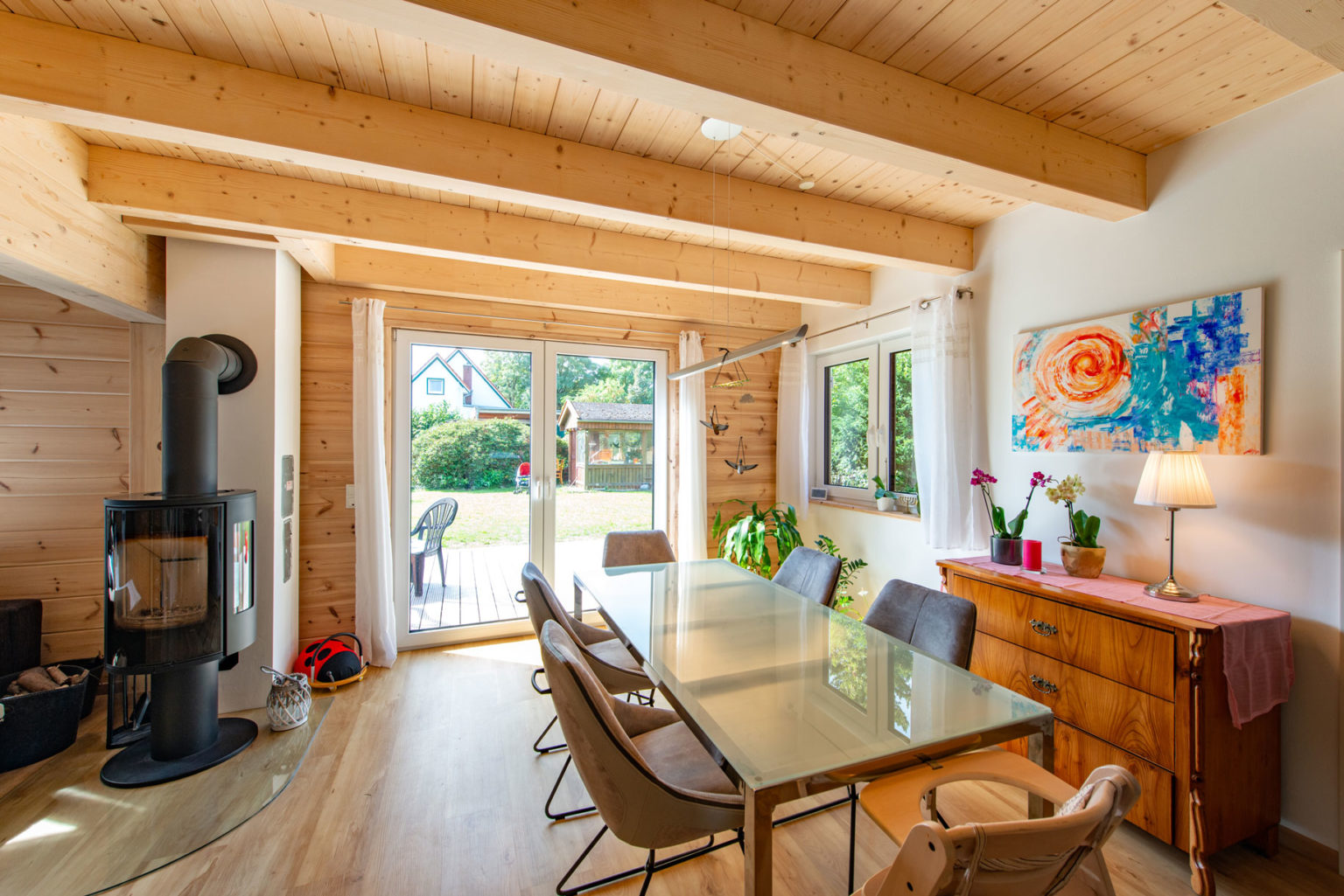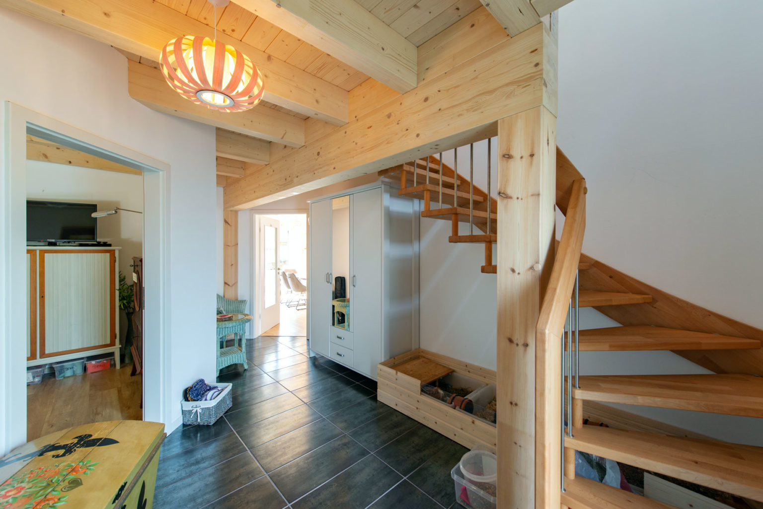 Familie Berger kombinierte die einschalige Blockwand von Fullwood mit der gedämmten Variante um noch mehr Energieeffizienz zu erhalten, und das Hausinnere flexibler gestalten zu können. Denn ausschließlich Holzwände wollte man nicht, sondern auch viele weiß oder farbig gestrichene Wände. Offene Holzbalkendecken und ein Sichtdachstuhl sollten es aber unbedingt sein. Drinnen wurde sämtliches Holz mit UV-Schutz gegen Nachdunkeln behandelt, damit das Kiefernholz so schön naturhell bleibt wie zu Beginn. „Das verarbeitete Holz ist schadstofffrei und garantiert ein wohngesundes Raumklima. Davon profitieren wir tagtäglich.“, freut sich Beate Berger. Da sie und ihr Mann es hell mögen, ließen sie viele, auch bodentiefe Fenster ins Holzhaus einbauen und entschieden sich für eine raffinierte Rahmenvariante: „Unsere Fensterrahmen sind innen weiß, was das helle Ambiente unterstreicht, und außen anthrazit, was farblich zur Dacheindeckung passt und sehr modern wirkt.“