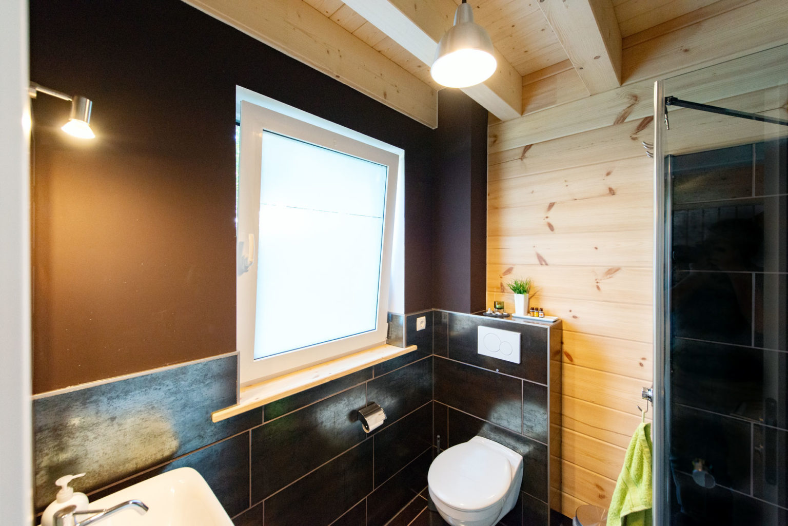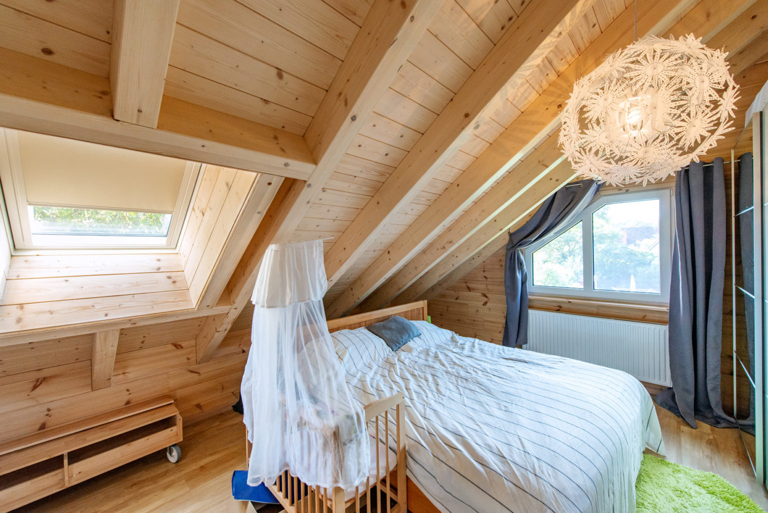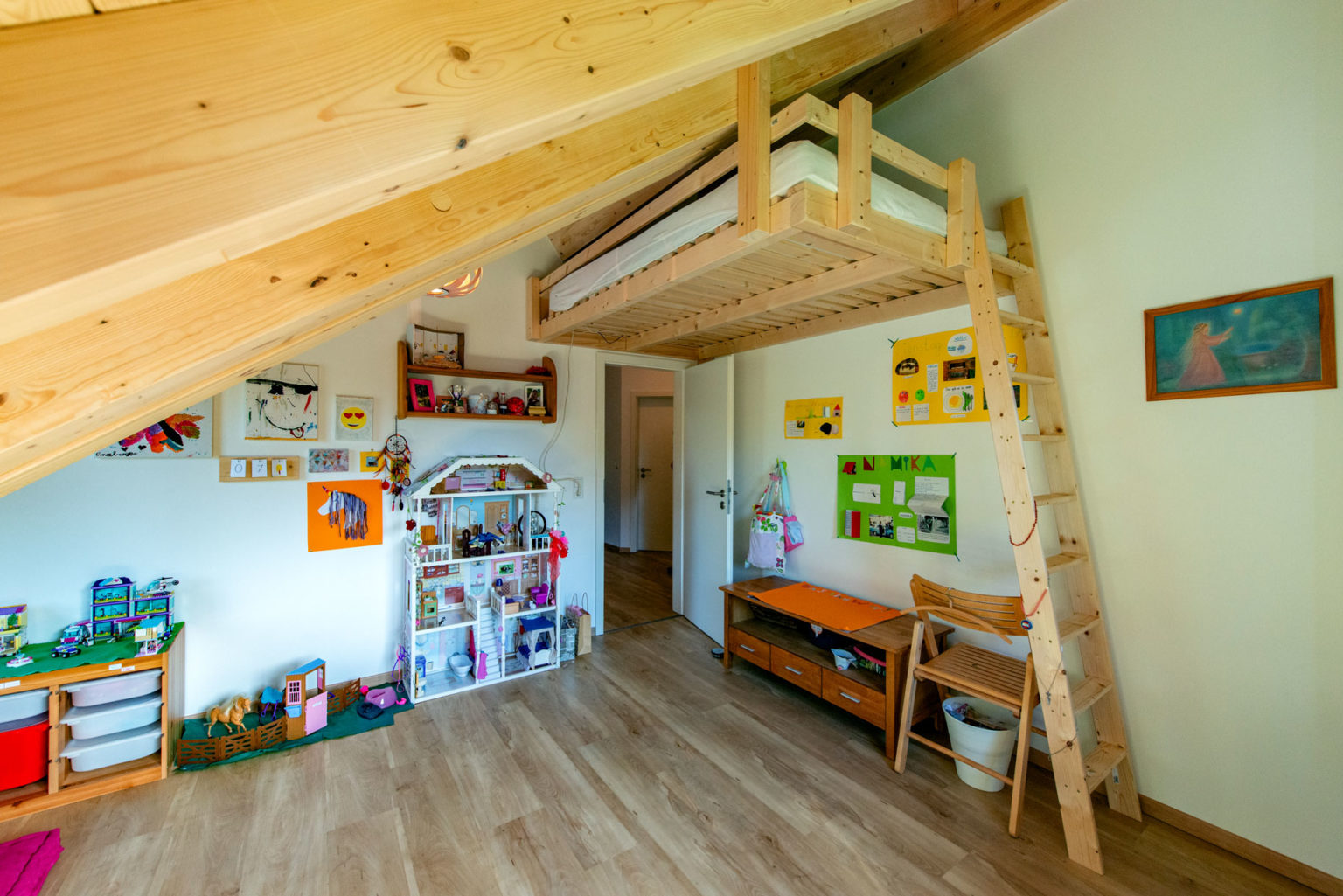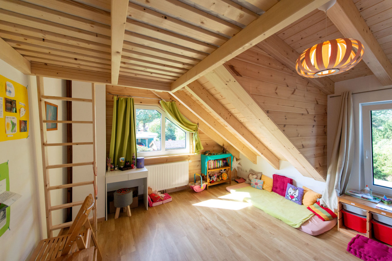 Das Dachgeschoss ist ganz dem Rückzug der Hausbewohner gewidmet. Dort reihen sich zwei Kinderzimmer (teilen sich die doppelte Gaube), ein Schlafzimmer und ein großes Familienbadezimmer um eine Diele. Die Kinderzimmer besitzen beide ein gemütliches „Schlafnest“ (Hochbett), das ein Plus an Platz und Gemütlichkeit bringt. Noch sind die Kinder aber zu klein um es zu nutzen. „Wir heizen mit Gas und einem Kaminofen für die Gemütlichkeit. Im gesamten Erdgeschoss und in beiden Bädern haben wir Fußbodenheizung, ansonsten Heizkörper. Unterstützt wird das Ganze durch eine solare Warmwasserbereitung.“, erklärt der Hausherr. Da die Hauswände hervorragend dämmen und Holz generell ein behagliches Gefühl vermittelt, ist der Heizenergieverbrauch niedrig und die Betriebskosten sparsam. Familie Berger fühlt sich jedenfalls wohl in ihrem Holzhaus und hat die Entscheidung, mit Fullwood zu bauen, nicht bereut.