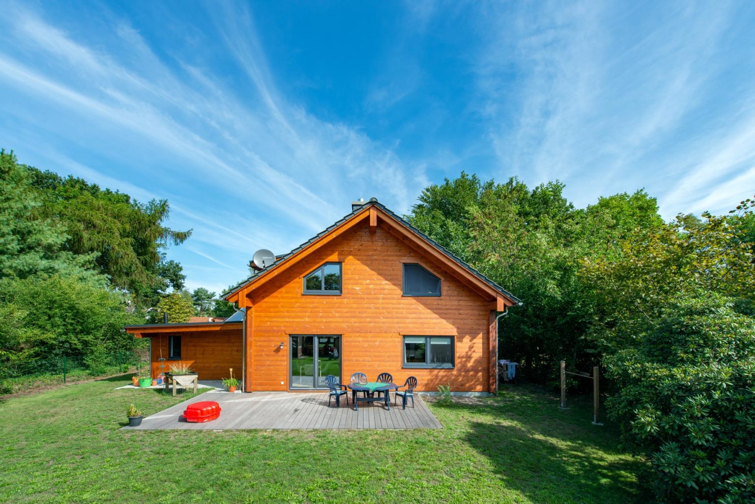 Holzhaus „Otterbarg“ erfreut mit dezenter, klassischer Architektur und fällt ausschließlich durch sein Baumaterial, Polarkiefernholz, auf. Eine große Doppelgaube an der westlichen Traufseite vergrößert die Wohn- und Stellfläche im Dachgeschoss, und ein ebenfalls an dieser Seite angebauter Doppelcarport mit integriertem, großem Hauswirtschaftsraum schließt sich an. „Ein großer Hauswirtschaftsraum war meine einzige Bedingung. Er führt direkt ins Haus und ist außerdem vom Carport zugänglich. So gelangen wir stets trockenen Fußes ins Haus bzw. Auto und müssen Einkäufe nicht weit tragen.“, sagt die Hausherrin. Der eigentliche Hauseingang befindet sich an der Nordseite und führt in eine geräumige Diele mit Geschosstreppe nach oben. Von dort gelangt man direkt links in eine Gäste-Dusche/WC; geradeaus, an einer schrägen Wand links, in ein Arbeitszimmer und weiter geradeaus, an einer schrägen Wand rechts, in den offenen Wohnbereich. Dieser ist L-förmig und beinhaltet Küche, Esszimmer sowie Wohnzimmer. Nach draußen geht es auf eine gepflasterte Sonnenterrasse (Südseite) mit angrenzender, weitläufiger, ebener Rasenfläche. „Offenes Wohnen ist schön fürs Familienleben und für ein großzügiges, freies Wohngefühl.“, meint Stephan Berger. Praktisch ist auch, dass die Küche nicht vom Sofa aus einsehbar ist, so dass der Abwasch auch mal warten kann.