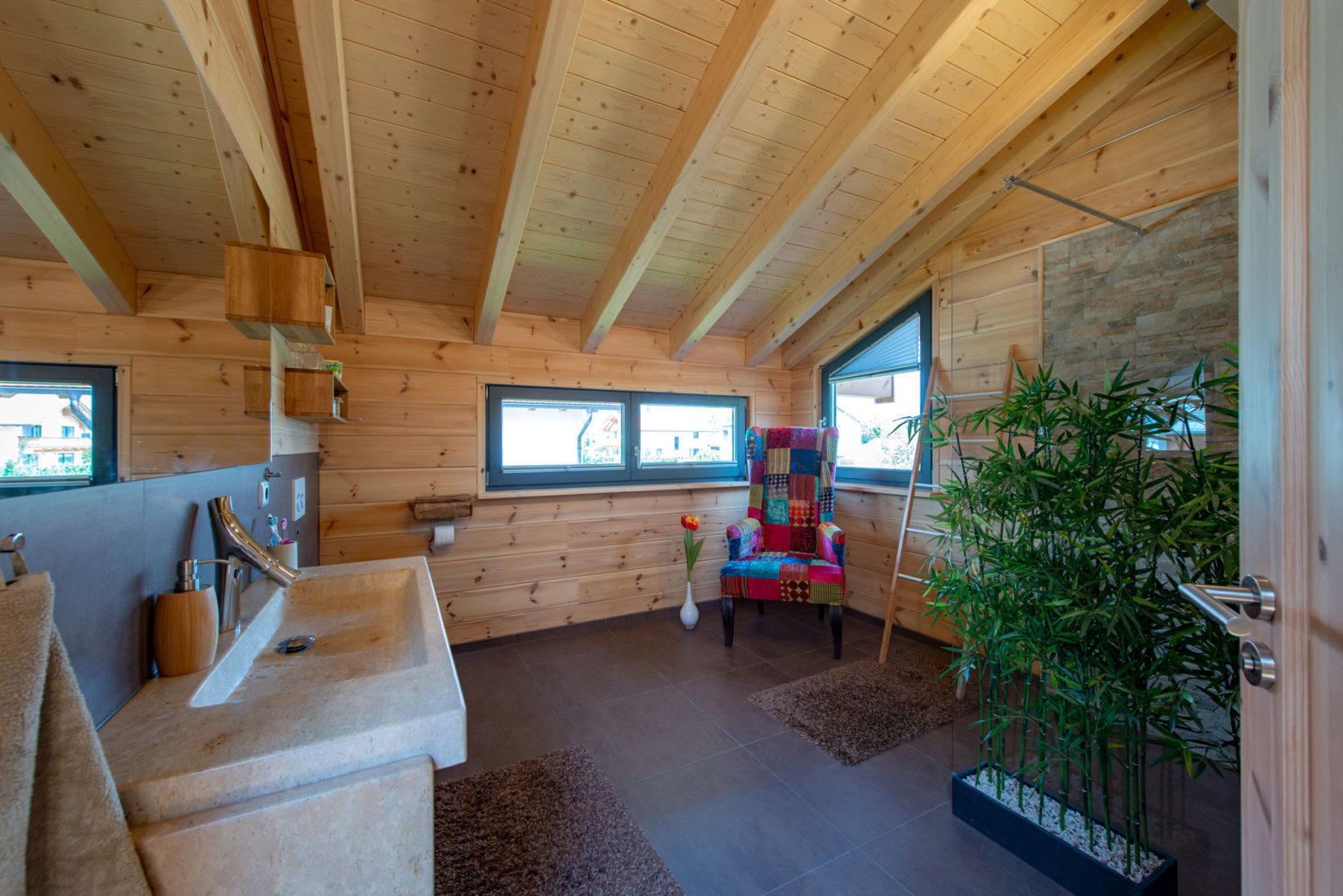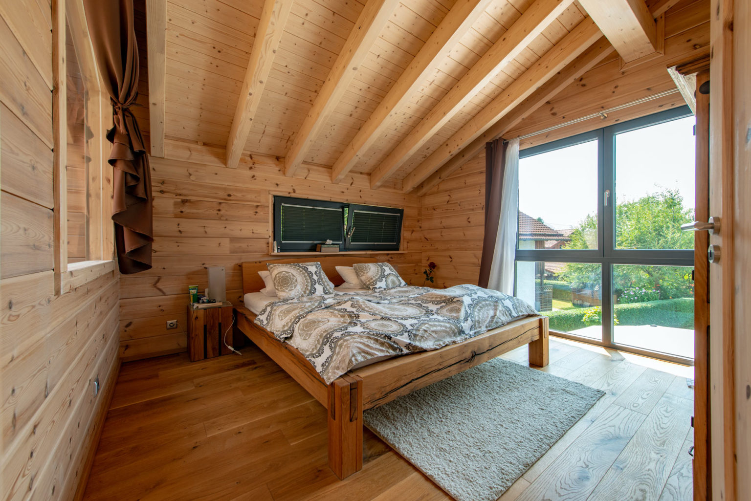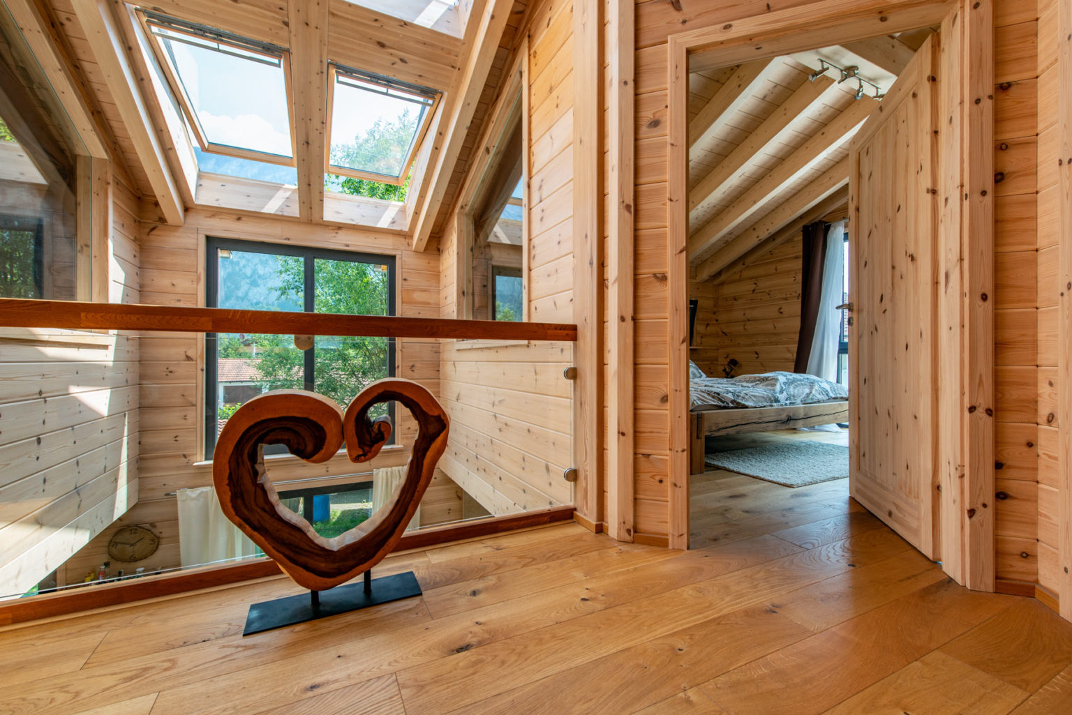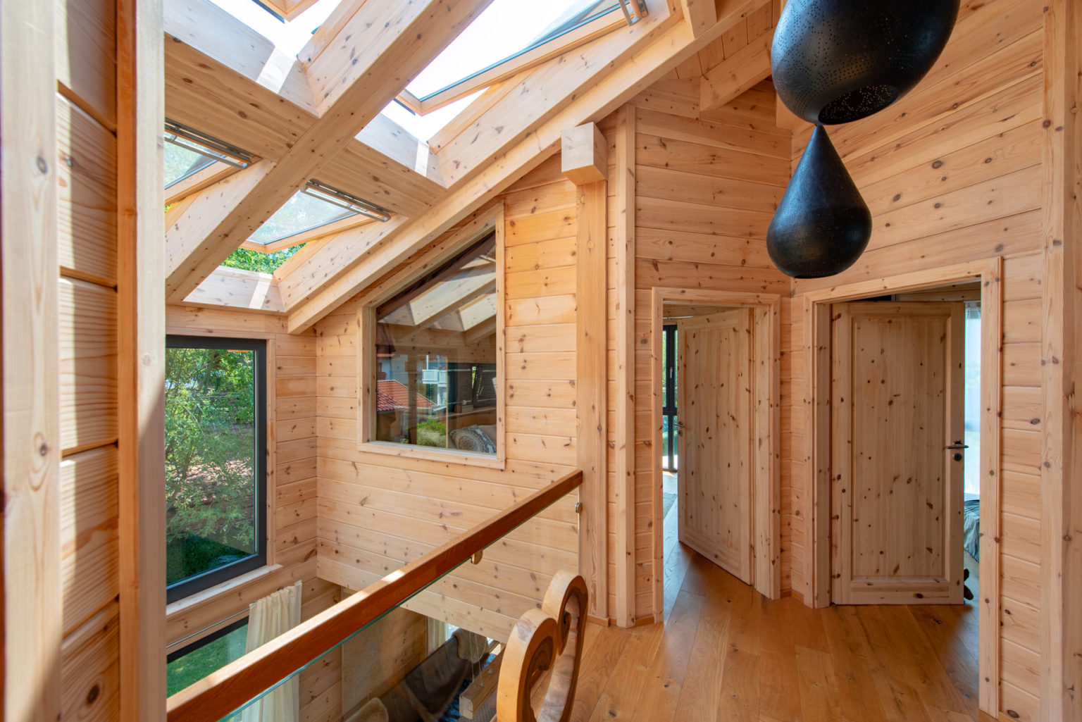 Von der Galerie aus kann man hinab in den Wohnbereich schauen, oder durch das gegenüberliegende bodentiefe Fenster hinaus in den großen Garten blicken. Der Clou: Die an den Luftraum angrenzenden Schlafzimmer besitzen Fenster dorthin, so dass noch mehr natürliches Licht von dort in die Schlafräume gelangt. Für die gewünschte Privatsphäre und Abdunkelung sorgen Vorhänge. Da so viel natürliches Licht in Holzhaus „Pendlingblick“ einfallen kann, verträgt es sehr gut ausschließlich Holzwände, ohne dunkel oder drückend zu wirken. Auf tapezierte Trennwände hat das Eigentümerpaar verzichtet. Sogar die Fußböden wurden einheitlich mit Eichendielenparkett im Naturton verkleidet, und die imposanten Sichtbalkendecken sowie der sichtbare Dachstuhl tragen zum eindrucksvollen, bodenständigen Ambiente des Hauses bei. Die Hausherrin verfügt nach eigener Angabe über einen liebenswerten „Holztick“, den sie mit Unterstützung ihres Mannes kreativ auslebt. Selbstverständlich sind auch die anthrazitfarbenen Fensterrahmen aus Holz, und lediglich die Böden und manche Wandteile in den Bädern und im Hauswirtschaftsraum wurden mit anthrazitfarbenen Fliesen ausgelegt.