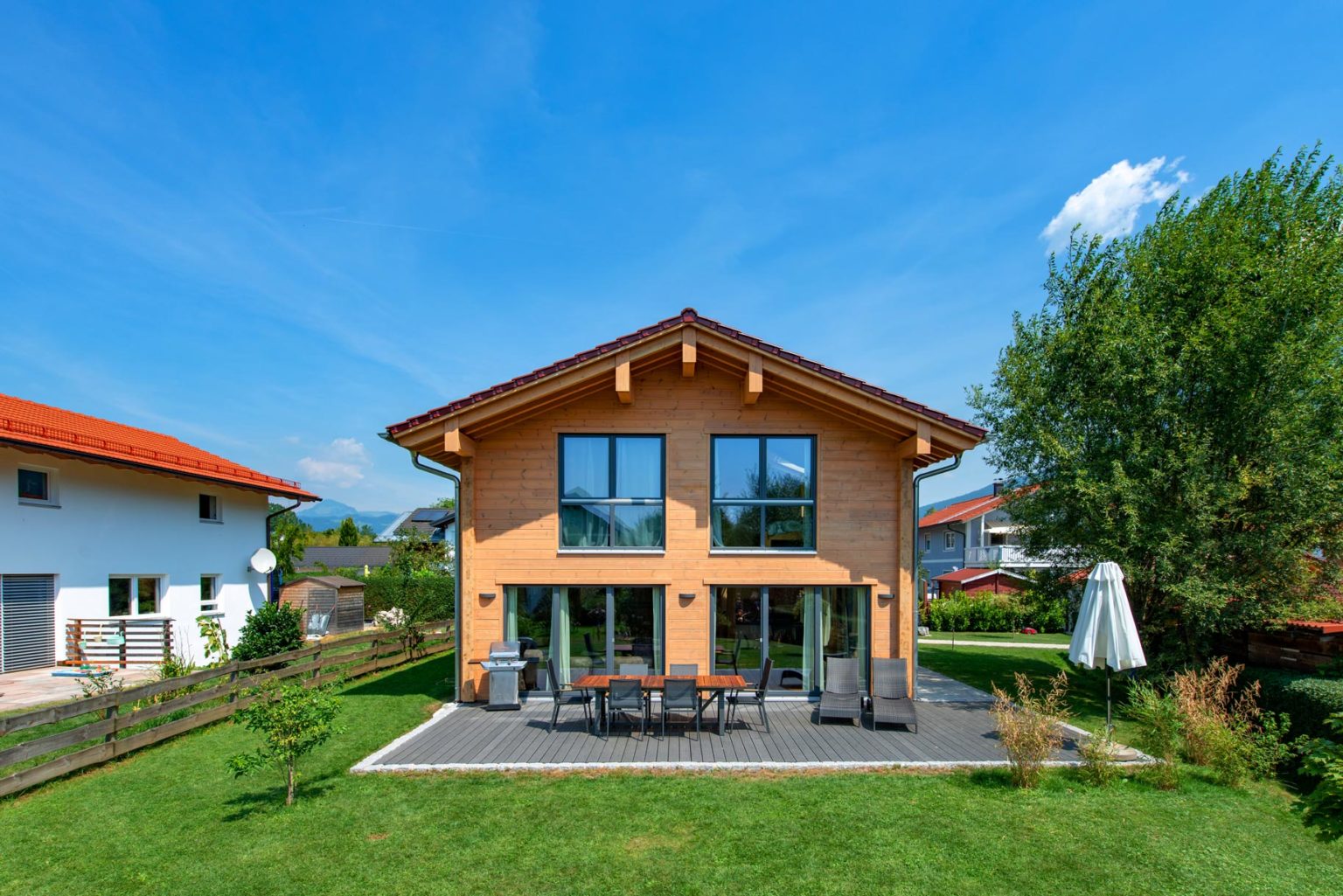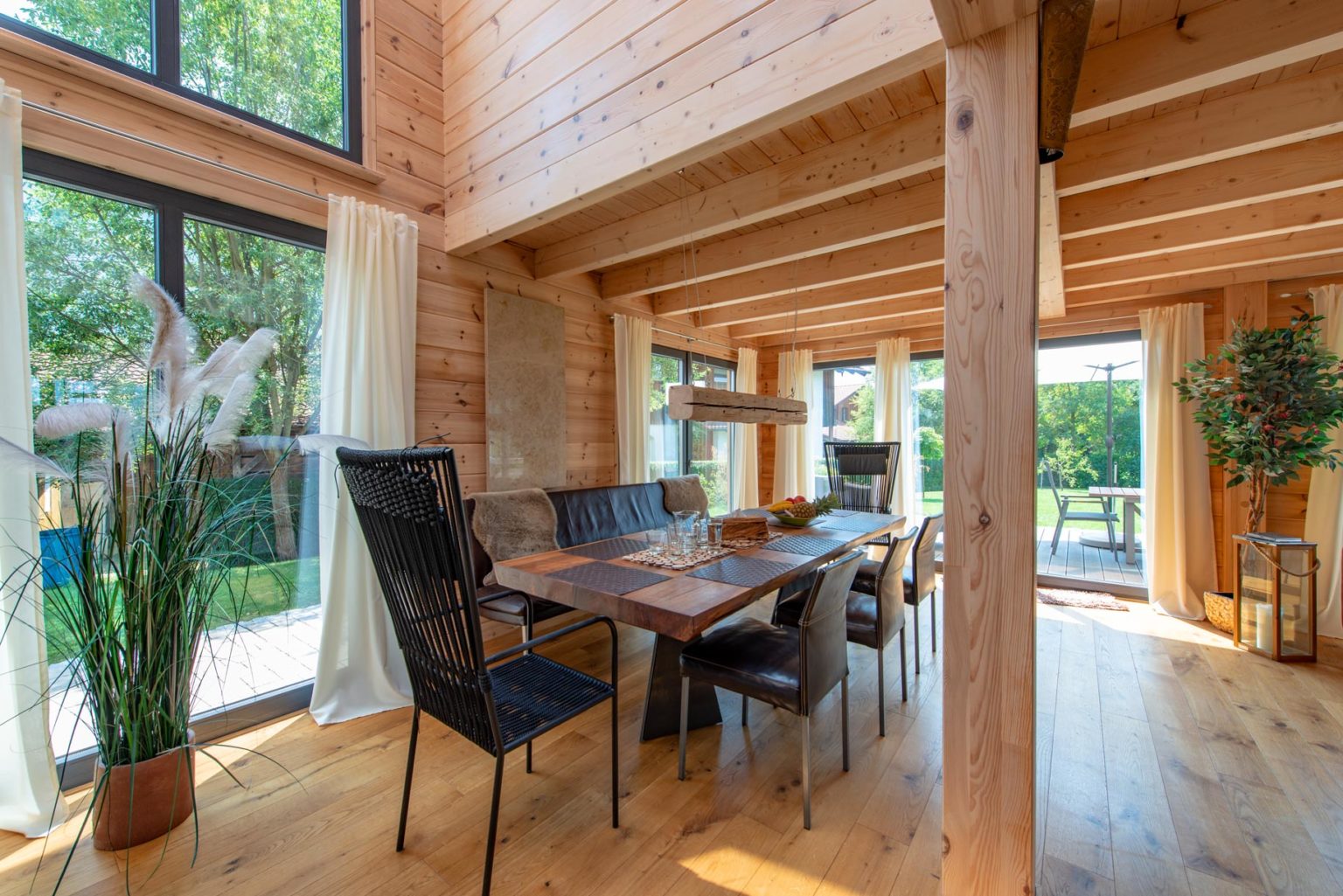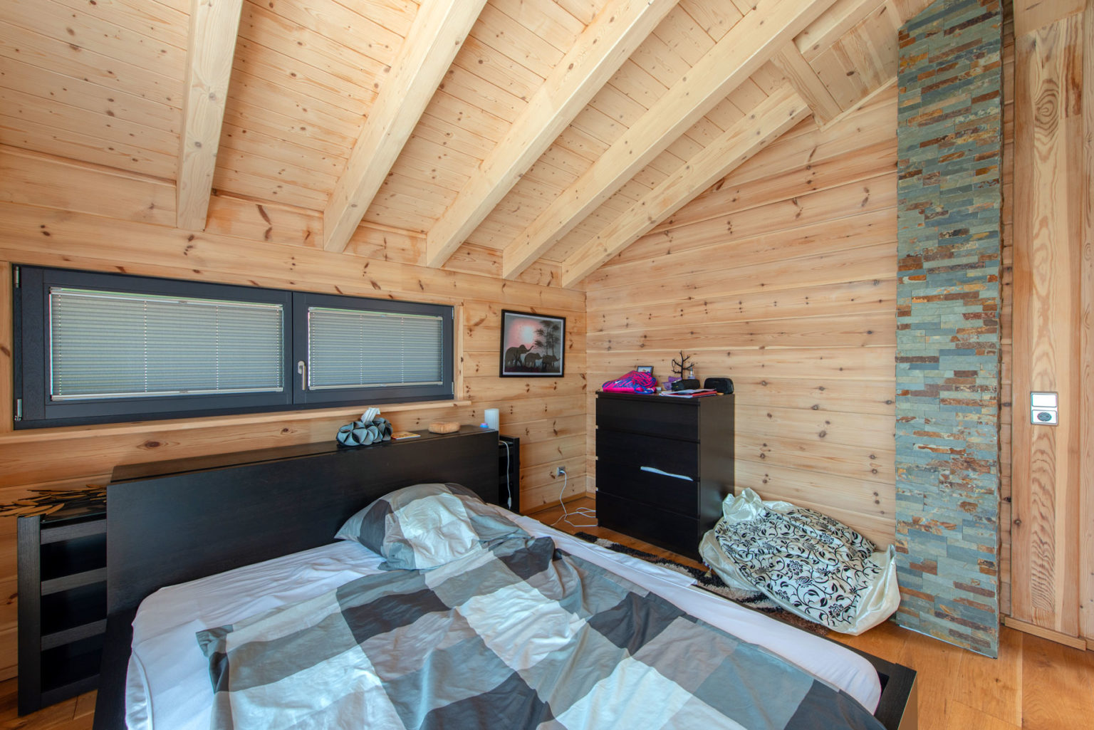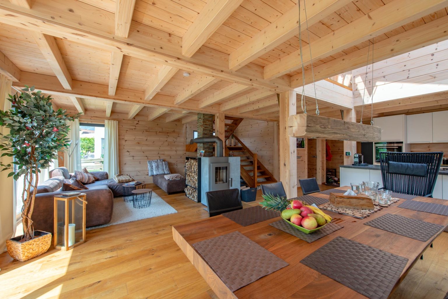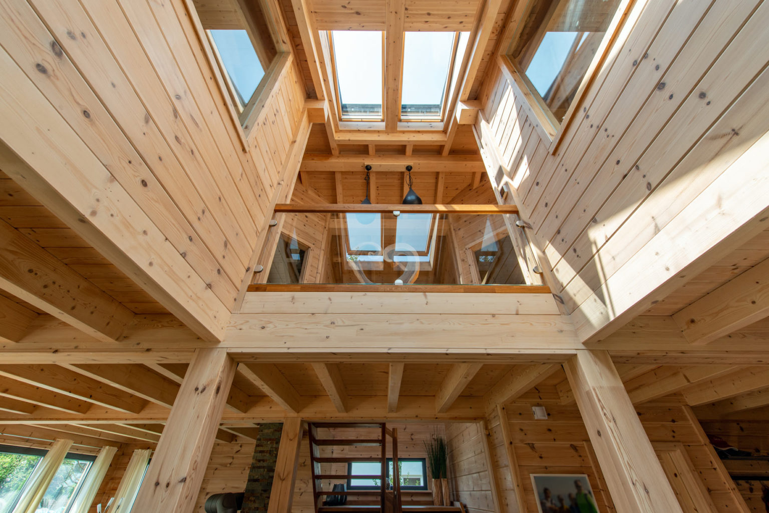 Von der Galerie aus kann man hinab in den Wohnbereich schauen, oder durch das gegenüberliegende bodentiefe Fenster hinaus in den großen Garten blicken. Der Clou: Die an den Luftraum angrenzenden Schlafzimmer besitzen Fenster dorthin, so dass noch mehr natürliches Licht von dort in die Schlafräume gelangt. Für die gewünschte Privatsphäre und Abdunkelung sorgen Vorhänge. Da so viel natürliches Licht in Holzhaus „Pendlingblick“ einfallen kann, verträgt es sehr gut ausschließlich Holzwände, ohne dunkel oder drückend zu wirken. Auf tapezierte Trennwände hat das Eigentümerpaar verzichtet. Sogar die Fußböden wurden einheitlich mit Eichendielenparkett im Naturton verkleidet, und die imposanten Sichtbalkendecken sowie der sichtbare Dachstuhl tragen zum eindrucksvollen, bodenständigen Ambiente des Hauses bei. Die Hausherrin verfügt nach eigener Angabe über einen liebenswerten „Holztick“, den sie mit Unterstützung ihres Mannes kreativ auslebt. Selbstverständlich sind auch die anthrazitfarbenen Fensterrahmen aus Holz, und lediglich die Böden und manche Wandteile in den Bädern und im Hauswirtschaftsraum wurden mit anthrazitfarbenen Fliesen ausgelegt.