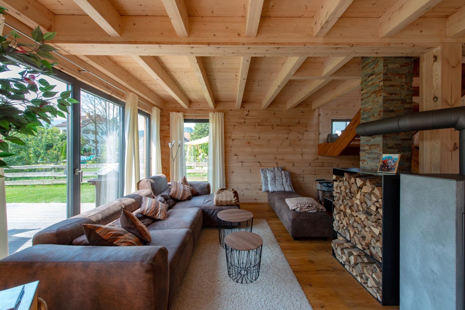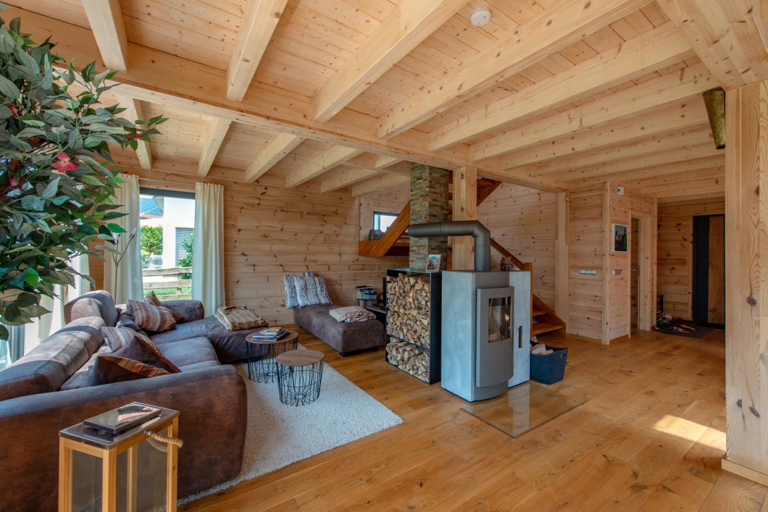 Ihr Haus hat die Baufamilie komplett von Fullwood aufbauen lassen und den Ausbau mit örtlichen Handwerksfirmen organisiert. Aber man machte auch einiges selbst, z.B. strich das Ehepaar die Holzwände innen und außen komplett selbst. Zum Heizen entschieden sie sich für einen großen Specksteinofen, der sowohl mit Holzscheiten als auch mit Holzpellets betrieben werden kann, und dessen Strahlungswärme sehr lange gespeichert wird. Außerdem gibt es eine Wandheizung aus Juramarmor, die aber kaum genutzt wird. Die Polarkiefernwände dämmen hervorragend, ganz ohne zusätzliche Dämmschicht, und die Wärmeschutzfenster sowie gute Dachisolierung leisten ebenfalls ihren Beitrag zur Wärmeisolierung. In den Bädern ergänzen elektrisch betriebene Fußbodenheizungen das Heizsystem und für grüne, autarke Stromversorgung sorgt in Zukunft eine solare Anlage, deren Installation auf dem Hausdach bereits vorbereitet ist. Automatisch via App können der Kaminofen und die Dachfenster (mit Regensensor) gesteuert werden, was besonders für ein nicht ständig bewohntes Ferienhaus aus Holz sehr praktisch ist.