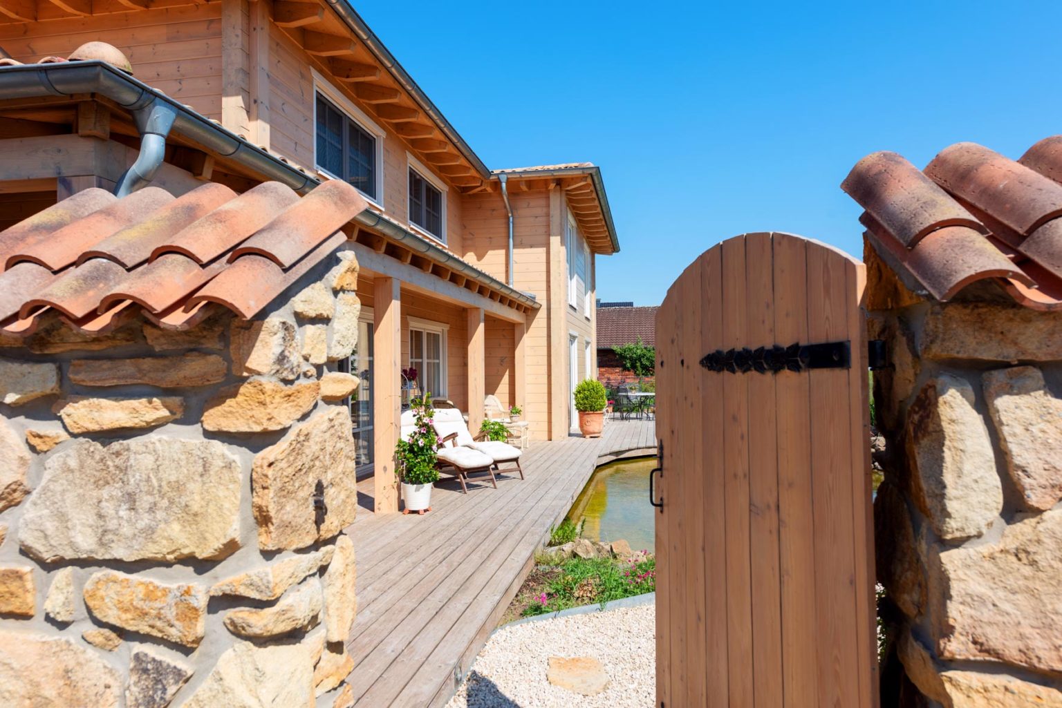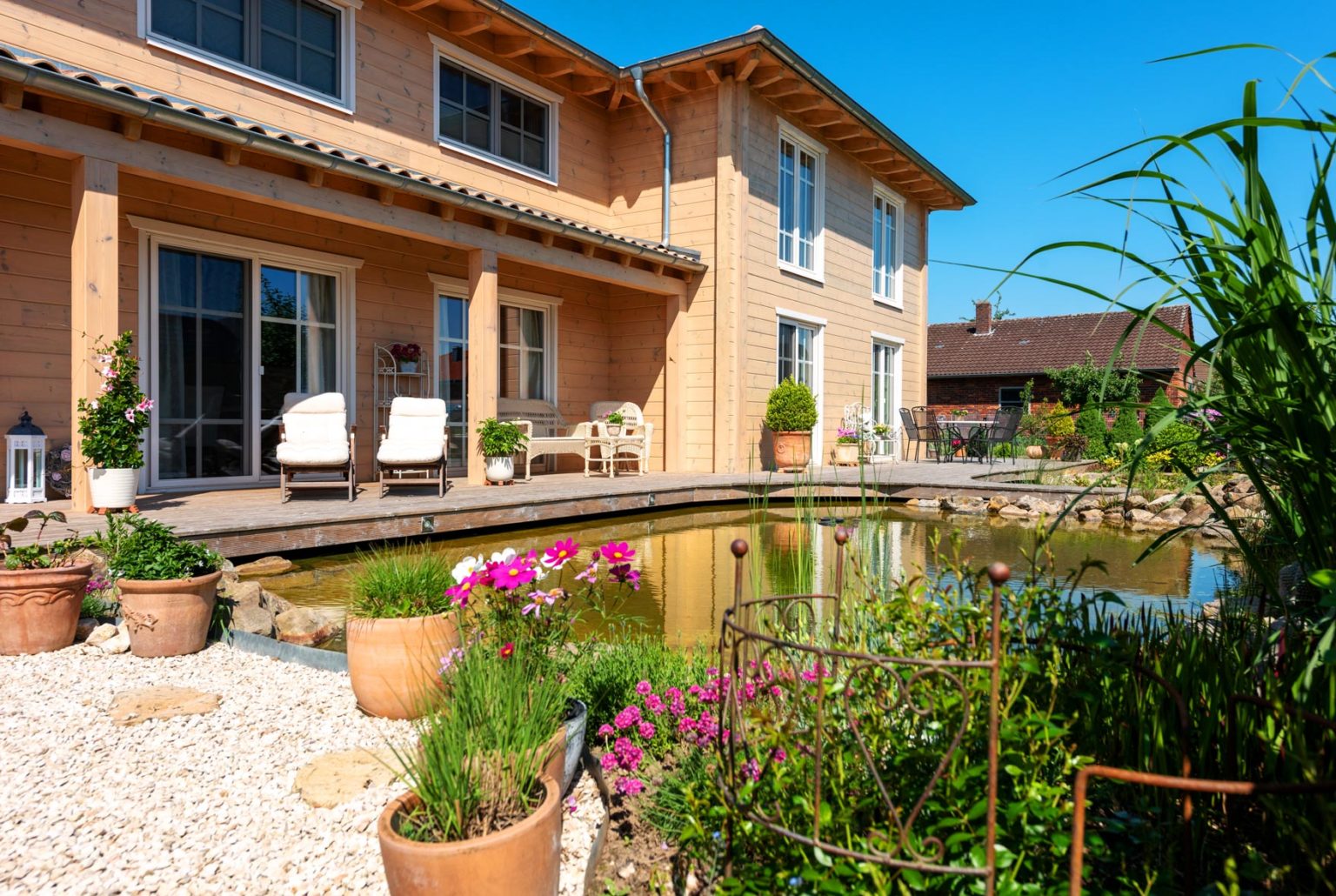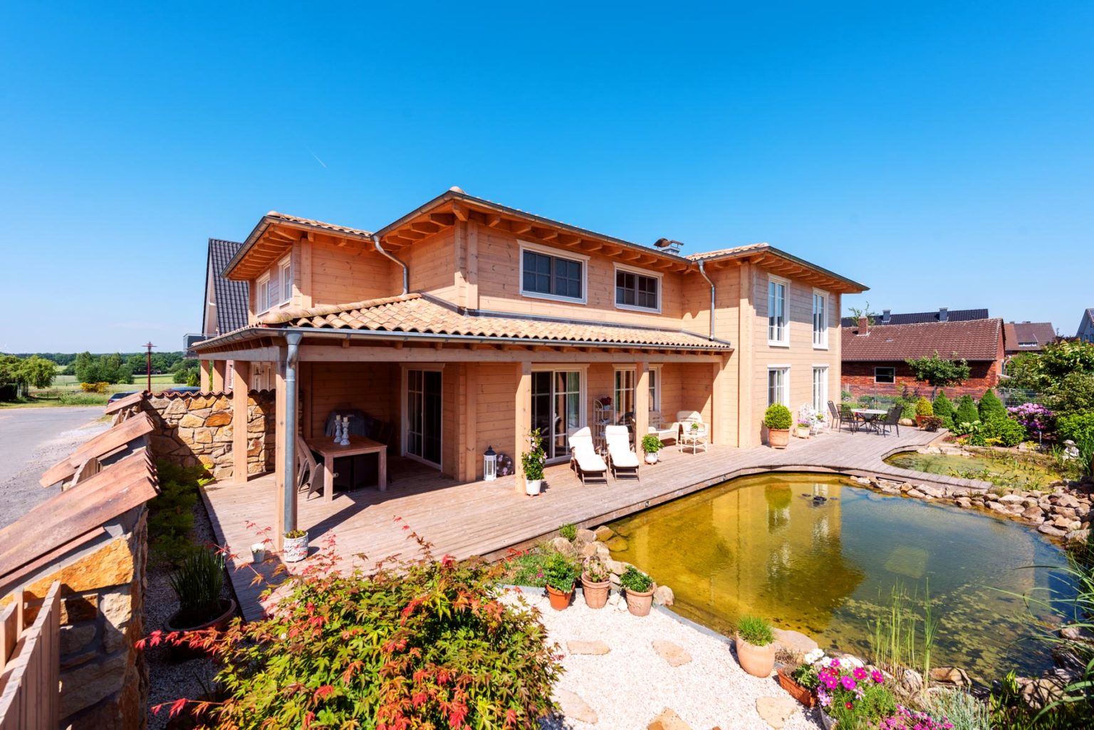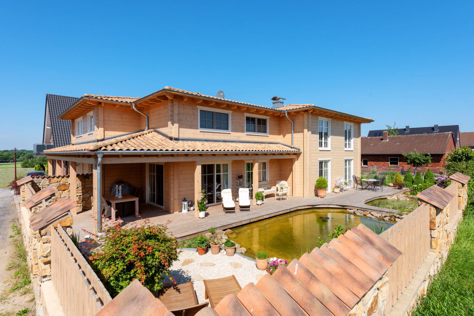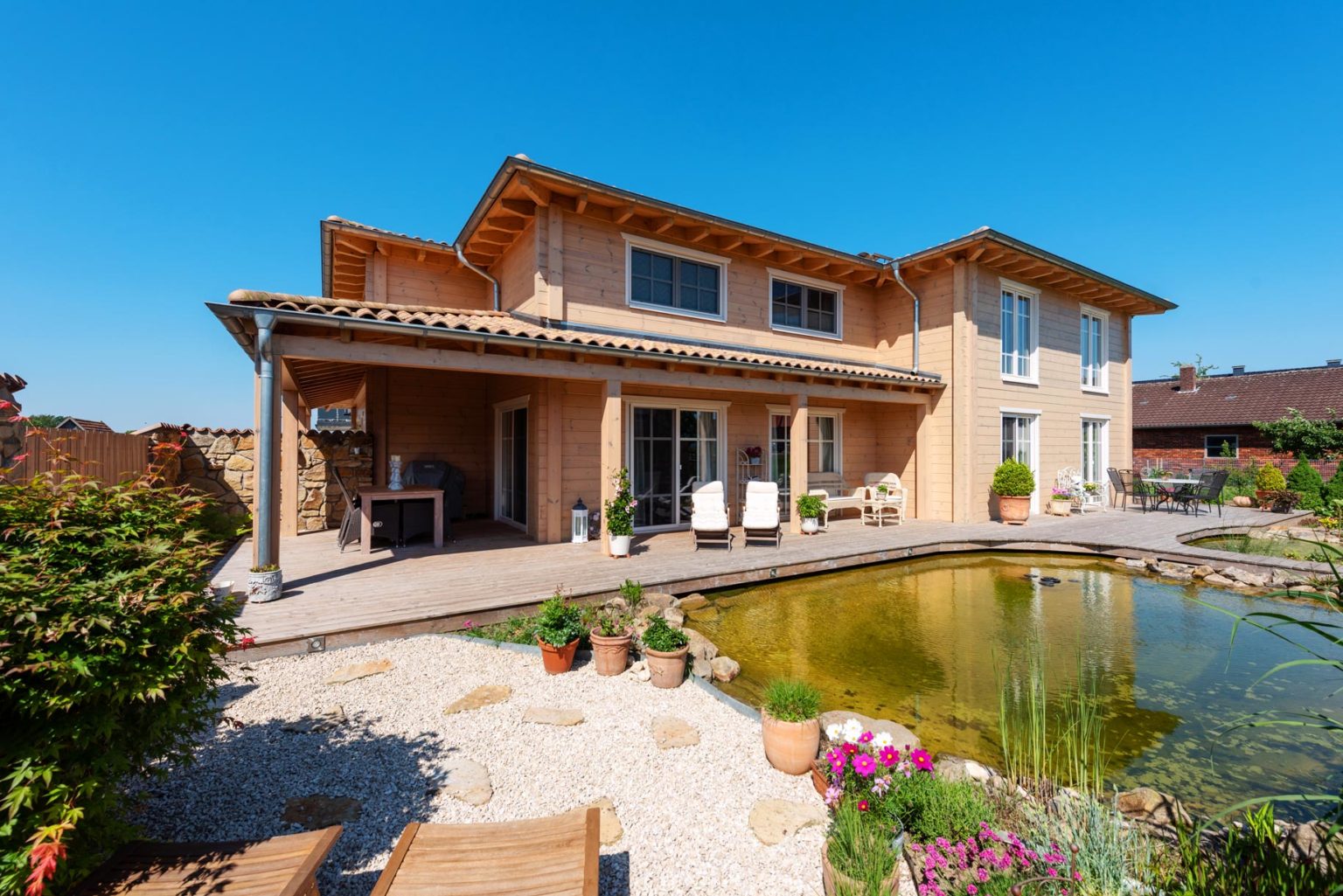 Durch den sehr hohen Kniestock und die flache Dachneigung des Walmdaches sind die Obergeschosse echte Vollgeschosse. Bei der Seniorin befinden sich zwei Schlafzimmer (je eins nach Westen und nach Osten) - davon eins mit angeschlossener Ankleide - und ein Badezimmer (Westseite) sowie ein Flur oben. Das Raumprogramm der Hauseigner bietet in diesem Geschoss neben dem Flur zwei Schlafzimmer (Ostseite), ein Arbeitszimmer (nach Westen), eine Ankleide (Südseite) und ein Badezimmer (nach Westen), ist also größer. "Dank der Dachkonstruktion und der vielen Winkel unseres Hausgrundrisses, haben wir sieben Firstecken unterm Dach. Jeder Raum hat eine andere Decken- und Schrägen-Landschaft und somit einen ganz eigenen Charakter.", schwärmt Gerd Bussmann. Die Böden aller Bäder und WCs wurden mit Fliesen in Holzdielenoptik verkleidet, während auf den Böden im Erdgeschoss des Eigentümerpaares dunkles, fußwarmes Echtholzparkett verlegt wurde. Die Nachbarin entschied sich auch dort für Fliesen. Die Böden im Obergeschoss erhielten Laminat in Holzoptik. Eine Fußbodenheizung erstreckt sich unter sämtlichen Böden; sie wird mit Hilfe einer Pelletsheizung und eines wasserführenden Kaminofens erwärmt. Ein Pufferspeicher befindet sich im Keller - Holzhaus Provence ist teilweise unterkellert. Der Kamin im Wohnbereich von Anne Schäfer und Gerd Bussmann wird mit Holzscheiten befeuert und dient als schneller, gemütlicher Wärmespender, aber auch als dekoratives Objekt. Mit einem Sandsteinsims eingefasst passt er perfekt zu dem schicken, leichten Landhausstil der Möbel, Accessoires und Schmucktapeten. Auch die cremeweiße Landhausküche passt perfekt ins Bild und harmoniert mit ihrer hellbraun/sandfarben-gemaserten Arbeitsplatte aus indischem Granit wunderbar mit den hellen, warmen Holzwänden. Die Hausherrin versteht es offensichtlich nicht nur Menschen zu verschönern sondern auch Häuser. Die Hauseigentümer und ihre befreundete Mieterin sind sich einig: In ihrer behaglichen Holzhaus Villa ist es viel gemütlicher als anderswo, und im Sommer heizt es sich darin nicht so doll auf. Letzteres verdanken die Räume nicht nur den guten Dämmeigenschaften der Massivholzwände sondern auch dem Terrassendach an der Südseite des Gebäudes und den relativ großen Dachüberständen des flach geneigten Walmdaches. Die Terrasse besteht aus Holz und verläuft im Garten entlang der fast gesamten Südseite und gesamten Ostseite sowie als Steg zwischen dem Naturschwimmteich und dem Filterteich. Ja, auch die Außenanlage von Holzhaus Provence ist stilecht mediterran gestaltet und wird schützend umschlossen von einer dekorativen, mannshohen Bruchsteinmauer mit Mönch/Nonnen-Tonziegeleindeckung obenauf. Allein der Anblick von außen weckt schon Urlaubsstimmung bei den Hausbewohnern, Nachbarn und Besuchern und für den typischen Sommer-in-der-Provence-Duft sorgen Blumen- und Kräuter-Töpfe, inklusive Lavendel.