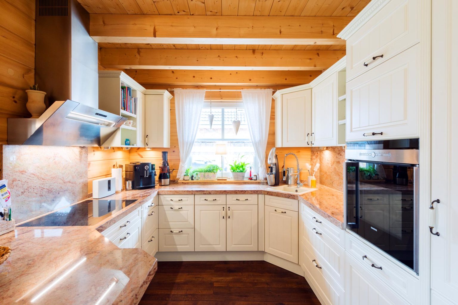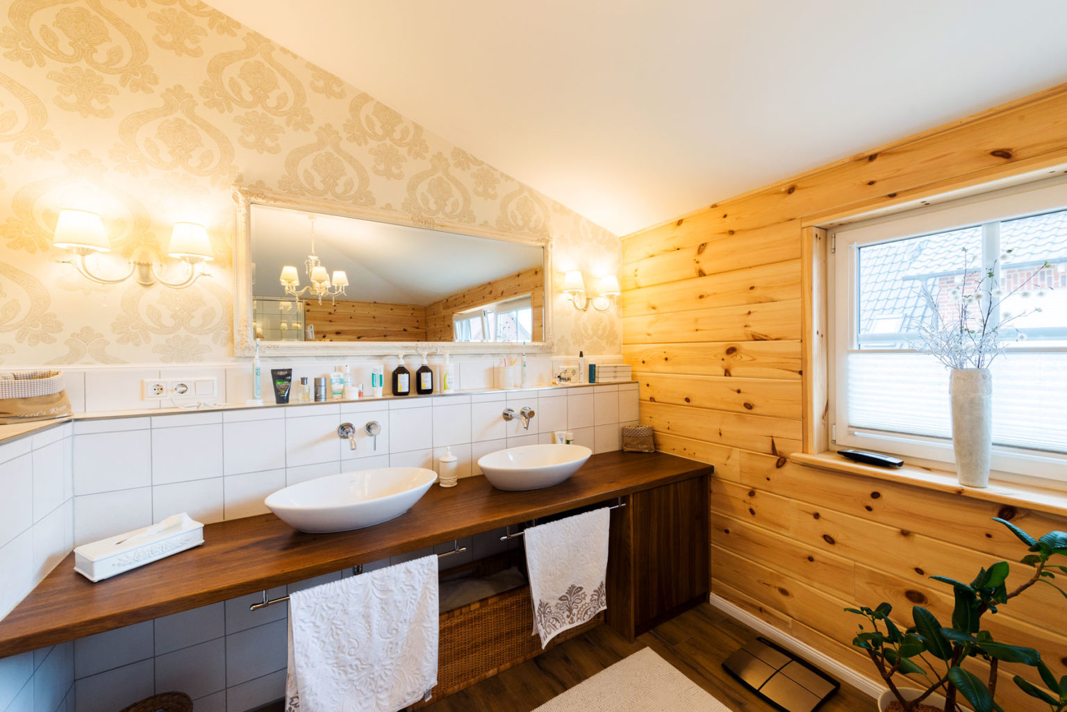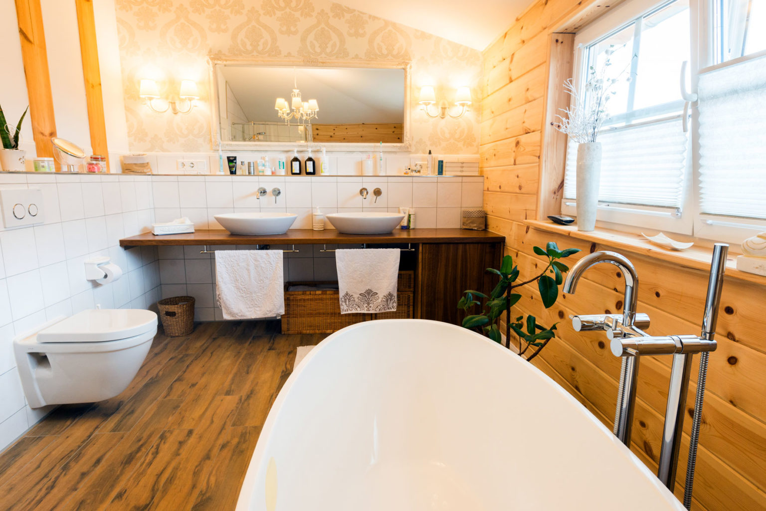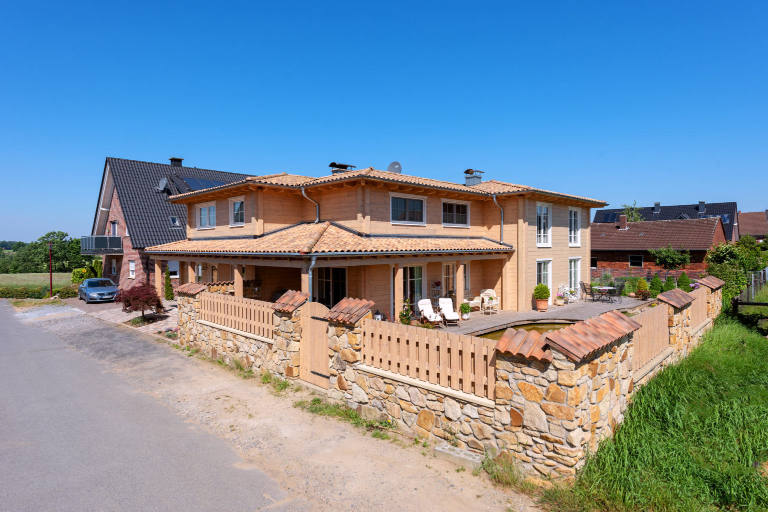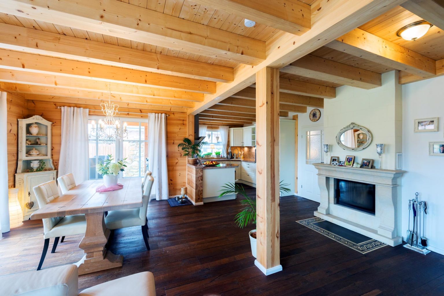 Durch den sehr hohen Kniestock und die flache Dachneigung des Walmdaches sind die Obergeschosse echte Vollgeschosse. Bei der Seniorin befinden sich zwei Schlafzimmer (je eins nach Westen und nach Osten) - davon eins mit angeschlossener Ankleide - und ein Badezimmer (Westseite) sowie ein Flur oben. Das Raumprogramm der Hauseigner bietet in diesem Geschoss neben dem Flur zwei Schlafzimmer (Ostseite), ein Arbeitszimmer (nach Westen), eine Ankleide (Südseite) und ein Badezimmer (nach Westen), ist also größer. "Dank der Dachkonstruktion und der vielen Winkel unseres Hausgrundrisses, haben wir sieben Firstecken unterm Dach. Jeder Raum hat eine andere Decken- und Schrägen-Landschaft und somit einen ganz eigenen Charakter.", schwärmt Gerd Bussmann. Die Böden aller Bäder und WCs wurden mit Fliesen in Holzdielenoptik verkleidet, während auf den Böden im Erdgeschoss des Eigentümerpaares dunkles, fußwarmes Echtholzparkett verlegt wurde. Die Nachbarin entschied sich auch dort für Fliesen. Die Böden im Obergeschoss erhielten Laminat in Holzoptik. Eine Fußbodenheizung erstreckt sich unter sämtlichen Böden; sie wird mit Hilfe einer Pelletsheizung und eines wasserführenden Kaminofens erwärmt. Ein Pufferspeicher befindet sich im Keller - Holzhaus Provence ist teilweise unterkellert. Der Kamin im Wohnbereich von Anne Schäfer und Gerd Bussmann wird mit Holzscheiten befeuert und dient als schneller, gemütlicher Wärmespender, aber auch als dekoratives Objekt. Mit einem Sandsteinsims eingefasst passt er perfekt zu dem schicken, leichten Landhausstil der Möbel, Accessoires und Schmucktapeten. Auch die cremeweiße Landhausküche passt perfekt ins Bild und harmoniert mit ihrer hellbraun/sandfarben-gemaserten Arbeitsplatte aus indischem Granit wunderbar mit den hellen, warmen Holzwänden. Die Hausherrin versteht es offensichtlich nicht nur Menschen zu verschönern sondern auch Häuser. Die Hauseigentümer und ihre befreundete Mieterin sind sich einig: In ihrer behaglichen Holzhaus Villa ist es viel gemütlicher als anderswo, und im Sommer heizt es sich darin nicht so doll auf. Letzteres verdanken die Räume nicht nur den guten Dämmeigenschaften der Massivholzwände sondern auch dem Terrassendach an der Südseite des Gebäudes und den relativ großen Dachüberständen des flach geneigten Walmdaches. Die Terrasse besteht aus Holz und verläuft im Garten entlang der fast gesamten Südseite und gesamten Ostseite sowie als Steg zwischen dem Naturschwimmteich und dem Filterteich. Ja, auch die Außenanlage von Holzhaus Provence ist stilecht mediterran gestaltet und wird schützend umschlossen von einer dekorativen, mannshohen Bruchsteinmauer mit Mönch/Nonnen-Tonziegeleindeckung obenauf. Allein der Anblick von außen weckt schon Urlaubsstimmung bei den Hausbewohnern, Nachbarn und Besuchern und für den typischen Sommer-in-der-Provence-Duft sorgen Blumen- und Kräuter-Töpfe, inklusive Lavendel.