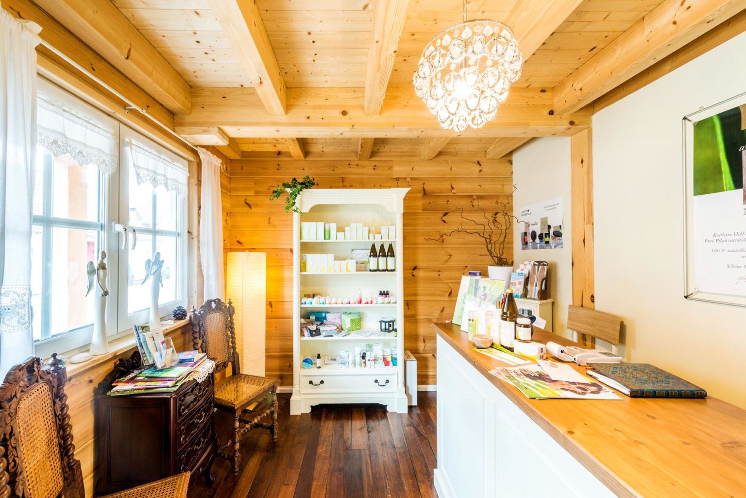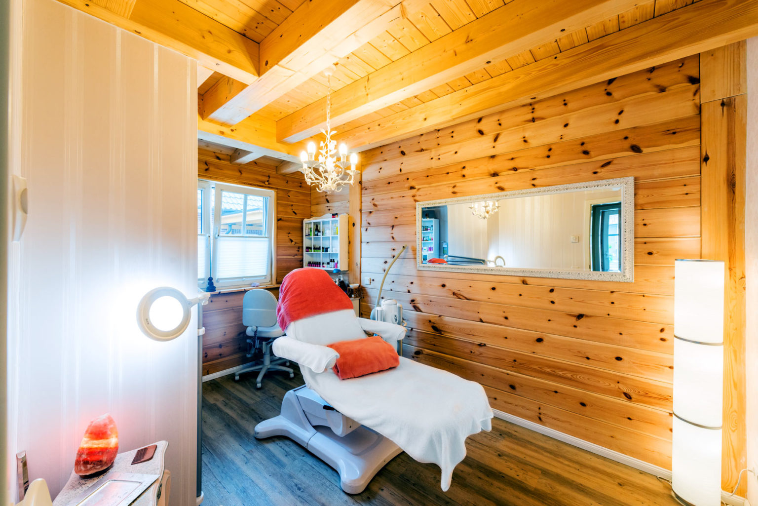 Die Suche nach dem passenden Baupartner dauerte ein Jahr; Eile war keine geboten um sich den Traum vom eigenen Holzhaus – Annes Herzenswunsch! – im luftig-leichten mediterranen Stil zu erfüllen. "Ein Grundstück hatten wir da auch noch nicht.", ergänzt Gerd Bussmann. "Fullwood hat uns mit der Setzungsfreiheit seiner Massivholzwände überzeugt, die sind Voraussetzung für unsere komplizierte Dachkonstruktion - und natürlich mit der glatten, schlichten Optik der Kiefernwände. Außerdem war es für die erfahrene Holzbaufirma kein Problem, ganz auf unsere Wünsche und Vorstellungen einzugehen. Nachdem ich Annes Entwurf digital umgesetzt hatte, so dass man auf dem Bildschirm im Haus umhergehen konnte, hat Fullwood den Entwurf dann mit seinem Know-how leicht korrigiert.", erzählt Informatiker Gerd. Er und seine Frau waren sich einig: Wenn schon Holzhaus, dann bitte massiv und einschalig. Besonders für Anne Schäfer stehen Natürlichkeit und gesunde Lebensweise an erster Stelle, sowohl privat als auch beruflich. Deshalb hat sie auch ihre Praxisräume im Eigenheim mit untergebracht. "Natürliche Kosmetikbehandlungen in einem wohltuenden Umfeld aus natürlichen Materialien durchzuführen ist nur konsequent. Da passt ein chemisch unbelastetes Holzhaus optimal.", freut sie sich. Außerdem kann Anne auf diese Weise selbst die meiste Zeit in den Genuss der wohngesunden, behaglichen Atmosphäre ihres Holzhauses kommen.