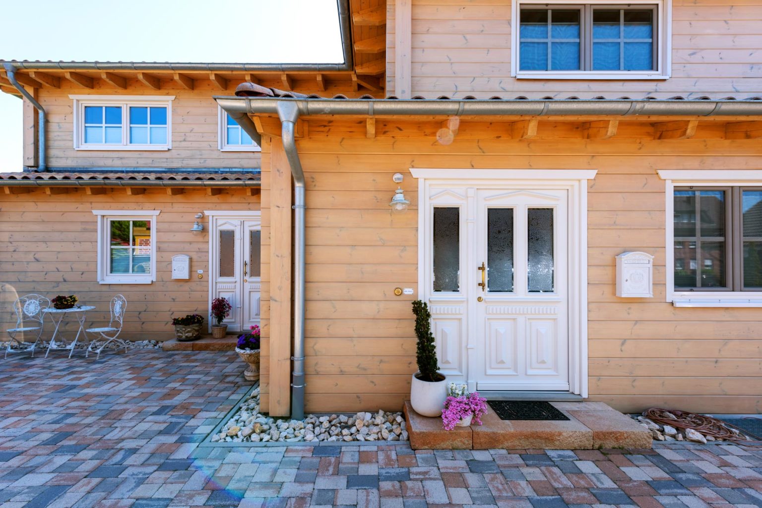 Einem Doppelhaus ähnlich beherbergt Holzhaus Provence zwei nebeneinander liegende, große Wohneinheiten, die sich jeweils über zwei Vollgeschosse erstrecken, über eigene Terrassen und Gartenabschnitte verfügen und natürlich separate Hauseingänge besitzen. Anne Schäfer wollte unbedingt ihre langjährige, mütterliche Freundin in der Nähe haben, zumal diese zwischenzeitlich verwitwet war. Nun ist die alte Dame ihre Mieterin mit eigenem Reich. "Beim Entwerfen hatte ich immer ein sonniges, helles Haus in der Provence vor Augen mit flachem Walmdach, großen bodentiefen Fenstern und lichtdurchfluteten Räumen. Aber aus Holz anstatt Stein, auch wegen des Raumklimas. Das Ganze in einem leicht wirkenden, hellen Landhausstil eingerichtet, so dass man die Lavendelfelder förmlich riechen kann.", schwärmt die Hausherrin. Da sie alles möglichst authentisch bis ins Detail wollten, ließen Gerd und Anne eigens Tondachziegel mit Patina aus Frankreich liefern und in der in Südeuropa traditionellen Mönch/Nonnen-Deckung montieren. Die Fenster sind cremeweiß, was das helle, leichte und sanfte Ambiente betont, und besitzen Verstrebungen, die den ländlichen Charakter hervorheben. Im Hausinnern werden die naturhellen Kiefernwände mit UV-Schutz vor dem Nachdunkeln bewahrt, und weiß gestrichene sowie hell tapezierte Trennwände (leichte Ständerbauweise) bringen noch mehr Helligkeit in die von reichlich natürlichem Licht durchfluteten Räume. Außen ist das Holz mit einem Anstrich im Farbton "Fichte" noch einen Tick aufgehellt und vor Vergrauung geschützt.