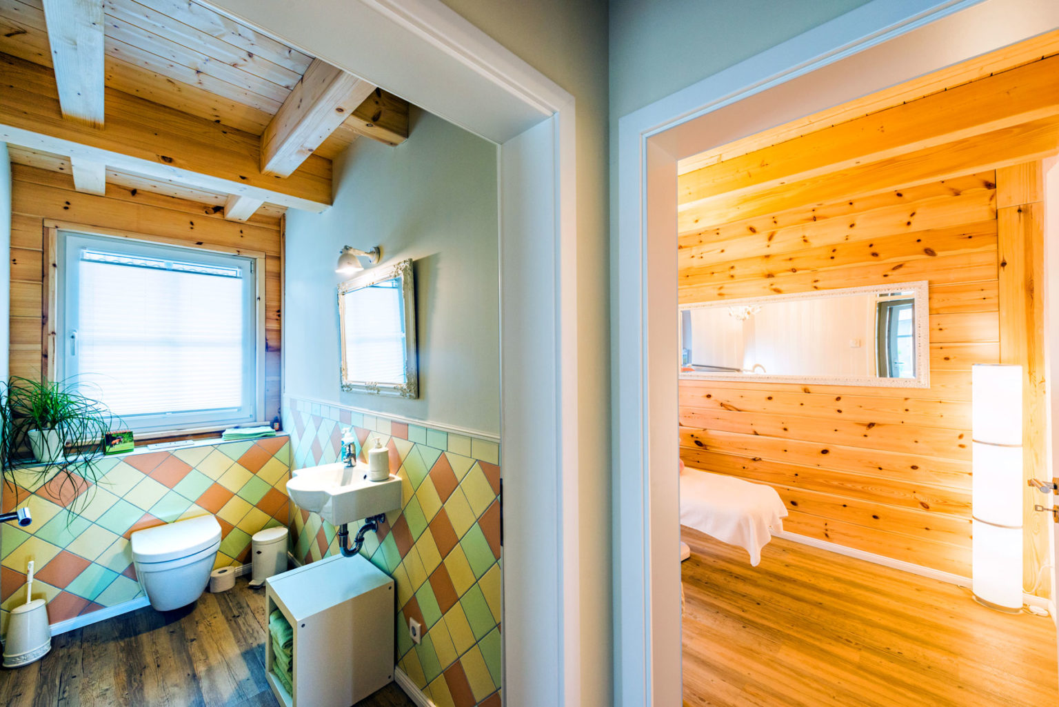 Die unterschiedlichen Bedürfnisse und Geschmäcker der beiden Hausparteien spiegeln sich in den Grundrissen wieder: Während Anne Schäfer und Gerd Bussmann einen weitläufigen Wohnbereich mit offener Küche bevorzugen, wohnt ihre Mieterin lieber klassisch mit großem Wohn/Esszimmer und abgetrennter, geschlossener Küche. Die Haushälfte des Ehepaares ist größer, auch weil sich die Praxis von Anne – selbstverständlich mit eigenem Eingang – darin befindet. Ihre Kundinnen brauchen nicht durch den privaten Bereich gehen um in die Behandlungsräume zu gelangen, aber die Hausherrin kann vom Wohnbereich direkt in den kleinen Flur der Praxis eintreten. Das Erdgeschoss der befreundeten Mieterin beinhaltet eine Diele, von der es links ins Gäste-WC geht und rechts die Geschosstreppe ins Obergeschoss führt. Ein paar Schritte weiter befindet sich links die Küche (Fenster nach Norden) mit angeschlossener Speisekammer und geradeaus gelangt man in den großzügigen Wohn/Essbereich. Bei Anne und Gerd befinden sich im Erdgeschoss eine kleine Diele mit Treppe hinab zum Keller und geradeaus Zugang in den offenen, besonders großzügigen Wohnbereich. Von hier geht es links hinauf ins Obergeschoss sowie weiter rechts durch eine Tür in den kleinen Flur zur Praxis (ein Empfangsraum und ein Behandlungsraum). Das obligatorische Gäste-WC ist über den Praxisflur erreichbar. Während die Wohnbereiche in beiden Hauseinheiten nach Osten ausgerichtet sind, befindet sich die offene Küche bei Anne und Gerd in einer Nische nach Süden. Die Hauseingänge befinden sich jeweils an der Westseite und der Praxiseingang an der Südseite von Holzhaus Provence.