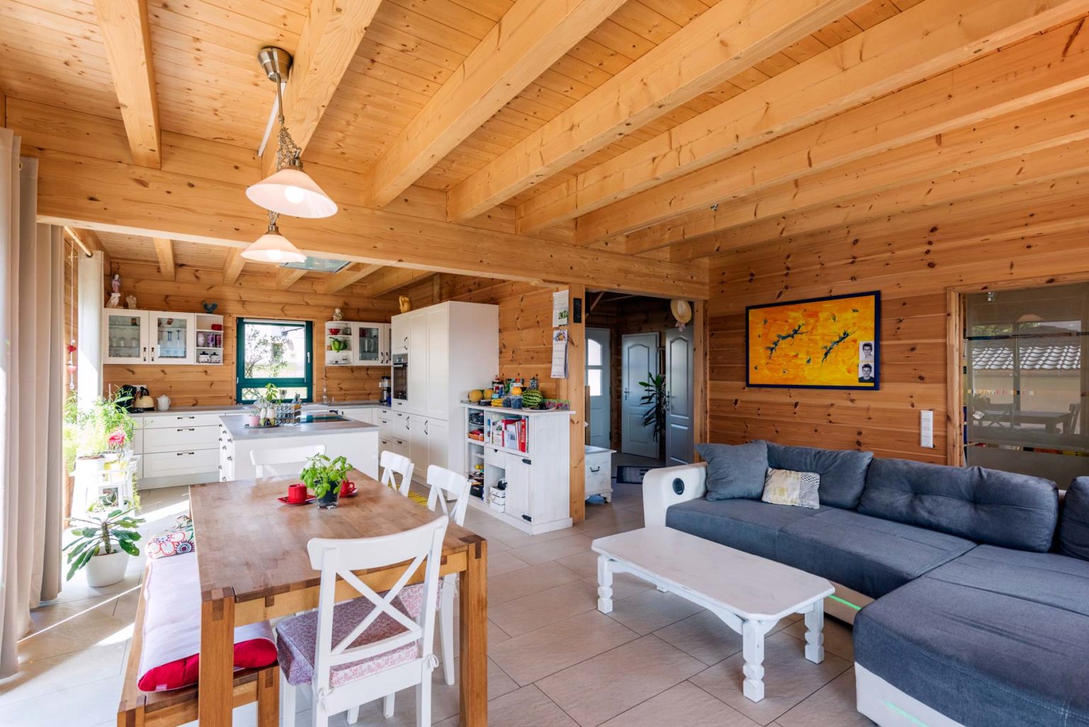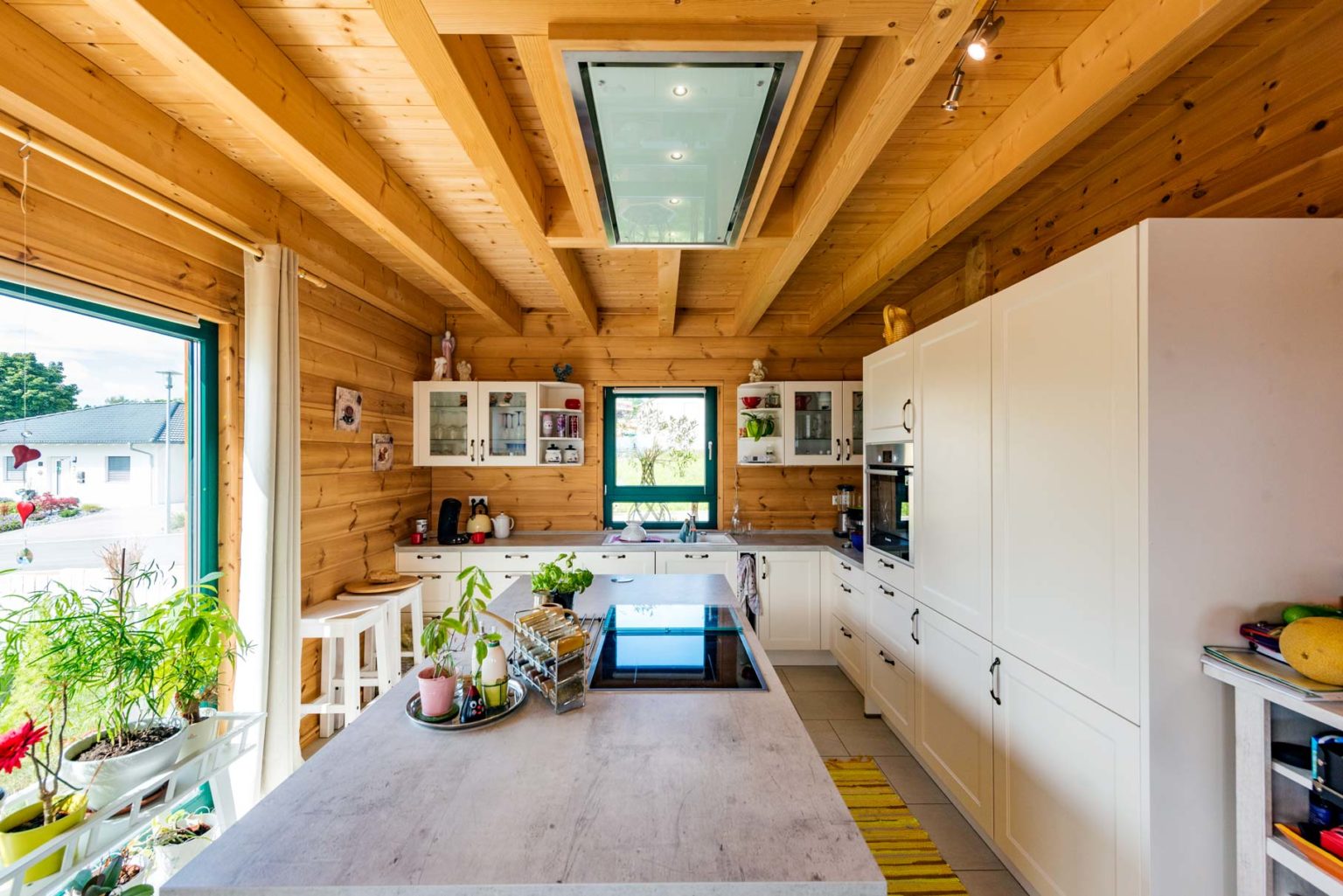 Ihm und seiner Frau ist besonders das gesunde und sich angenehm anfühlende Wohnklima im Eigenheim wichtig. Aus Überzeugung entschied sich das Ehepaar deshalb für die einschalige Blockwand, die nicht nur für ihre gute Dämmeigenschaft und solide Langlebigkeit bekannt ist, sondern sogar Setzungsfreiheit verspricht. "Wir gingen mit unserem fertigen Grundriss zu Fullwood. Die Profis haben dann alles ins Machbare und zum Grundstück passend umgesetzt.", erinnert sich der Hausherr. "Wir sind so froh mit Fullwood gebaut zu haben: Der Kontakt mit dem geduldigen Berater war sehr nett und persönlich, und das Montageteam hat super Arbeit geleistet.", schwärmt Mariola Venzin, die auch für das leibliche Wohl der Handwerker während der Hausaufbauphase sorgte. Holzhaus "am Rheinfall" ist mit insgesamt 130 m² Wohn- und Nutzfläche für 5 Personen eher knapp bemessen, deshalb ist es umso wichtiger, den vorhandenen Platz perfekt zu nutzen. So ist das Erdgeschoss größtenteils offen gehalten: Diele, Wohnzimmer, Esszimmer und Küche vereinen sich zu einem großen Raum und werden von einem Gäste-WC, einem Technikraum und einem Arbeitszimmer ergänzt. Draußen schließt sich dem Wohn/Ess-Bereich eine große, teils überdachte Terrasse an. Fünf Fenster, davon drei bodentief und doppelflügelig, lassen von Osten (Küche), Süden (Küche und Essbereich) und Westen (Ess- und Wohnzimmer) viel Tageslicht herein. "Helligkeit und natürliches Licht im Haus ist uns sehr wichtig.", sagt die Hausherrin – auch oder gerade im Holzhaus. Deshalb wählte die Familie auch viel weiß fürs Mobiliar und die Zimmertüren sowie einen sehr hellen Fliesenboden. Die Wände hingegen sind alle aus Holz (Trennwände aus leichtem Ständerbau mit Holzverkleidung).