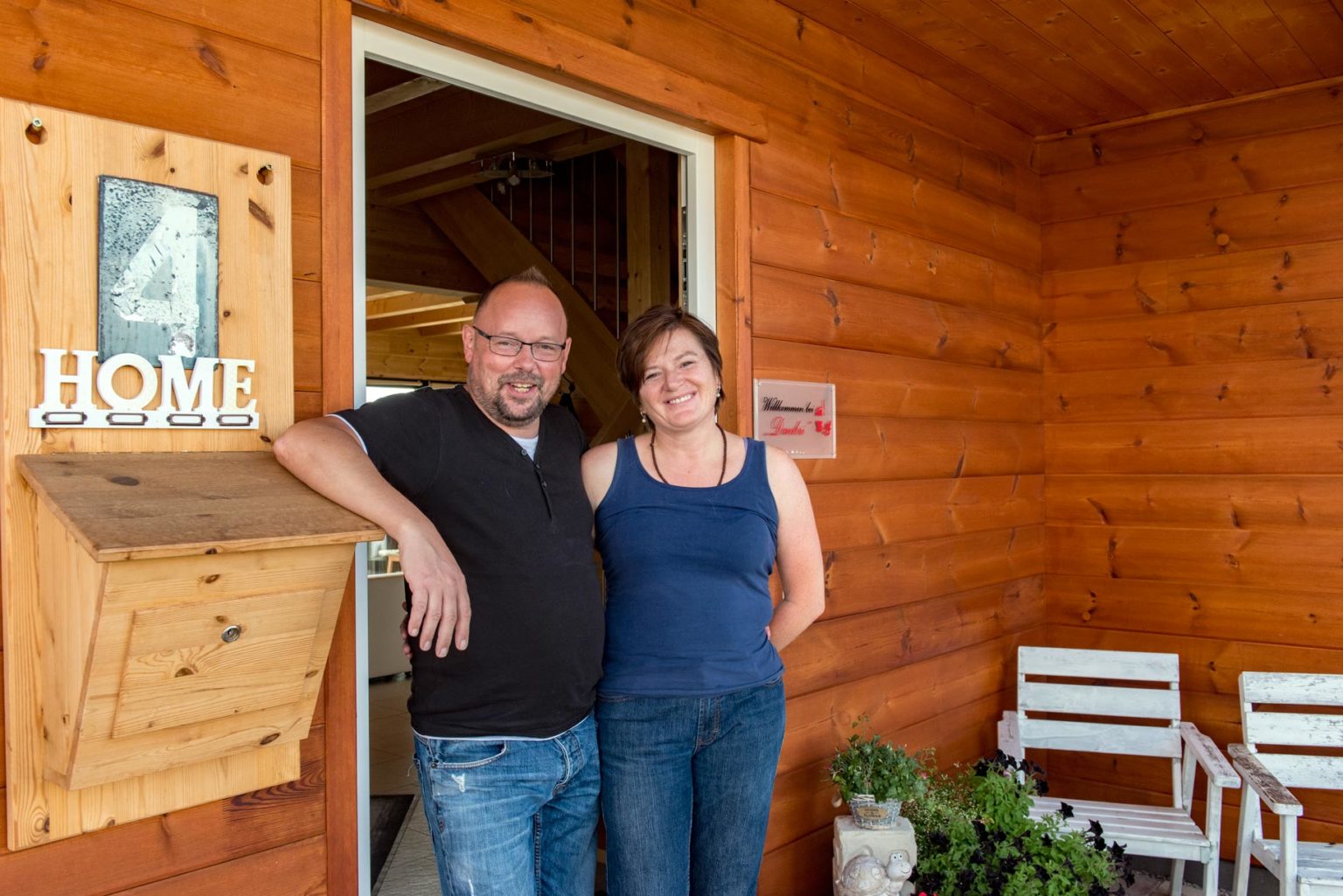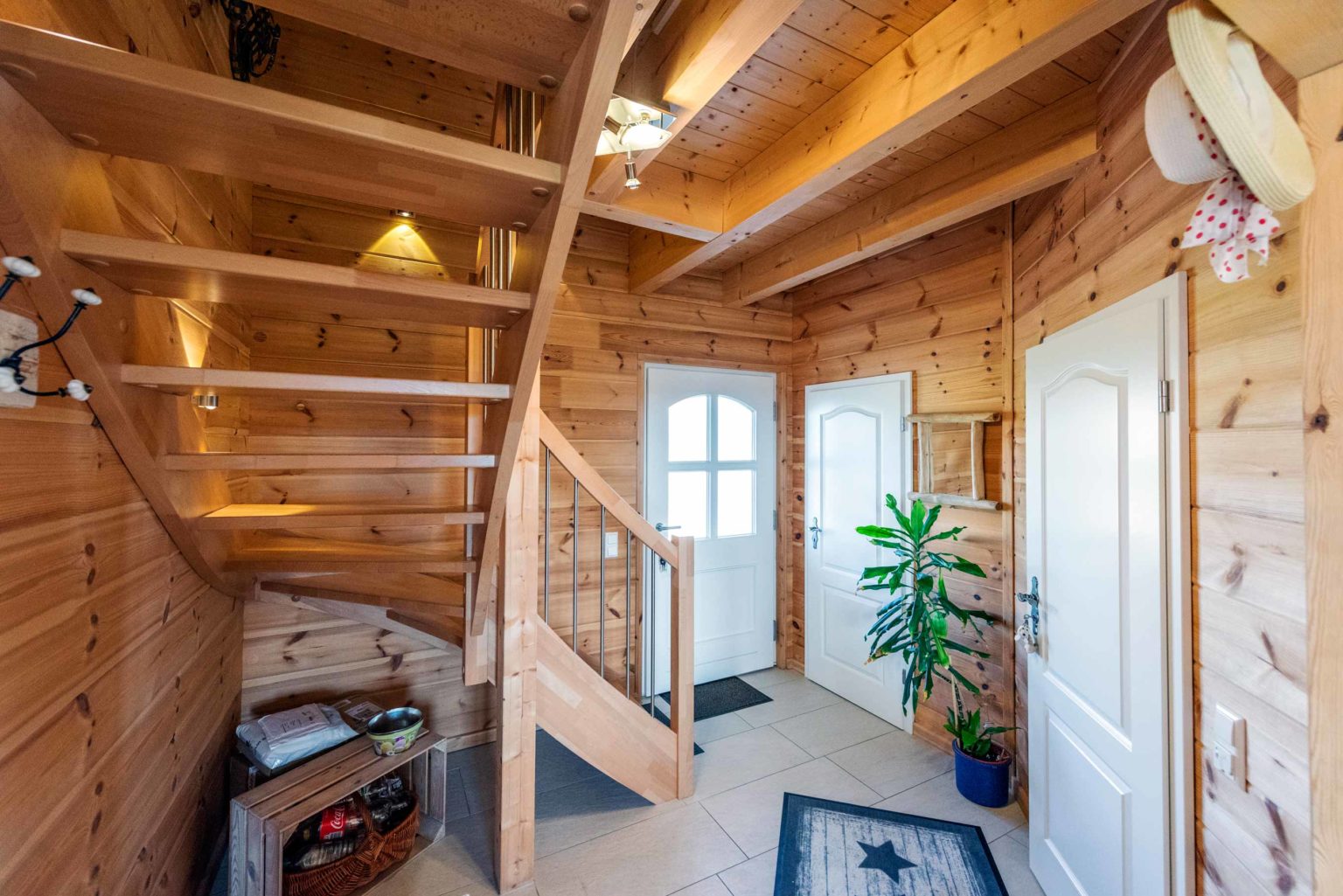 Das Arbeitszimmer ist vom Wohnbereich zu betreten und besitzt eine platzsparende, dezente Schiebetür aus undurchsichtigem Glas, die zusätzliches Licht in den kleinen Raum (mit einem eigenen Fenster) durchlässt. Von der Diele führt eine leicht und transparent wirkende Holztreppe hinauf ins Dachgeschoss wo sich das Schlafzimmer der Eltern und drei Kinderzimmer sowie ein Badezimmer befinden. Alle Zimmer sind von einem Flur aus zu betreten. Während Ehepaar Venzin außen großen Wert auf einen Schutzanstrich der Kiefernwände legt, dürfen die Wände und offenen Balkendecke drinnen natürlich und unbehandelt bleiben und getrost etwas nachdunkeln. "Uns gefallen dunkelgrüne Fenster und ein rotes Tonziegeldach am besten zur Farbe unseres Holzhauses. Da hatten wir freie Wahl, wie in allen gestalterischen Dingen.", sagt Mariola Venzin. Auch bezüglich (Heizungs-) Technik machte höchstens das Bauamt Vorschriften, nicht aber Fullwood. "Mit Öl oder Gas wollen wir nicht heizen und setzen stattdessen auf eine Kombination aus Luftwärmepumpe, Photovoltaikanlage und solarer Warmwassererzeugung. So sind wir unabhängig von schwankenden Energiepreisen.", meint Brian Venzin, der selbst aus der Heizungsbranche kommt. Eine voluminöse Regenwasserzisterne liefert Wasser für den Garten.