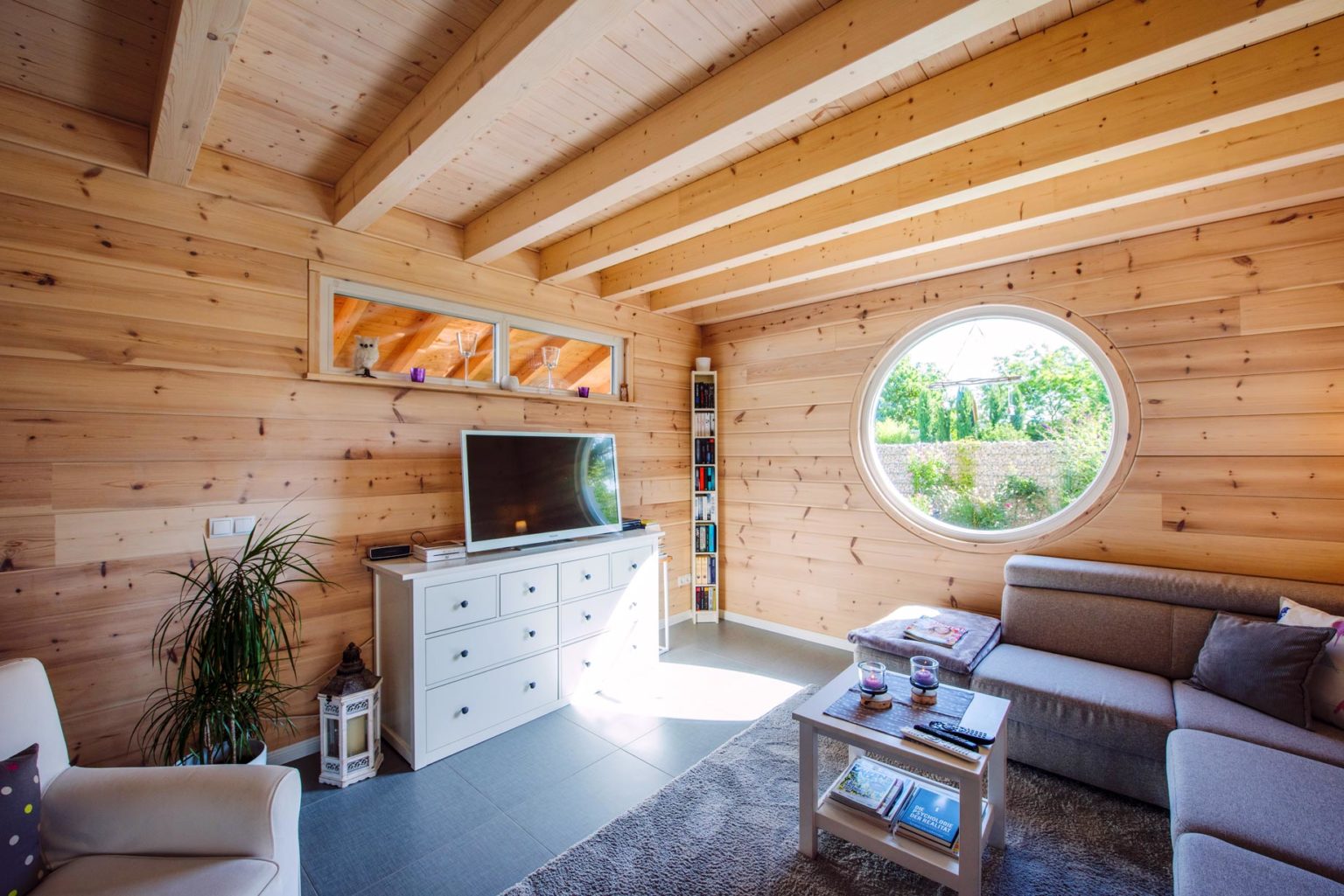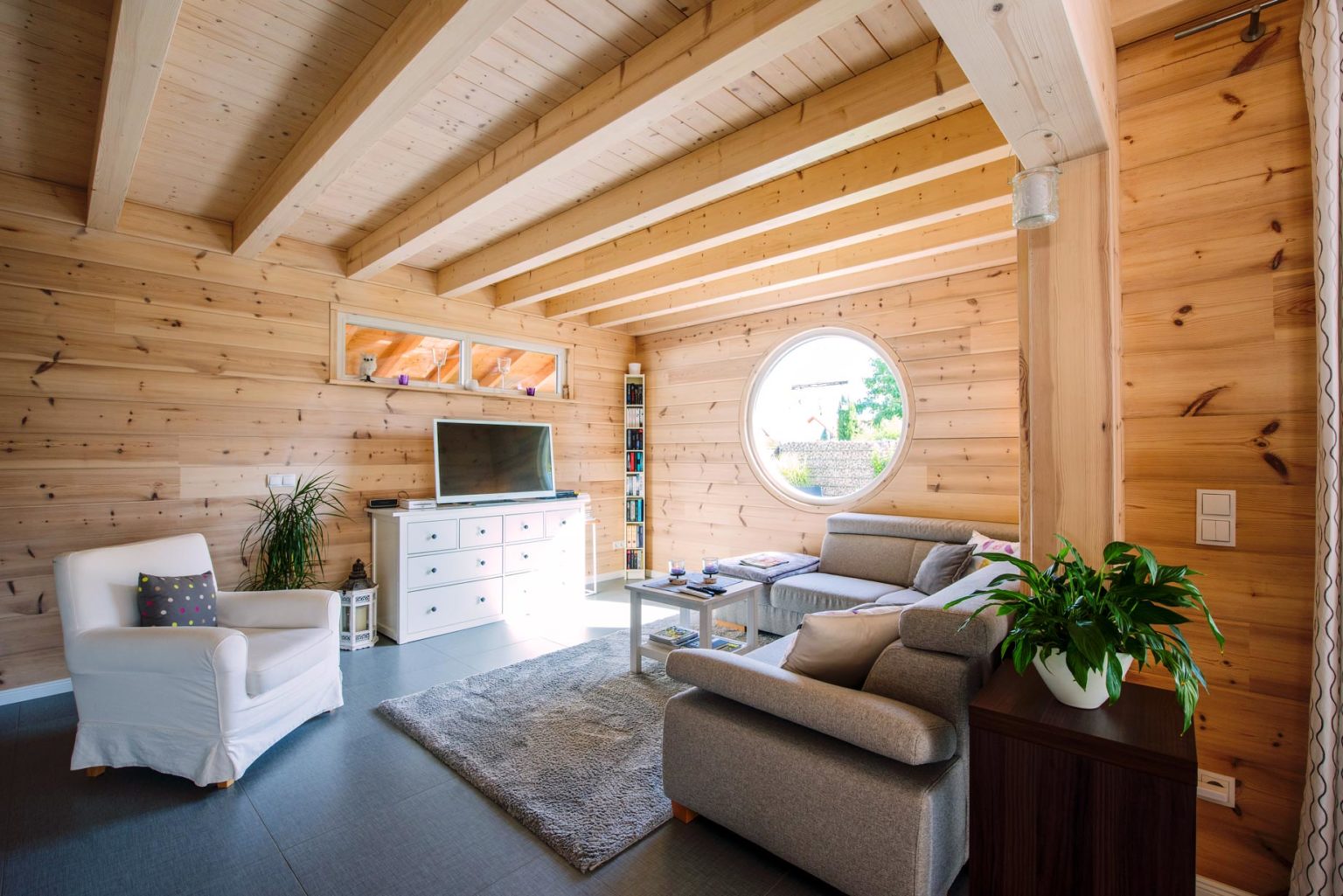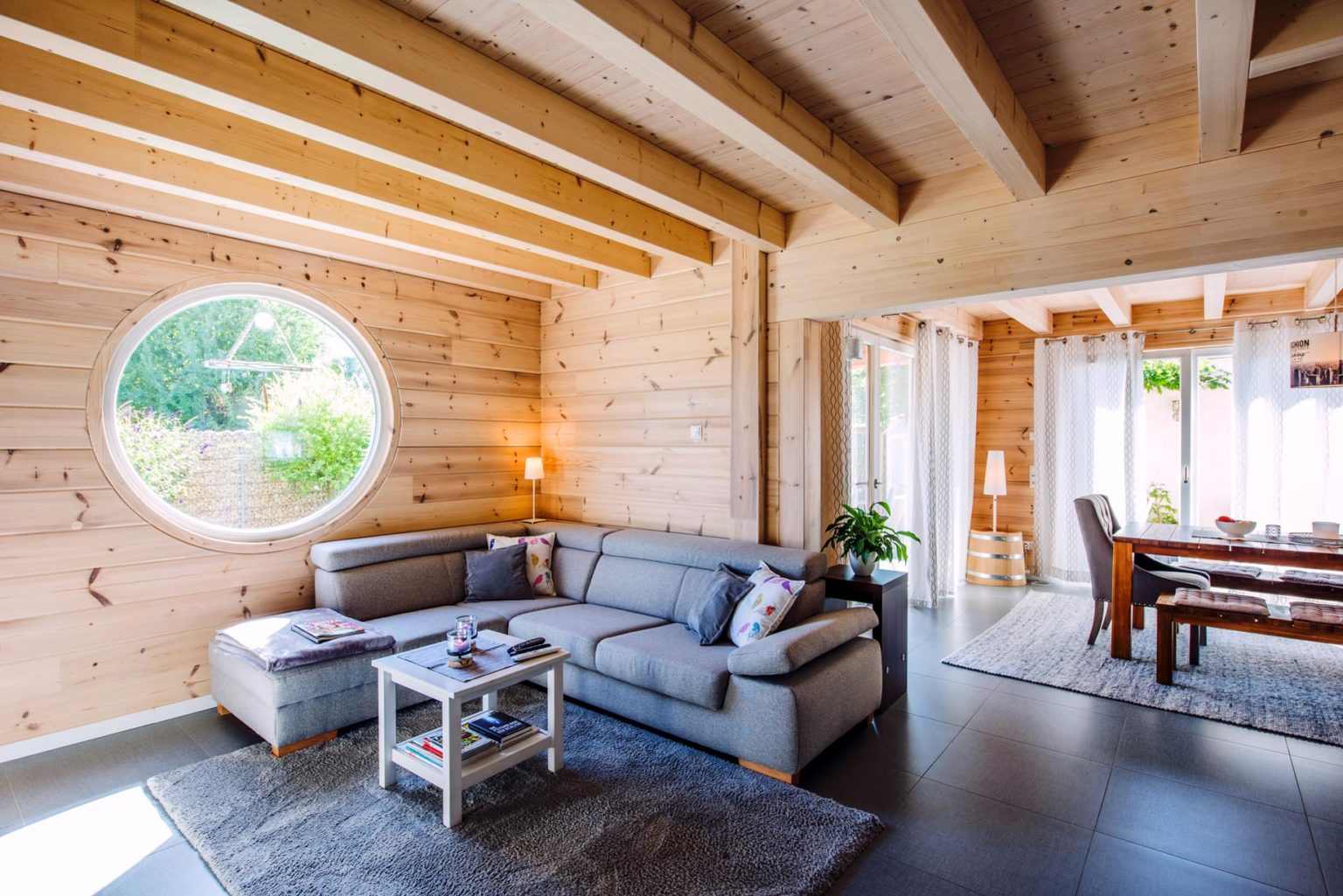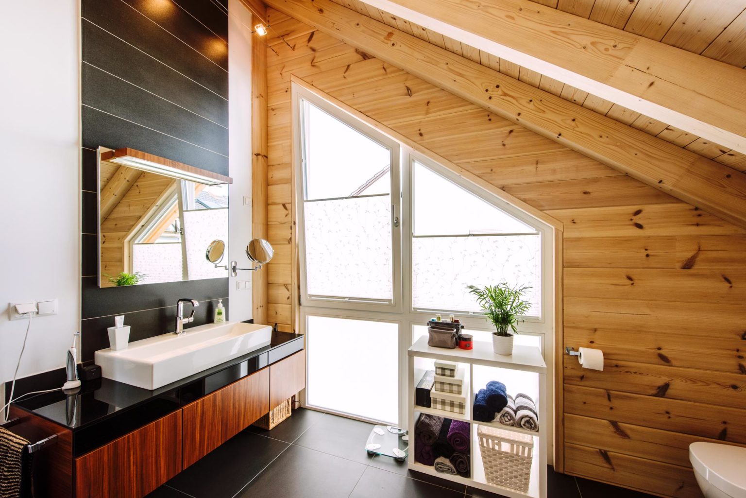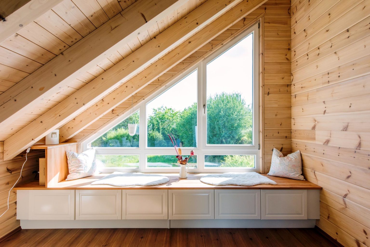 Nicht nur ein äußerlich helles Holzhaus ist den Matterns wichtig, sondern auch lichtdurchflutete und hell gestaltete Räume. "Damit unser Holzhaus nicht vergraut, haben wir es gestrichen. Zwar ist das verbaute Kiefernholz an sich schon sehr hell, aber wir wollten es noch einen Tick aufhellen und haben deshalb den Farbton "Fichte" gewählt.", erklärt Anton Mattern. Innen wurde ein neutraler UV-Schutz aufgetragen, damit nichts nachdunkeln kann. Dazu kombinierte das Paar, das sich in sämtlichen Einrichtungs- und Geschmacksfragen immer einig ist, weiße Fenster, reichlich an der Zahl und üppig in der Größe. "Unser Highlight ist natürlich das runde Fenster in der Sofaecke. Es wirkt sehr dekorativ, fast wie ein Bild.", meint Miriam Mattern. Aber auch das darüber befindliche, annähernd einem rechtwinkligen Dreieck entsprechende, riesige Giebelfenster im Dachgeschoss macht viel her. Drinnen besitzt es eine besonders breite und bequeme Fensterbank aus Holz, auf der man es sich sehr gemütlich machen kann. Dunkel sind außen nur die anthrazitfarbenen Dachziegel und innen wenige schwarze und anthrazitfarbene Elemente im Bad. Weiß und helle Grautöne dominieren sowohl Möbel als auch Bodenfliesen genauso wie die Trennwände (Leichtbau). Auch die Türen sind weiß oder aus Milchglas. Zwei Trennwände wurden in Flieder gestrichen (Diele und Wohnzimmer), um ein wenig Farbe ins Spiel zu bringen. Der Flur im Dachgeschoss erhielt eine verspielt gemusterte Tapete in pastellrosa. Alles harmoniert wunderbar, auch diejenigen vereinzelten Möbelstücke sowie die Geschosstreppe (Nussbaumholz) im warmen, dunkleren Braunton. Guter Geschmack und Sinn für Gestaltung wurde Anton und Miriam Mattern offenbar in die Wiege gelegt.