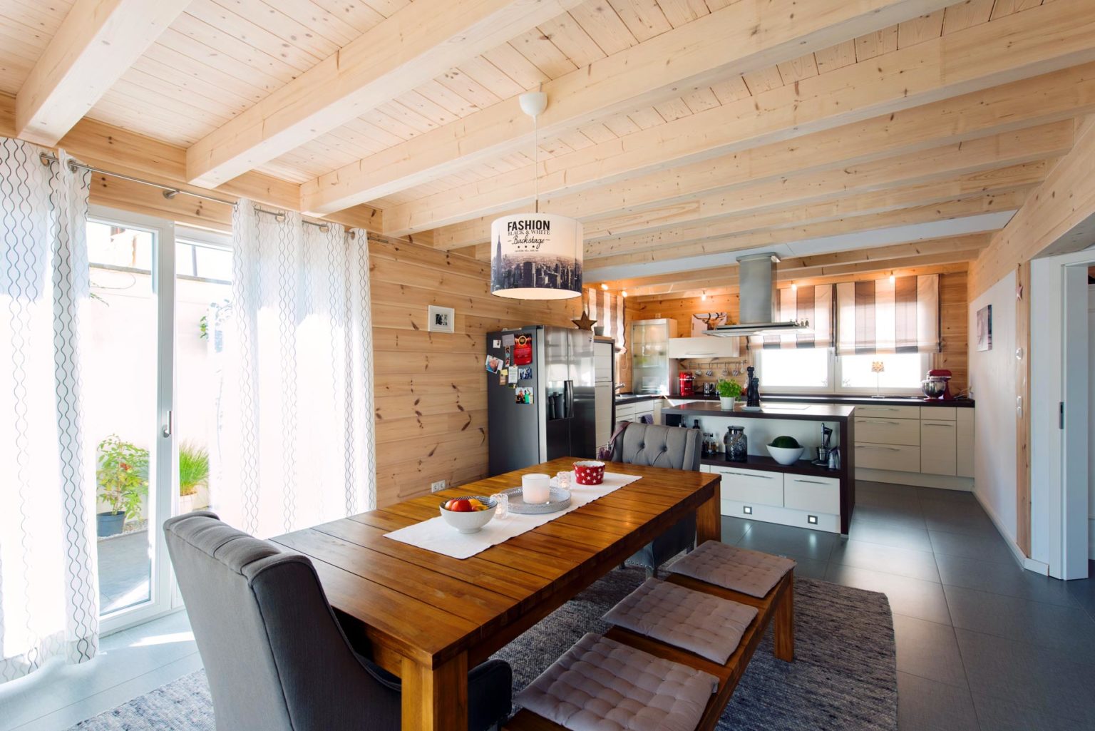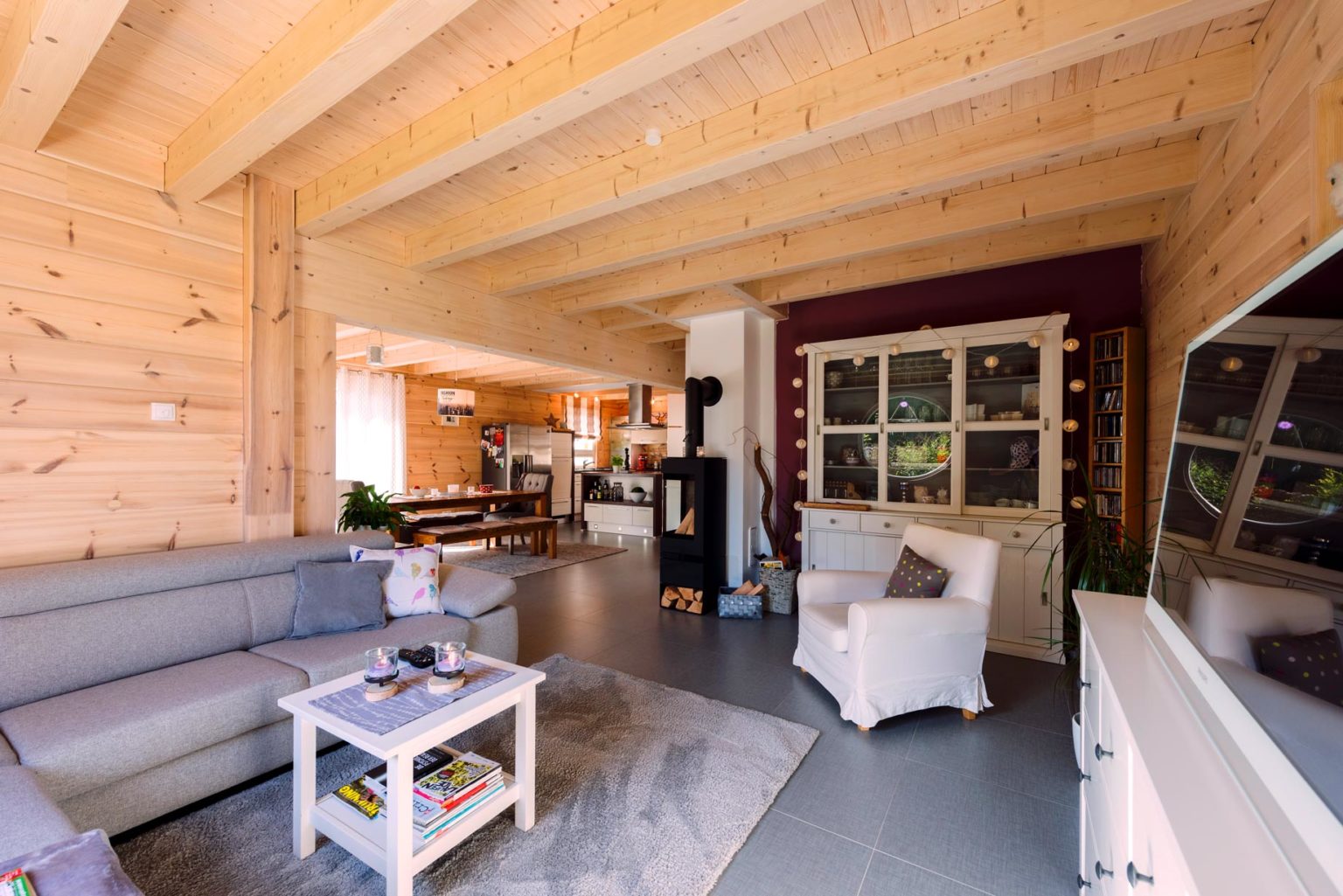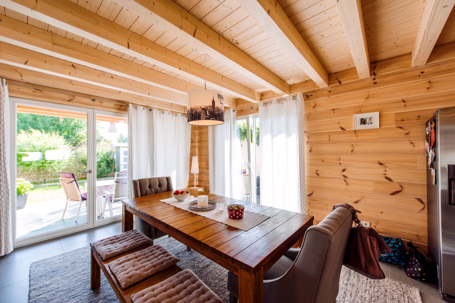 "Wir haben uns im Erdgeschoss für Fliesenböden entschieden, da wir befürchteten, dass Holzböden im Holzhaus zu viel Holz wären. Im Dachgeschoss wählten wir nur im Bad Bodenfliesen und ansonsten preisgünstigen Laminatboden in Holzdielenoptik.", sagt Anton Mattern. Die hellgrauen Fliesen im Erdgeschoss sind außergewöhnlich: ihr dezentes Muster erinnert an Textilstruktur, vergleichbar mit den Resopal Platten vergangener Zeiten. "Wir lieben unser Holzhaus und fühlen uns rundum wohl darin!", strahlt Miriam Mattern überzeugt. Sie und ihr Mann mögen außerdem Florida und Schwedische Holzhäuser und haben sich stilistisch von deren modernen Landhausstil inspirieren lassen. "Ursprünglich wollten wir unser Holzhaus ochsenblutrot mit weißen Akzenten streichen. Als dann aber die frischen, hellen Kiefernwände geliefert wurden, hielten wir es für ein Verbrechen eine so ganz andere Farbe darüber zu streichen!", gesteht Anton Mattern. Die Massivholzwände von Holzhaus Rheinglück sind extrem solide und 20cm dick, dementsprechend dämmen sie hervorragend und sind dank der Fertigkonstruktion absolut winddicht und sogar setzungsfrei. "Außer im Bad haben wir oben noch nie die Heizung angemacht, und den Wohnbereich beheizen wir überwiegend mit unserem Kaminofen.", erwähnt der junge Hausherr erfreut. Die Betriebskosten für die Gasheizung (Fußbodenheizung) sind entsprechend niedrig. Unterstützt wird die Wassererwärmung solar. Eine Regenwasserzisterne fängt wertvolles Nass in der trockenen Wohngegend auf. "Die Kiefernwände erzeugen ein sehr angenehmes Wohnklima und geben permanent einen ganz zarten Duft ab.", schwärmt Miriam Mattern. Sie und ihr Mann haben es nicht bereut ein massives Holzhaus mit Fullwood gebaut zu haben!