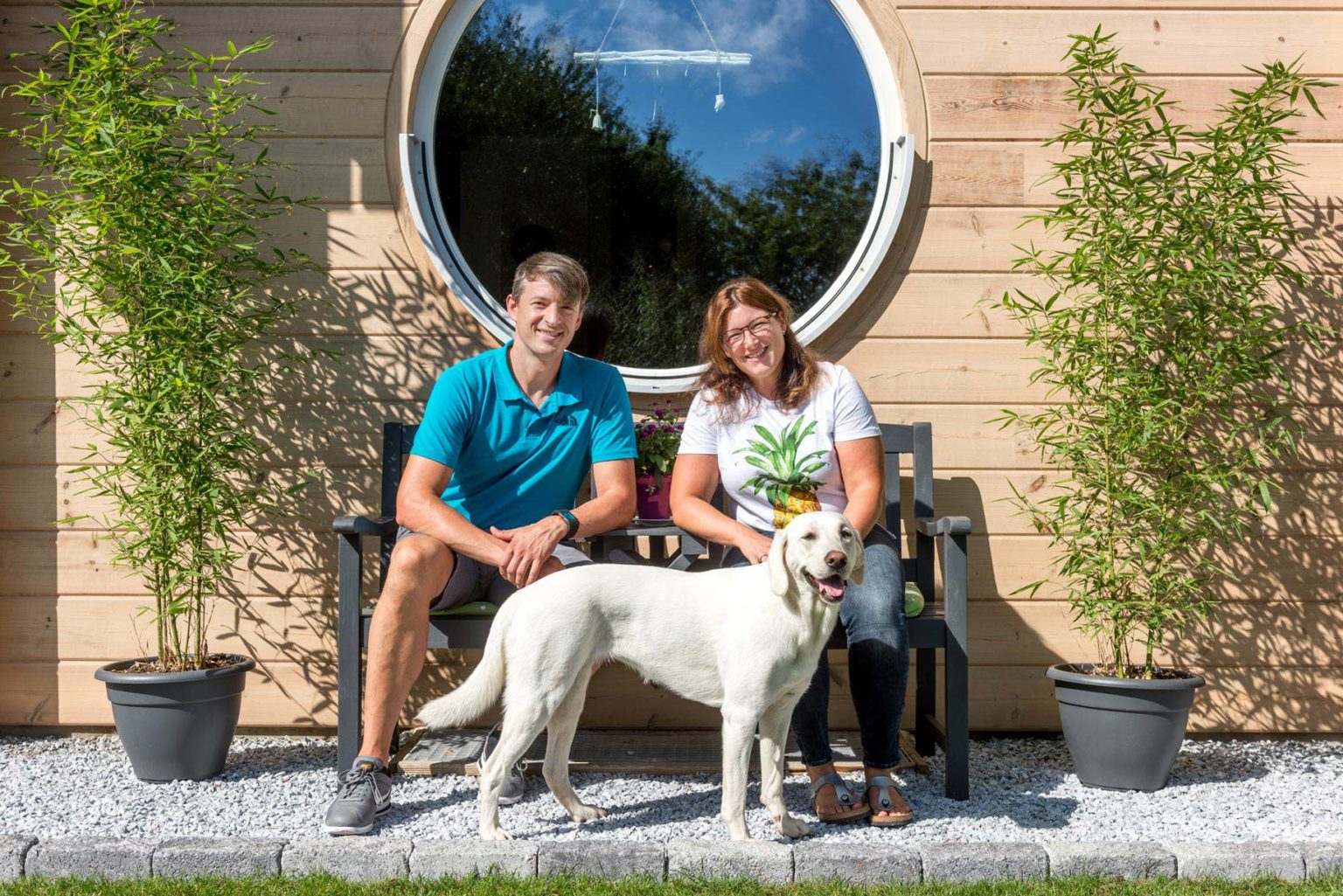 "Wir haben uns für eine Richtmeistermontage entschieden, bei der ein Zimmermann von Fullwood Regie führt und vorarbeitet.", erzählt Miriam Mattern und ihr Mann ergänzt: "Ich habe dreizehn Geschwister, da ist nahezu jedes Handwerk vertreten. Vom Küfer über Elektriker, Heizungsbauer und Installateur bis zum Allrounder ist alles dabei." Nur für den Kellerbau, die Hofeinfahrt und die Dacheindeckung engagierte das gut organisierte Paar örtliche Fachhandwerker außerhalb der Familie. "Es lief alles wunderbar und der Richtmeister arbeitete routiniert und perfekt. Die einzige Herausforderung war für ihn der Einbau des runden Fensters. Aber auch das hat er super hinbekommen.", äußert sich der Hausherr begeistert. Den Garten legten Anton und Miriam Mattern ebenfalls selbst an. Bevor es aber ans Bauen ging plante Fullwood Holzhaus "Rheinglück" zusammen mit den Bauherren ganz nach deren Bedürfnissen und Vorstellungen, passend auf das kleine Grundstück in zweiter Reihe abgestimmt. Die massiven Kiefernwände wurden anschließend im Werk exakt vorgefertigt und in wenigen Elementen samt Deckenbalken, Dachsparren und sonstigem Baumaterial zum Baugrundstück geliefert. Ein Kran hievte alles an Ort und Stelle, so dass die Hausmontage mit allem Drum und Dran nur eine Woche dauerte.