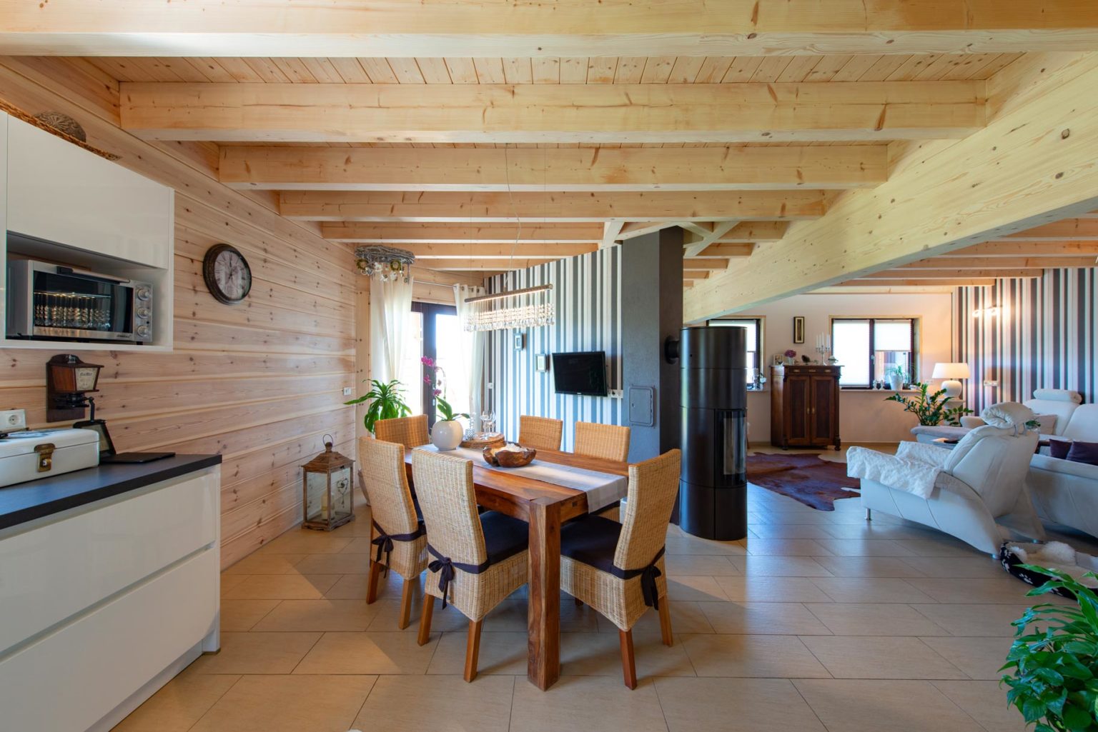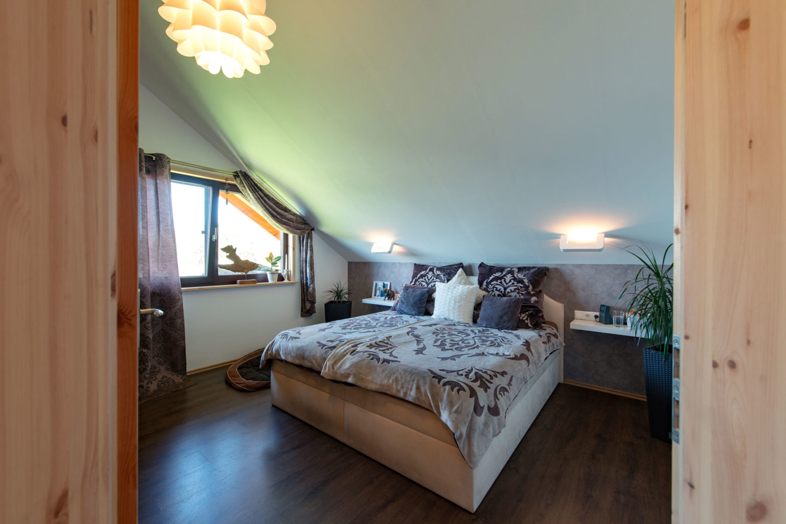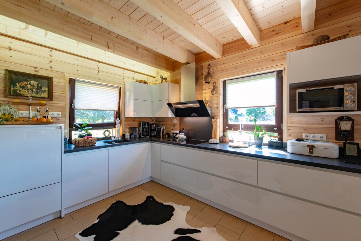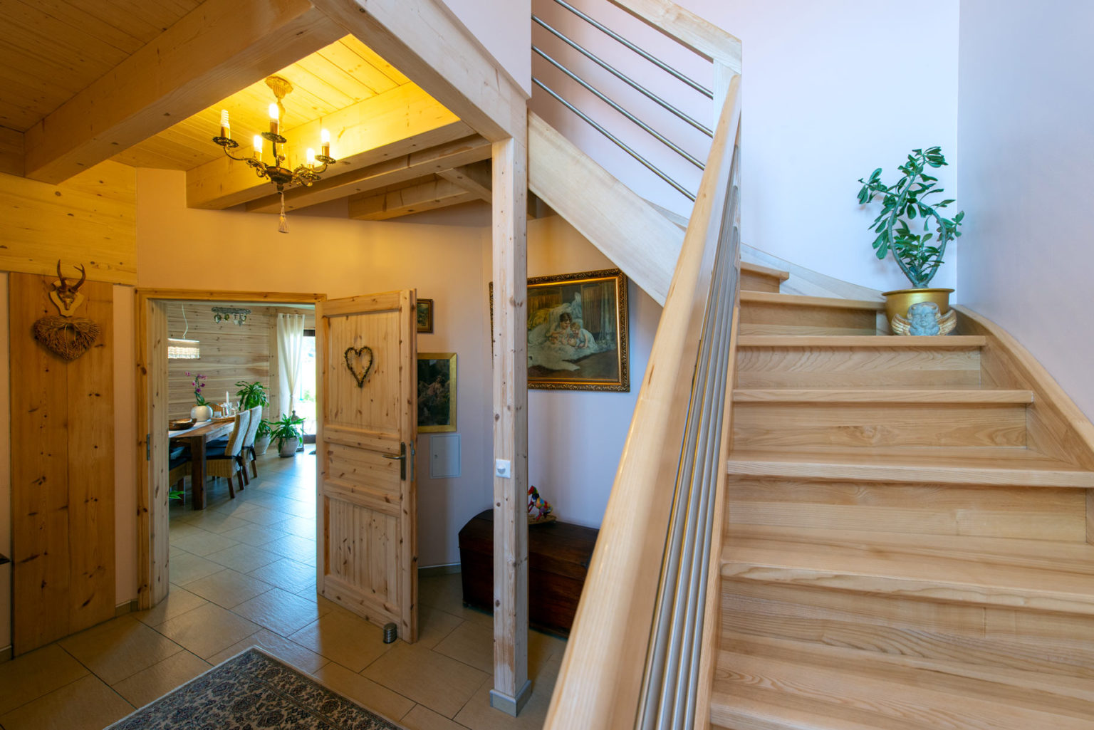 Zusammen mit Familie und Freunden hat der Hauseigentümer Holzhaus „Rösserwiesen“ im Rahmen einer „Richtmeistermontage“ selbst gebaut. Heizung/Sanitär, Elektrik, Dacheindeckung und Fliesen hat er dann von befreundeten Fachhandwerksfirmen machen lassen und dabei immer mitgeholfen, wo er konnte. „Es hat eineinhalb Jahre gedauert, bis wirklich alles fertig war. Miteingerechnet sind da die Vorarbeiten bis zur Hausanlieferung. Eingezogen sind wir aber schon sechs Monate nach Baubeginn, als das Erdgeschoss fertig ausgebaut war.“, erinnert sich die Hausherrin. Zwischenzeitlich wohnte das Ehepaar in einem Container auf dem Baugrundstück, was sehr praktisch war, und hatte auch die Möbel in einem Container zwischengelagert. An den weitläufigen Garten angrenzend, leben die Pferde von Ralf und Kamila Hensel. „Es ist ein Traum für Reiter mit den eigenen Pferden zusammen zu leben, noch dazu mitten in einem herrlichen Ausreitgebiet. Die Krönung ist aber unser Holzhaus, das für uns etwas ganz Besonderes ist und genau unseren Traumvorstellungen entspricht.“, äußert Ralf dankbar. Im Dachgeschoss wählte er eine Balkenlage mehr als bei Fullwood üblich ist, um den Kniestock zu erhöhen. Während die Holzwände außen mit einem warmen, vor Vergrauung schützenden Farbton lasiert wurden, erhielten sie innen lediglich eine UV-Schutzlasur, die vor natürlichem Nachdunkeln durch Sonneneinstrahlung bewahrt. Auch die Sichtbalkendecken bleiben dank des UV-Schutzes naturhell.