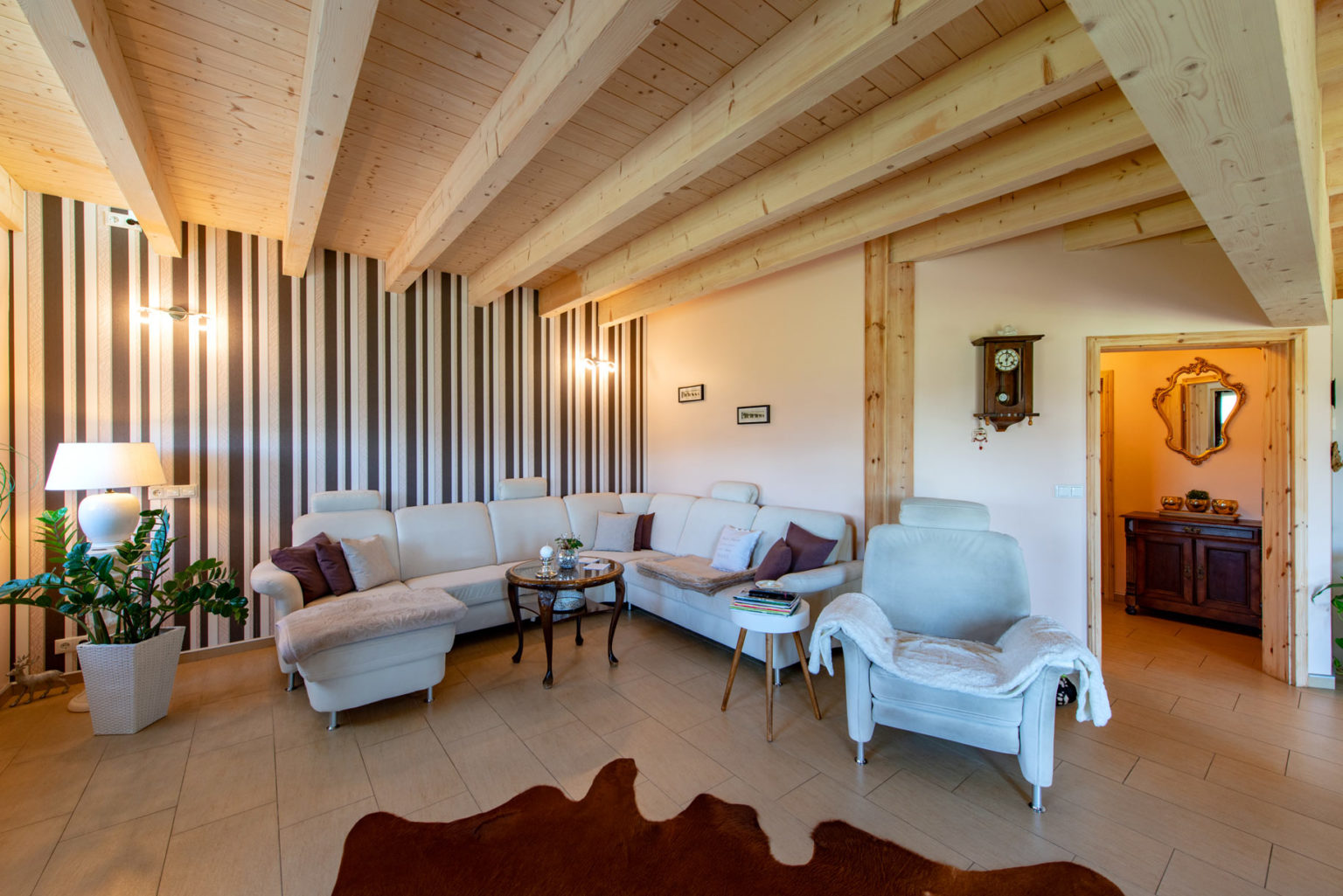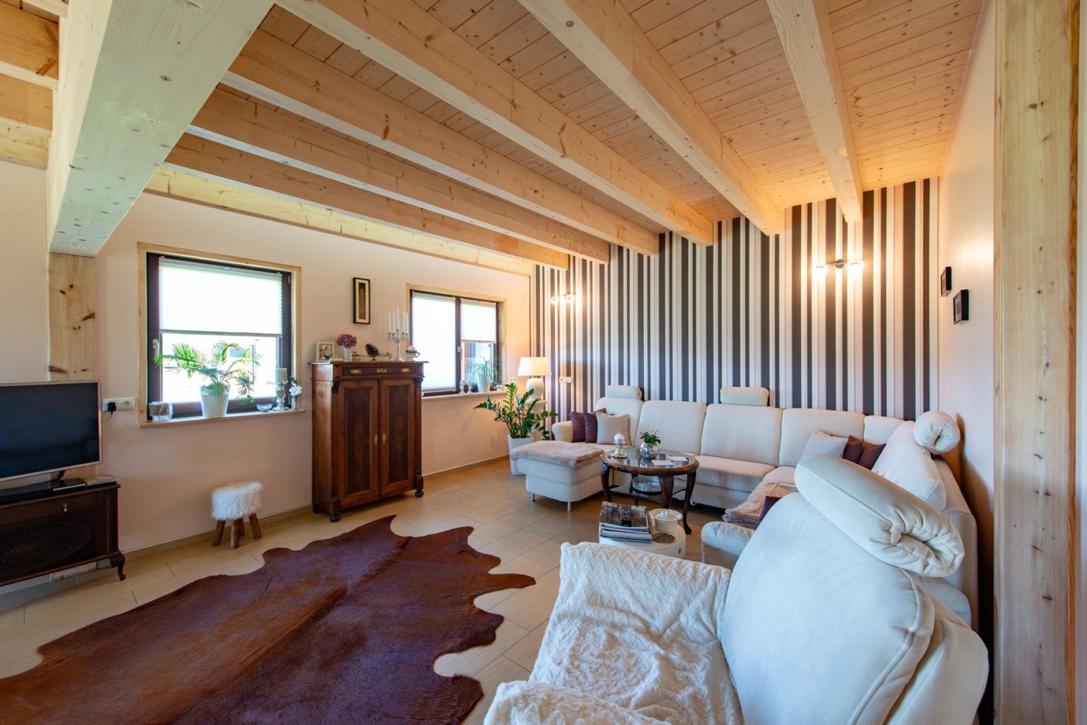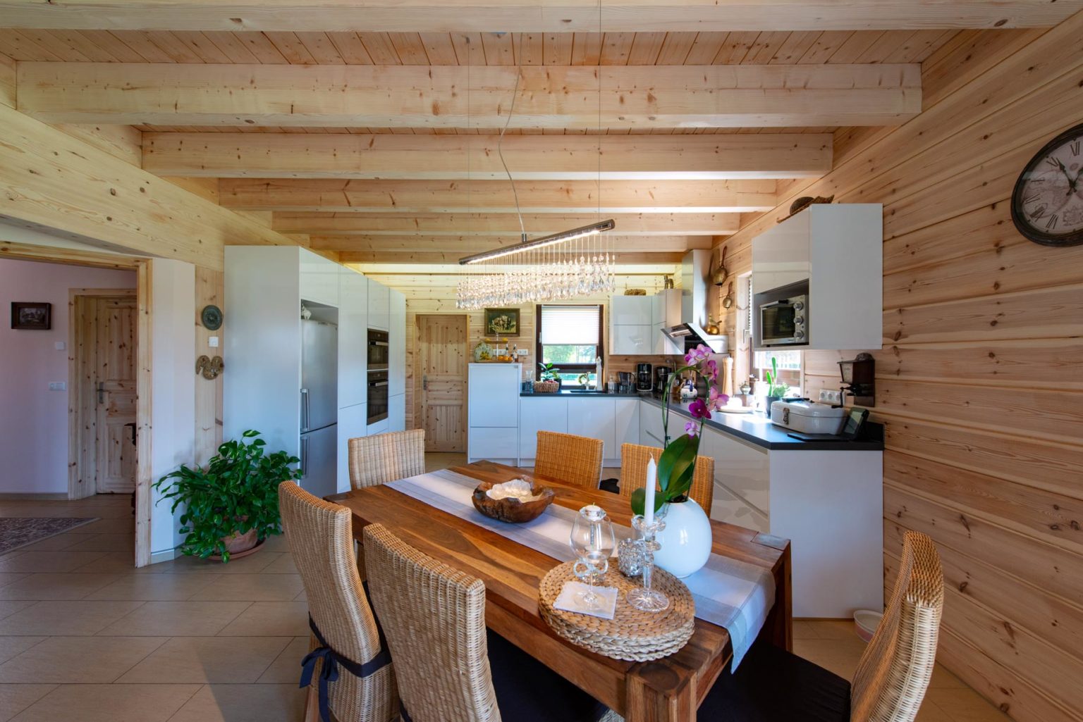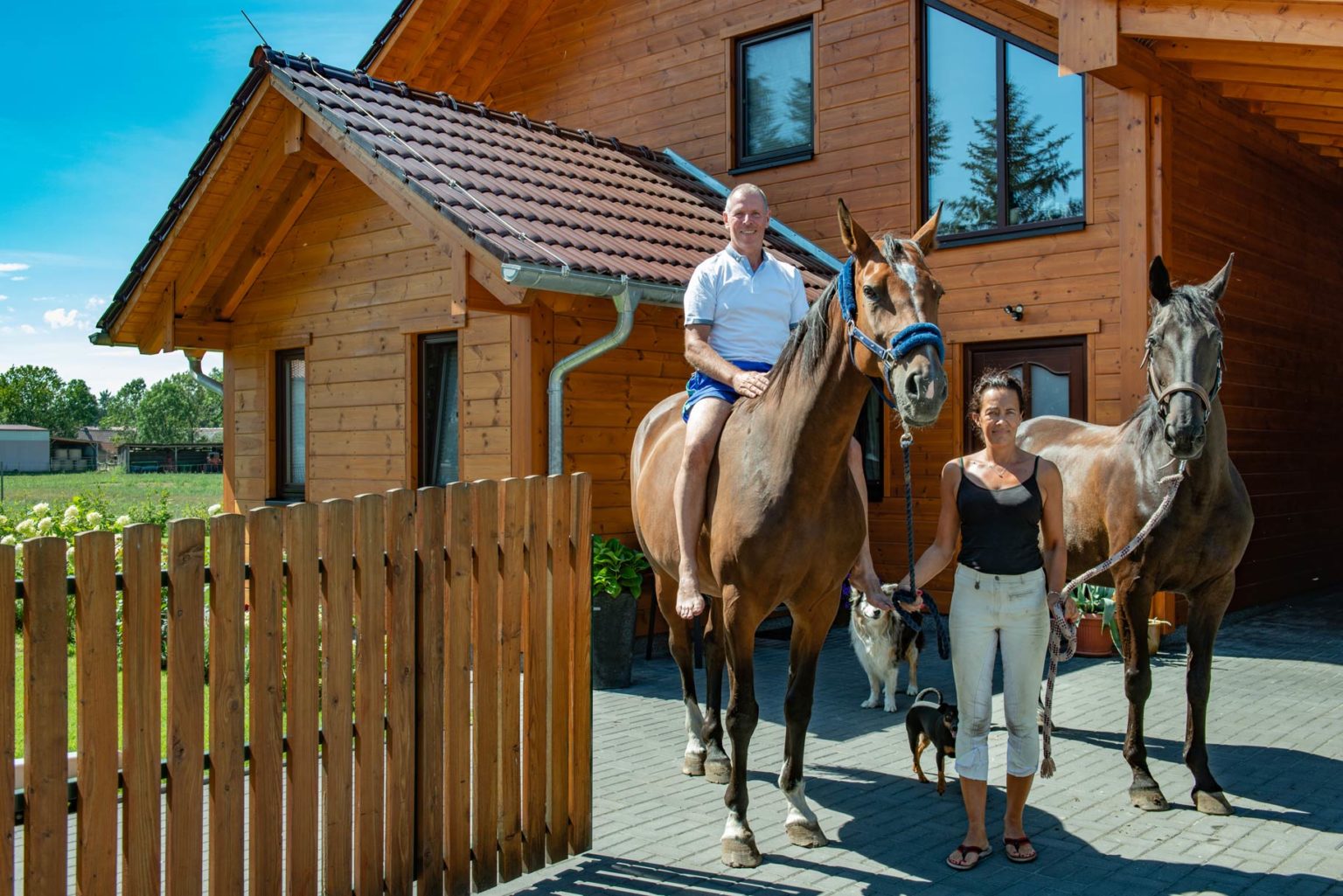 Zusammen mit Familie und Freunden hat der Hauseigentümer Holzhaus „Rösserwiesen“ im Rahmen einer „Richtmeistermontage“ selbst gebaut. Heizung/Sanitär, Elektrik, Dacheindeckung und Fliesen hat er dann von befreundeten Fachhandwerksfirmen machen lassen und dabei immer mitgeholfen, wo er konnte. „Es hat eineinhalb Jahre gedauert, bis wirklich alles fertig war. Miteingerechnet sind da die Vorarbeiten bis zur Hausanlieferung. Eingezogen sind wir aber schon sechs Monate nach Baubeginn, als das Erdgeschoss fertig ausgebaut war.“, erinnert sich die Hausherrin. Zwischenzeitlich wohnte das Ehepaar in einem Container auf dem Baugrundstück, was sehr praktisch war, und hatte auch die Möbel in einem Container zwischengelagert. An den weitläufigen Garten angrenzend, leben die Pferde von Ralf und Kamila Hensel. „Es ist ein Traum für Reiter mit den eigenen Pferden zusammen zu leben, noch dazu mitten in einem herrlichen Ausreitgebiet. Die Krönung ist aber unser Holzhaus, das für uns etwas ganz Besonderes ist und genau unseren Traumvorstellungen entspricht.“, äußert Ralf dankbar. Im Dachgeschoss wählte er eine Balkenlage mehr als bei Fullwood üblich ist, um den Kniestock zu erhöhen. Während die Holzwände außen mit einem warmen, vor Vergrauung schützenden Farbton lasiert wurden, erhielten sie innen lediglich eine UV-Schutzlasur, die vor natürlichem Nachdunkeln durch Sonneneinstrahlung bewahrt. Auch die Sichtbalkendecken bleiben dank des UV-Schutzes naturhell.