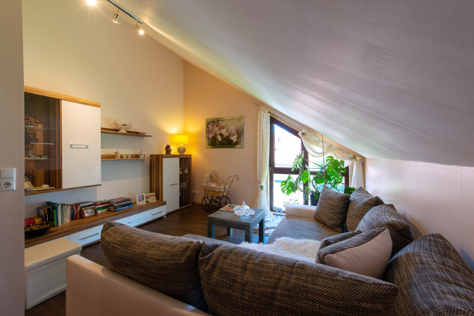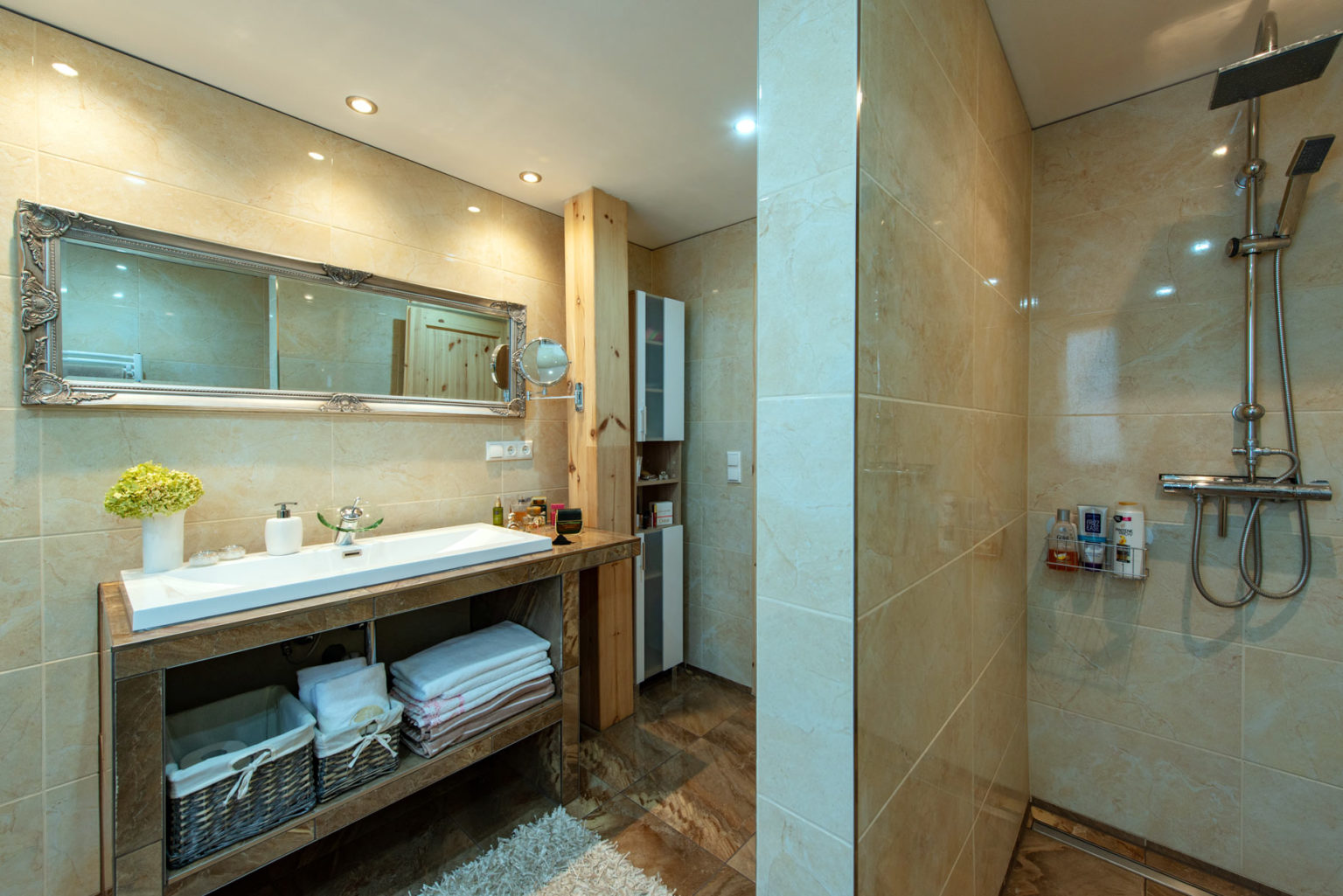 Bis auf die dunklen Holzfenster ist alles sehr hell gehalten in Holzhaus „Rösserwiesen“: pflegeleichte, sandfarbene Bodenfliesen im Erdgeschoss – „sehr praktisch, wegen der Hunde.“ – ; fußwarme Korkböden im Dachgeschoss; weiß oder sanft abgetönt gestrichene Wände und Dachschrägen; Zimmertüren aus hellem Kiefernholz sowie eine Geschosstreppe aus hellem Holz und transparentem Edelstahlgeländer mit Holzhandlauf. Reichlich natürliches Licht fällt durch die vielen Fenster ins Haus um die Räume bei Tag zu belichten. Ansonsten sorgt überwiegend indirekte Beleuchtung für stimmungsvolles Licht am Abend. Dazu passend hat Kamila mit viel Sinn für Ästhetik und gutem Geschmack schicke Tapeten, moderne Landhausmöbel und Antiquitäten mit einer Prise „Bling-Bling“ gemixt. Ein edler und sehr behaglicher Landhausstil ist das Ergebnis. Aber nicht nur schön, sondern auch praktisch und alltagstauglich ist das Wohnen in dem Zweipersonenhaushalt. „Die Wandfarben sind abwaschbar, und wir haben eine sehr leise Staubsaugeranlage eingebaut. Es ist ein „Fernstaubsauger“, der nach außen führt. Wir haben drei Anschlüsse, je einen im Erdgeschoss und im Dachgeschoss sowie einen für draußen. Das Ganze ist sehr pflegeleicht.“, betont die Hausherrin. „Ein Vorteil von Fullwood war auch, dass wir in der Ausbauphase noch Änderungen vornehmen konnten. So haben wir uns spontan für eine schräge Wand im ansonsten offenen Wohnbereich entschieden und das geplante Gästezimmer zugunsten des Wohnbereichs einfach weggelassen.“, ergänzt Ralf Hensel.