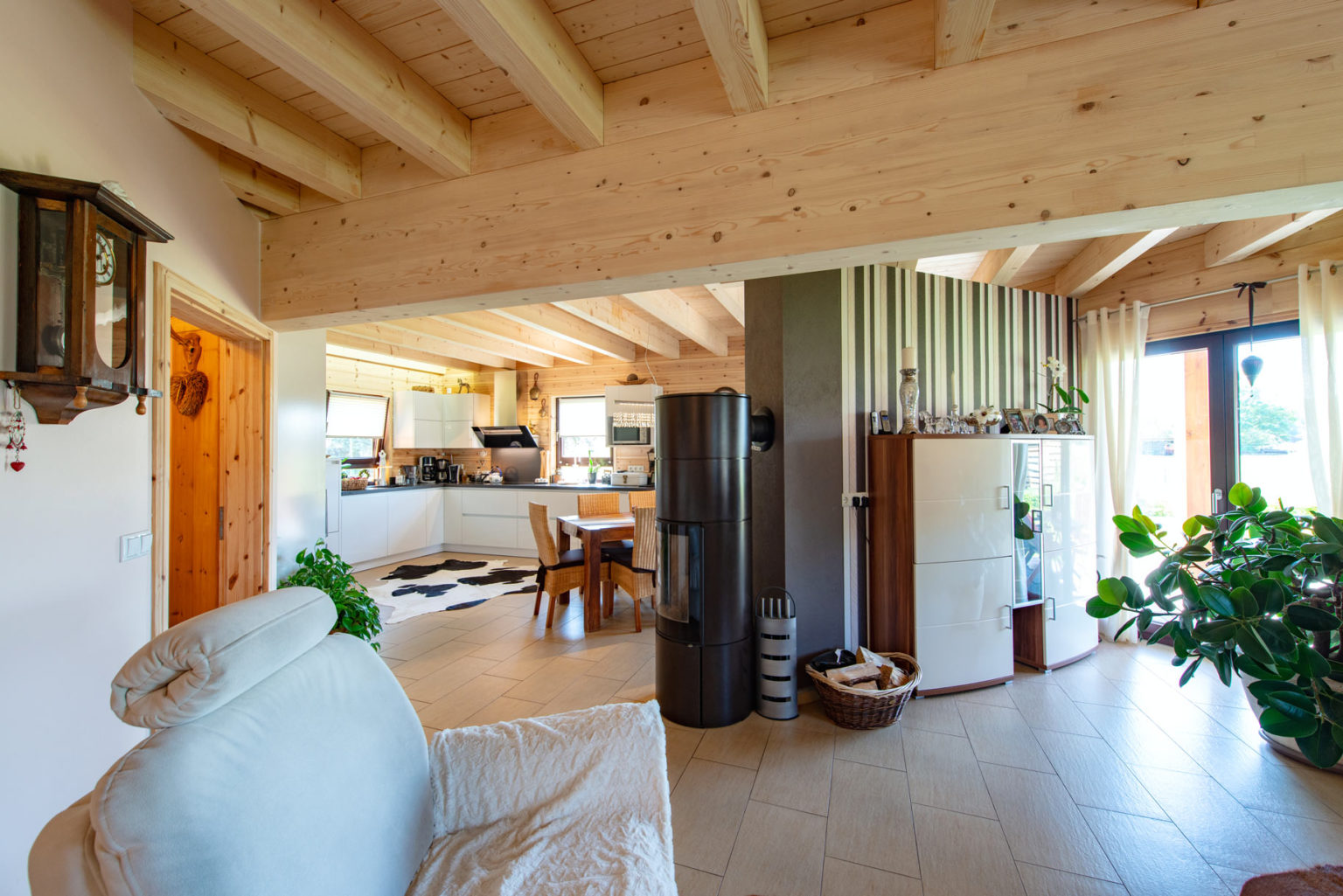 Holzhaus „Rösserwiesen“ besteht aus der soliden „Kombiblockwand“, die neben der massiven Blockbohle noch eine Kerndämmung und eine Installationsebene innehat. Die Wand besitzt einen besonders niedrigen U-Wert und dämmt, wie ihre „Schwester“, die einschalige Blockwand von Fullwood, hervorragend. „Wir haben uns für eine ökologische Papierdämmung entschieden, sowohl für die Wand als auch fürs Dach. Das Material besteht aus nicht brennbaren Flocken und wird einfach eingeblasen.“, erklärt Kamila Hensel. Besonders für Bauherren, die gerne so viel als möglich selbst beim Ausbau machen möchten, und drinnen nicht nur die Trennwände sondern auch manche tragende Außenwand nicht in Holzoptik wünschen, ist die „Kombiblockwand“ besonders geeignet. „Das Kiefernholz der Wände und Balkendecken etc. ist schadstofffrei und stammt aus nachhaltiger Forstwirtschaft.“, zählt der Hausherr die ökologischen Vorteile seines Holzhauses weiter auf. Zudem setzt er auf solare Warmwasserbereitung, auch für die installierte Fußbodenheizung, und einen wasserführenden Kaminofen. Vorsichtshalber gibt es noch eine konservative Gastherme, die aber mit 19€ Kosten im Monat eine sehr untergeordnete Rolle spielt. „Unser Holzhaus ist sehr energiesparsam! Außerdem haben wir einen sehr guten Schallschutz darin.“, freut sich die Dame des Hauses. Ergänzt wird das Ressourcen schonende und regenerative Energiekonzept von einer Regenwasserzisterne, die Waschmaschine und WC speist, sowie einem Brunnen zur Gartenbewässerung. „Eine Biologische Kläranlage im Pflanzenbeet haben wir auch noch, die Wartungskosten betragen nur 120€ einmal im Jahr.“, sagt Ralf Hensel. So wurde der Plan, ein echtes Ökohaus zu bauen, zur Realität.