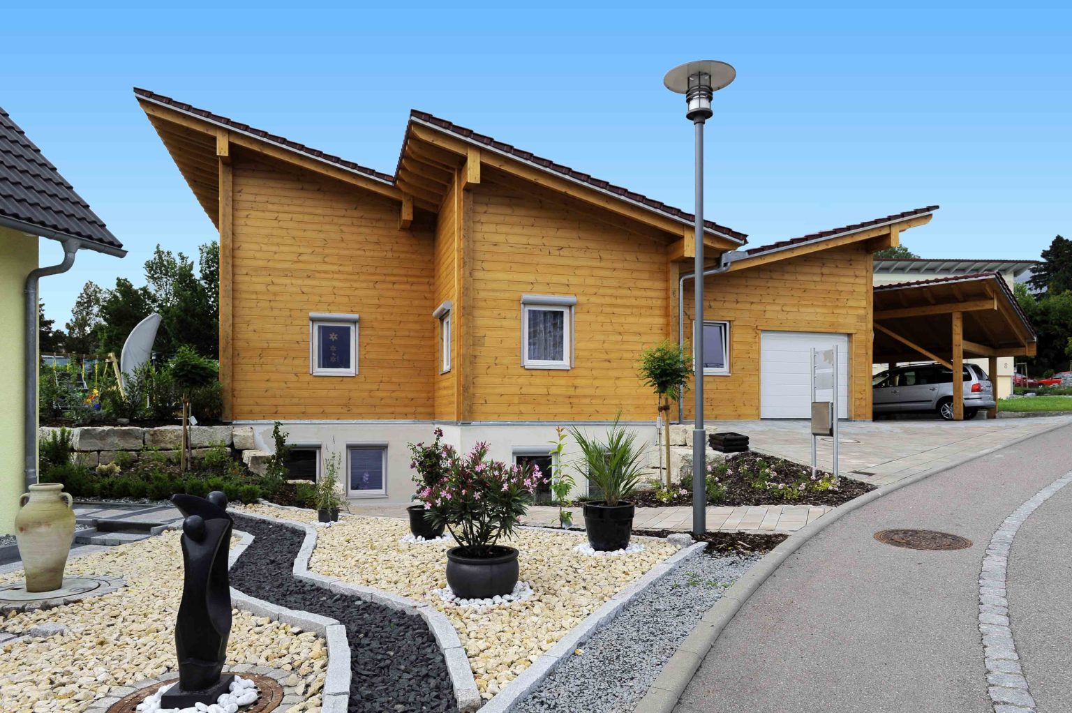 Das weit überstehende Pultdach von Holzhaus „Rosenberg“ schirmt zur Wetterseite ab und öffnet sich mit hoher, großflächig verglaster Hausfassade der Sonne. Klare, gerade Linien bestimmen das Haus, ohne es langweilig oder klobig wirken zu lassen.